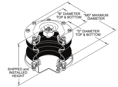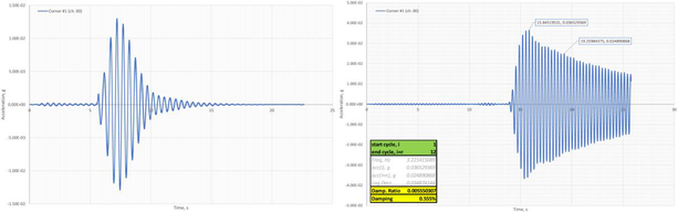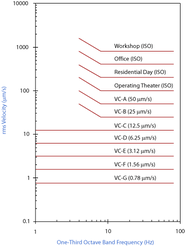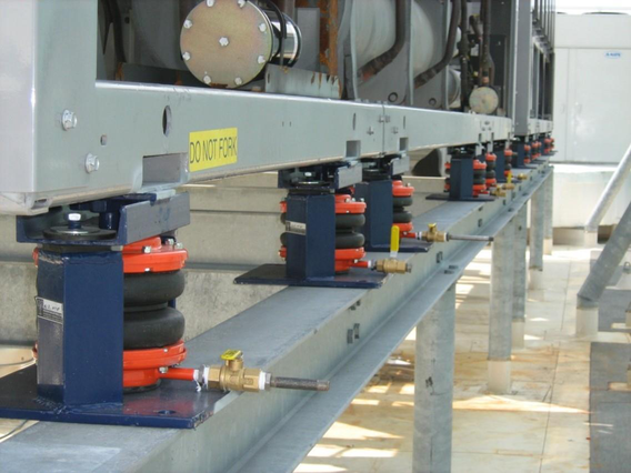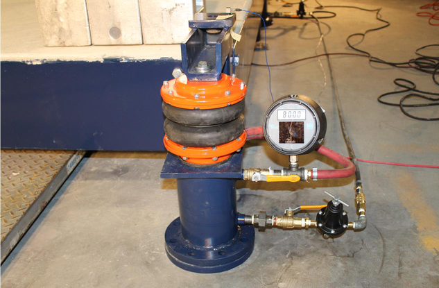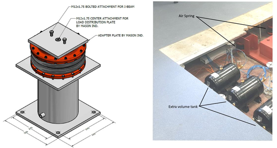 A A A Volume : 43 Part : 1 Proceedings of the Institute of Acoustics A QUANTITATIVE METHOD OF ISOLATING SENSITIVE EQUIPMENT USING AIR Adam Fox CEng MIMechE AMIOA, Mason U.K. Ltd. 1 INTRODUCTION It is desirable and convenient to place scientific, health and education facilities close to urban areas so that they are easier to access. This brings problems in terms of proximity to ground-borne vibration sources such as local transportation. Furthermore, the cost of land and construction can force placement of sensitive facilities on suspended and lightweight structural elements. This paper discusses the available methods of achieving effective isolation. For the most challenging locations, air isolation offers extremely high performance but this is difficult to quantify for a very low vibration criterion. This reality adds risk to high-value installations where air springs are typically specified. This paper therefore presents the typical calculation method but also the result of physical testing designed to validate the calculation method, in order to provide more certainty for future projects. The calculation method was used to support the design of a presented case study, where an electron microscope was installed on air springs to isolate against local rail vibration. 2 OVERVIEW OF TYPICAL SENSITIVE EQUIPMENT Typical vibration sensitive equipment would be electron microscopes, nanotechnology applications, precision manufacturing such as microprocessors and magnetic resonance imaging machines. It is always ideal to location such equipment in a robust structure far from any problematic vibration source such as road and rail traffic, but this is not always possible due to the desire to have an urban location for ease of access. A further factor is that many buildings are multi-purpose so it is not cost- effective to design around one piece of equipment. There is also the need to consider futureproofing as many research buildings have a legacy aspect. Because introducing a robust isolation system can have a major space requirement, it is not viable to retrospectively install. It is therefore desirable to install a system which will offer a flexible space for possible future equipment. 3 TYPICAL CRITERIA Vibration criterion curves (Figure 1) are the most common method of specifying a suitable environment. Equipment manufacturers typically set the required level following discussion with the end user since, for example, the intended magnification level can dictate the sensitivity to vibration. Vol. 43. Pt. 1. 2021 Proceedings of the Institute of Acoustics Figure 1 – Vibration Criterion curves The influence of the supporting structure falls outside the scope of this paper but it is exceptionally important that this be taken into account along with internal vibration sources such as footfall. The specifying consultant, via modelling or site measurement, establishes if the desired VC curve will be exceeded at any point of the spectrum. The vibration equipment supplier can use this information to determine what practical isolation measures will be required. For minor exceedances tending towards 100Hz, conventional isolation measures such as elastomeric or helical spring may be suitable. But, either due to a combination of resonance modes inherent in elastomeric and spring isolators or because sub-10Hz energy needs to be isolated, air springs are typically necessary for the more demanding VC curves. Vol. 43. Pt. 1. 2021 Proceedings of the Institute of Acoustics 4 AIR ISOLATION SYSTEMS Fundamentally, air springs are a elastomeric bellows which hold pressurised gas, typically nitrogen, to reduce leak risk. The physical size of the air spring and the internal pressure provides a capacity to support load, so equipment is supported on columns of air (example in Figure 2) Figure 2 – Example of air spring supported equipment A series of values are used to feed or vent air from each air bag to level. The system is self-levelling and due to the use of valves introducing a damping effect there are two major benefits: 1. Very low support natural frequencies can be achieved: sub 2Hz. 2. Sub 2Hz can be achieved with a helical spring system but due to the large deflection required from a spring, the support system will be mobile and prone to excitation/resonant response. This is not the case with an air spring system as air springs do not have a significant resonant condition at any point in the spectrum. 5 FREQUENCY CALCULATION METHOD The principle natural frequency remains the main influence on overall performance and is the focus of this paper. Equation 1 and details illustrated in Figure 3 are used to determine the natural frequency of an air spring. It is important to note that this equation is designed around a mass supported by a column of air, analogous to a mass dropped into a frictionless cylinder. The dimensions of the cylinder and the nature of the gas inside affects with what frequency the mass will oscillate within. Vol. 43. Pt. 1. 2021 Proceedings of the Institute of Acoustics γ = Adiabatic gas constant (typically 1.4) P a = Pressure in cylinder (Pascal) C xa = Cross sectional area of cylinder (m 2 ) or average diameter of the air spring/tank. M = Mass on cylinder (kg) H = Height of cylinder containing air (m) " DIAMETER > "MD" MAXIMUM Top & BOTTOM “MO MeN “D" DIAMETER TOP & BOTTOM stppen and 8 | INSTALLED NeicHT Figure 3 – cut through of typical air spring (Mason Industries type MT) Because the height of the air column has a major influence, it is common to attach the air spring to a supplementary tank, which as shown in Figure 4 can either be incorporated into a support stanchion or by connection to a supplementary tank which can provide a more space-efficient arrangement. The photo is from an ultrasound equipment isolated base in Oxford. Figure 4 – air spring on hollow station (L) and remote tanks to save space (R) Vol. 43. Pt. 1. 2021 Proceedings of the Institute of Acoustics 6 FR