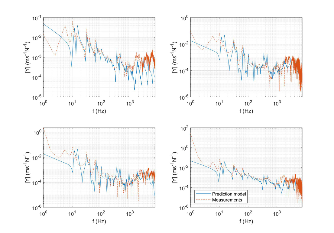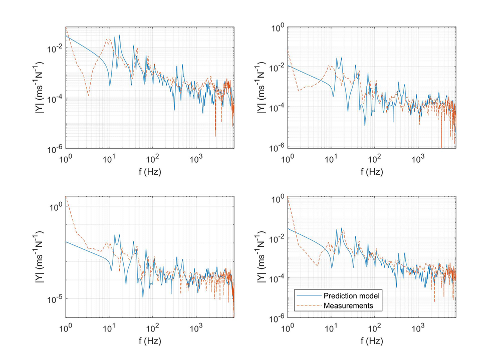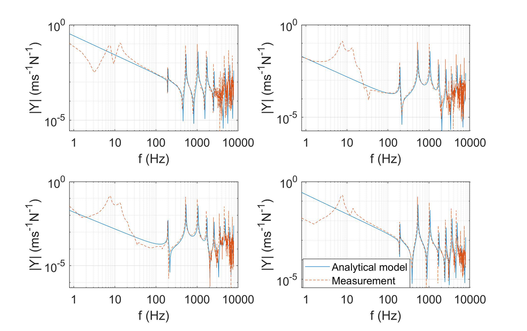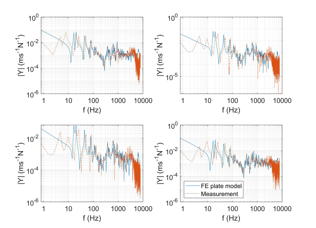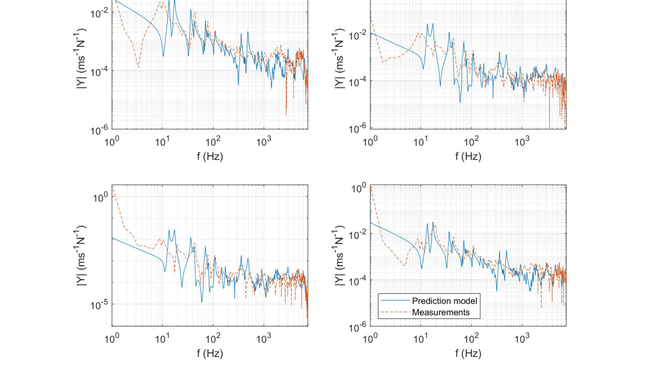 A A A Volume : 43 Part : 1 Proceedings of the Institute of Acoustics NOISY NEIGHBOURS: TOWARDS A HYBRID PREDICTION AND TESTING PROCESS FOR SOUND INSULATING PARTITIONS Gabriel Whittle iKoustic Soundproofing and the Acoustics Research Centre, University of Salford Andrew Elliott Acoustics Research Centre, University of Salford Joshua Meggitt Acoustics Research Centre, University of Salford Daniel Wong-McSweeney Acoustics Research Centre, University of Salford Rick Parsons iKoustic Soundproofing email: g.c.r.whittle@salford.ac.uk 1 INTRODUCTION There are numerous methods for characterising sound insulating and impact noise reducing compo- nents and systems, each with their own advantages and disadvantages. Two of the predominant mod- elling techniques for prediction of transmission loss through partitions are finite element analysis (FEA) and the transfer matrix method (TMM). FEA has the advantage that one can model the entire system, taking into account most of the degrees of freedom. However, this advantage makes the method more computationally expensive, especially in the high frequencies where the short wavelength dictates the length of computation, as identified in [ 1 ] . The TMM is useful for understanding how sound propagates through a medium and makes the addition of more layers to the model an easier task. There is an assumption of each layer as infinite, meaning that final results can be unreliable, as discussed in [ 2 ] . It is accepted that due to the distinct advantages and disadvantages inherent to each method, no one method is applicable for every system and across a broad frequency range. This paper is concerned with the creation of a method for characterising complex systems accurately with a view to creating a tool for optimisation of soundproofing technologies. A hybrid experimental-numerical method utilising a component-based approach is proposed. A sound insulation partition is split into its constituent elements and characterised as individual subsys- tems using various methods to gather the frequency response functions (FRFs). These FRFs are then coupled using substructure synthesis and compared with physical assembly measurements. Through this manner, more complex partitions can be modelled without the need for massive computational expense and the ability to amend properties of individual components within the system allows for optimisation of the partition. At each stage of the modelling process, the model is validated against comparable physical assemblies to ensure the efficacy of the process. Section 2 will introduce the methodology adopted, section 3 will offer validation to the models through comparison with measurements, and section 4 shows the results of the coupling process. 2 Methodology This paper is aiming to show that models of subsystems can be coupled together to find the overall FRFs of the entire system. This section will detail the creation of models for beams, plates, and the method chosen for coupling the models. The eventual outcome will involve a situation like the one shown in figure 1 . Vol. 43. Pt.1 2021 Proceedings of the Institute of Acoustics Figure 1: Coupling of components. 2.1 Mobility The first task in the creation of the hybrid method is identifying a method for characterising a compo- nent’s frequency response. The FRF which is most useful in this regard is mobility, which relates the input force ( F ) to the output velocity ( v ) in the equation: Equation 1 is formulated in [ 3 ] , where fundamental concepts in mobility and impedance are ex- plained. The means to discover the mobility of a component differs depending on the complexity of the shape. In this paper, the data will generally be presented as a mobility matrix, where the diagonal entries to a 2 × 2 matrix represent point mobilities and the off diagonals represent transfer mobilities: Although mobility is the predominant FRF discussed throughout this paper, impedance will also be utilised extensively, where the impedance is the inverse of the mobility, demonstrated in the equation: 2.2 Identifying and characterising individual components A full sound insulation partition involves many parts which can be analysed individually. Finding a valid method to characterise these individual elements is important in the construction of the final prediction model. This section discusses the different components. 2.2.1 Beams Integral to the construction of plasterboard partitions is a timber stud frame, where the individual studs are characterised as beams. The shape of a beam means that bending waves along the beam’s primary axis are the predominant modes of deflection, allowing for creation of a simpler model. In the Vol. 43. Pt.1 2021 Plasterboard Plasterboard Proceedings of the Institute of Acoustics PhD thesis [ 4 ] , the closed form analytical equations for beams with different boundary equations are given. For this model, only beams with a free-free boundary condition are considered. For each material used within the beam model, the structural properties of Young’s modulus, den- sity, poisson’s ratio, and damping loss factor need to be known to get a representative result against measurements. The precise, analytical nature of the beam model means it is possible to use it to find some structural properties of materials. This is achieved by cutting the material into a beam-like structure and updating the model to the measurements by amending the structural properties. 2.2.2 Plates Wall partition constructions will involve board-like structures like plasterboard which are screwed into the stud frame. These can be represented as plates, which due to their shape are more complicated to model than beams because of the wave interaction across the surface. The method chosen to find the FRFs of a plate is the finite element method. The mass and stiffness matrices, discovered using the PDE package [ 5 ] for MATLAB, are combined to create a modal summation model. This method is 