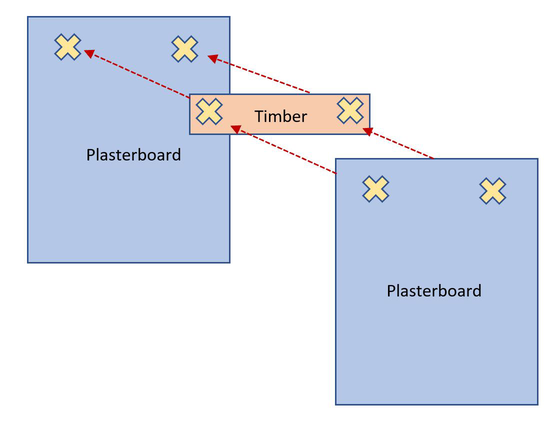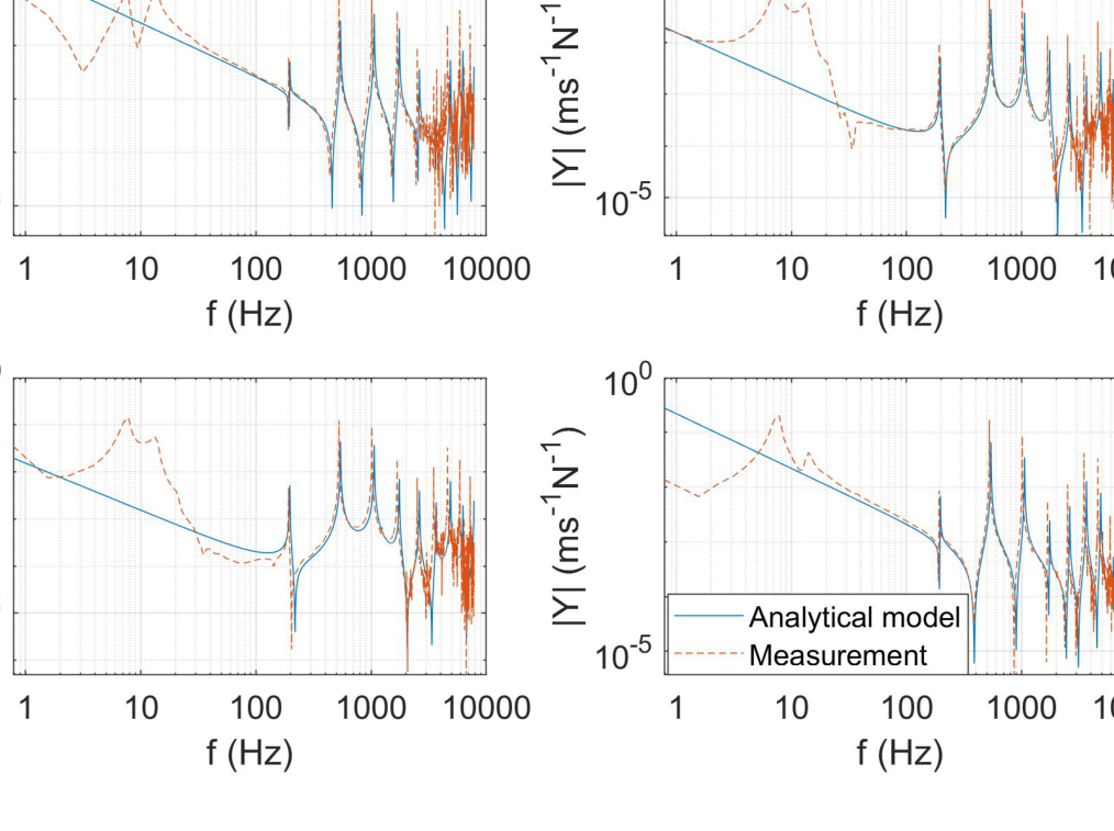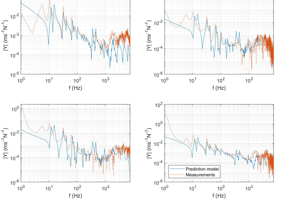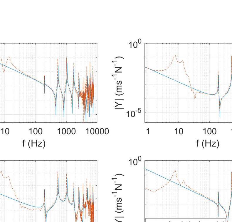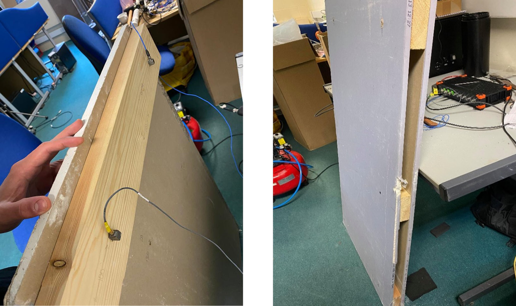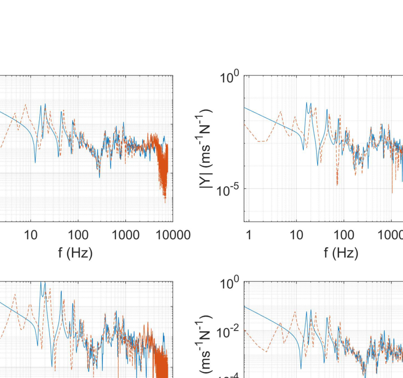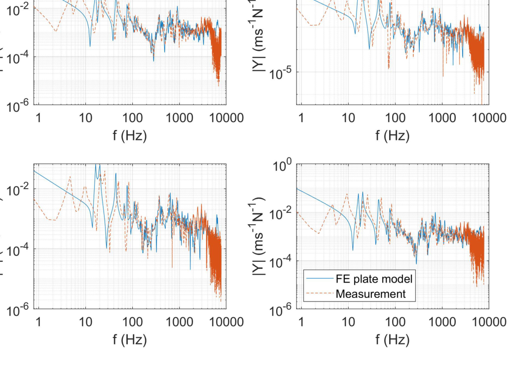 A A A Volume : 43 Part : 1 Proceedings of the Institute of Acoustics NOISY NEIGHBOURS: TOWARDS A HYBRID PREDICTION AND TESTING PROCESS FOR SOUND INSULATING PARTITIONS Gabriel Whittle iKoustic Soundproofing and the Acoustics Research Centre, University of Salford Andrew Elliott Acoustics Research Centre, University of Salford Joshua Meggitt Acoustics Research Centre, University of Salford Daniel Wong-McSweeney Acoustics Research Centre, University of Salford Rick Parsons iKoustic Soundproofing email: g.c.r.whittle@salford.ac.uk 1 INTRODUCTION There are numerous methods for characterising sound insulating and impact noise reducing compo- nents and systems, each with their own advantages and disadvantages. Two of the predominant mod- elling techniques for prediction of transmission loss through partitions are finite element analysis (FEA) and the transfer matrix method (TMM). FEA has the advantage that one can model the entire system, taking into account most of the degrees of freedom. However, this advantage makes the method more computationally expensive, especially in the high frequencies where the short wavelength dictates the length of computation, as identified in [ 1 ] . The TMM is useful for understanding how sound propagates through a medium and makes the addition of more layers to the model an easier task. There is an assumption of each layer as infinite, meaning that final results can be unreliable, as discussed in [ 2 ] . It is accepted that due to the distinct advantages and disadvantages inherent to each method, no one method is applicable for every system and across a broad frequency range. This paper is concerned with the creation of a method for characterising complex systems accurately with a view to creating a tool for optimisation of soundproofing technologies. A hybrid experimental-numerical method utilising a component-based approach is proposed. A sound insulation partition is split into its constituent elements and characterised as individual subsys- tems using various methods to gather the frequency response functions (FRFs). These FRFs are then coupled using substructure synthesis and compared with physical assembly measurements. Through this manner, more complex partitions can be modelled without the need for massive computational expense and the ability to amend properties of individual components within the system allows for optimisation of the partition. At each stage of the modelling process, the model is validated against comparable physical assemblies to ensure the efficacy of the process. Section 2 will introduce the methodology adopted, section 3 will offer validation to the models through comparison with measurements, and section 4 shows the results of the coupling process. 2 Methodology This paper is aiming to show that models of subsystems can be coupled together to find the overall FRFs of the entire system. This section will detail the creation of models for beams, plates, and the method chosen for coupling the models. The eventual outcome will involve a situation like the one shown in figure 1 . Vol. 43. Pt.1 2021 Proceedings of the Institute of Acoustics Figure 1: Coupling of components. 2.1 Mobility The first task in the creation of the hybrid method is identifying a method for characterising a compo- nent’s frequency response. The FRF which is most useful in this regard is mobility, which relates the input force ( F ) to the output velocity ( v ) in the equation: Equation 1 is formulated in [ 3 ] , where fundamental concepts in mobility and impedance are ex- plained. The means to discover the mobility of a component differs depending on the complexity of the shape. In this paper, the data will generally be presented as a mobility matrix, where the diagonal entries to a 2 × 2 matrix represent point mobilities and the off diagonals represent transfer mobilities: Although mobility is the predominant FRF discussed throughout this paper, impedance will also be utilised extensively, where the impedance is the inverse of the mobility, demonstrated in the equation: 2.2 Identifying and characterising individual components A full sound insulation partition involves many parts which can be analysed individually. Finding a valid method to characterise these individual elements is important in the construction of the final prediction model. This section discusses the different components. 2.2.1 Beams Integral to the construction of plasterboard partitions is a timber stud frame, where the individual studs are characterised as beams. The shape of a beam means that bending waves along the beam’s primary axis are the predominant modes of deflection, allowing for creation of a simpler model. In the Vol. 43. Pt.1 2021 Plasterboard Plasterboard Proceedings of the Institute of Acoustics PhD thesis [ 4 ] , the closed form analytical equations for beams with different boundary equations are given. For this model, only beams with a free-free boundary condition are considered. For each material used within the beam model, the structural properties of Young’s modulus, den- sity, poisson’s ratio, and damping loss factor need to be known to get a representative result against measurements. The precise, analytical nature of the beam model means it is possible to use it to find some structural properties of materials. This is achieved by cutting the material into a beam-like structure and updating the model to the measurements by amending the structural properties. 2.2.2 Plates Wall partition constructions will involve board-like structures like plasterboard which are screwed into the stud frame. These can be represented as plates, which due to their shape are more complicated to model than beams because of the wave interaction across the surface. The method chosen to find the FRFs of a plate is the finite element method. The mass and stiffness matrices, discovered using the PDE package [ 5 ] for MATLAB, are combined to create a modal summation model. This method is 