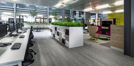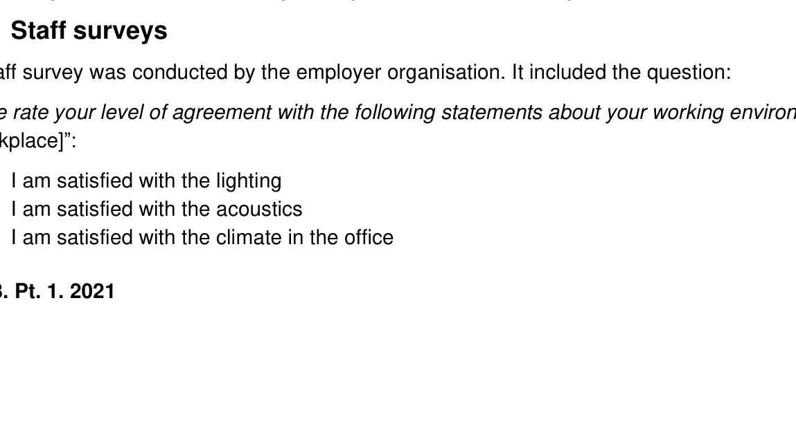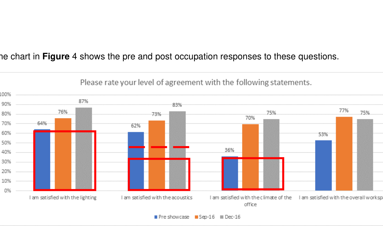 A A A Volume : 43 Part : 1 Proceedings of the Institute of Acoustics THE VALUE OF CONTROL FOR ACOUSTIC SATISFACTION IN OPEN PLAN OFFICES: A CASE STUDY J Harvie-Clark Apex Acoustics Ltd. jack.harvie-clark@apexacoustics.co.uk R Hinton Apex Acoustics Ltd ABSTRACT Acoustic conditions were investigated on two different floor plate designs within an organisation’s building. One is a traditional layout, with assigned desks arranged in rows. The other is a complete re-design for activity-based working (ABW), with a variety of work settings, without assigned places. Both floor plates have the same ceiling, lighting, flooring, facade, and HVAC systems; both floor plates are open to the same central atrium. The organisation’s staff surveys demonstrate a significant improvement in satisfaction with environmental conditions for thermal comfort, lighting, and acoustics for people on the ABW floorplate. This study investigated the acoustic conditions on the two different floor plates. Measurements of the room acoustics were conducted according to ISO 3382-3, revealing very similar indicators. Occupied acoustic measurements demonstrate that the in-situ acoustic environment is also similar between the two designs. The improvement in satisfaction with the acoustic conditions is ascribed to the increased personal control that people have over their work environment; this is explored through interviews. Acoustic satisfaction, environmental comfort and a sense of control are all positively correlated with productivity at work. 1. BACKGROUND A programme of transformation took place over a number of years at a large office complex. A new approach to workplace strategy went hand in hand with a redesigned floor plate and new IT provisions for staff. Both floor plates have the same ceiling, lighting, flooring, facade, and HVAC systems; both floor plates are open to the same central atrium. People working on the traditional floor plates had fixed, assigned desks; on the new floor plate, they had no assigned spaces. Repeated satisfaction surveys were used to evaluate the success or otherwise of the redesigned space. The traditional layout is illustrated in Figure 1. There are 130 assigned workstations arranged perpendicular to the façade, as shown in Figure 5. There is a small number of meeting rooms at the ends of the floor plate, the number varying between locations (not shown in Figure 5). The new redesigned layout is illustrated in Figure 2 and Figure 3. The provision is for 100 desk spaces and 80 alternative work settings. The layout is shown in Figure 6, and accommodates more people than the traditional layout. Vol. 43. Pt. 1. 2021 Proceedings of the Institute of Acoustics Figure 1: The traditional layout Figure 2: The new, redesigned layout (view A), courtesy of Ward Robinson Figure 3: The new, redesigned layout (view B), courtesy of Ward Robinson 1.1 Staff surveys The staff survey was conducted by the employer organisation. It included the question: “ Please rate your level of agreement with the following statements about your working environment at [workplace]”: • I am satisfied with the lighting • I am satisfied with the acoustics • I am satisfied with the climate in the office Vol. 43. Pt. 1. 2021 Proceedings of the Institute of Acoustics The chart in Figure 4 shows the pre and post occupation responses to these questions. Figure 4: Results of pre- and post- showcase (new) floorplate occupation. Red boxes and lines represent global average response from the Leesman Index for comparison. On the new floorplate, after sufficient time to acclimatise, the level of acoustic satisfaction is recorded as 83%. This is a remarkable achievement, and may be compared with the Leesman Index [1] question “How satisfied are you with noise levels”. The Leesman Index has over 800,000 responses with an average satisfaction of 32 %, as shown in the red box overlaid in Figure 1. High- performing workplaces achieve the Leesman+ certification, where satisfaction with noise levels is 45 % globally (shown with a dashed line in Figure 1). There may be a difference in the way people respond to a question about “acoustics” rather than “noise levels”. Haapakangas [2] has shown there is a high level of correlation between being “disturbed by noise” and “disturbed by speech”, whereas the term “acoustics” may be interpreted to mean different things. As a result of the success of the new design, Apex Acoustics was commissioned to undertake measurements to benchmark and review the acoustic conditions within the traditional and new office floorplates. The aspiration was that these measurements would reveal a measurable difference, and that the acoustic parameters of the new floor plate could be encapsulated in the brand standard design guidance, such that the level of satisfaction could be replicated with different physical layouts and design solutions. To this end, a survey scope was determined to include both occupied and unoccupied measurements. 2. COMPARING THE MEASURED CHARACTERISTICS The details of the measurements are presented in Appendix A. The measured indicators, in both empty, unoccupied offices, and when occupied, do not reveal differences of any significance between the two floor plates, despite the significantly different appearance and furnishing. This result is actually also consistent with lighting and thermal comfort – none of those physical characteristics were changed in the new office layout. How could the remarkable differences in employee experiences be understood, when the physical environment had not changed? Vol. 43. Pt. 1. 2021 auunseayaad Please rate your level of agreement with the folowing statements. Proceedings of the Institute of Acoustics 2.1 Interview with new floorplate leader Following the presentation of the measured results to the management team, we met with the person responsible for the new ways of working. She explained how they had tried not to label spac