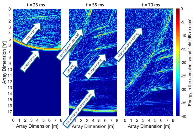 A A A Volume : 43 Part : 1 Proceedings of the Institute of Acoustics NEWS FROM ROOM ACOUSTICS M Vorländer Institute for Hearing Technology and Acoustics, RWTH Aachen University, Germany 1 INTRODUCTION Room acoustics is an established field with exciting connections to architecture and music. Efficient planning tools are available. Experience with solutions for various applications is the basis for daily work in acoustic consulting. Finally, room acoustic planning and consulting is a fairly straightforward process. This statement is true if one considers the elementary design rules and the creation of acceptable room acoustic conditions. In rooms for speech and music, however, acceptable acoustic conditions do not always exist because standards and guidelines of room acoustics are not sufficiently taken into account. In ISO 3382 [1] we find definitions and guidelines for the measurement and interpretation of room acoustic quantities. In famous textbooks, the best known by Beranek [2] and by Barron [3], we find a large amount of data from concert halls and opera houses, and these data give target values and tolerance ranges for successful acoustic designs. In this article, it is briefly summarised and updated the information about the history of room acoustics, revisited the state of the art, and discussed open research questions (see also [4]). These relate to the cross-disciplinary exploration of classical room acoustics with psychoacoustics and array signal processing. 2 A BRIEF HISTORY OF ROOM ACOUSTICS Wallace Clement Sabine created the first scientific approach to understanding the acoustics of performance spaces. His famous "Collected Papers" [5] form the basis for the room acoustics we are still using today. The relationship between reverberation, volume and absorption was clarified and explained empirically. A little later, in the 1930s, Norris [6] and Eyring [7] presented a theory with more correct factors in the equations, known today, of course, as the reverberation equations of Sabine and of Eyring. After that, the "fine structure of reverberation" became the focus of interest. In the first edition of his book [8], in 1948, Lothar Cremer illustrated sound reflections using geometric constructions of rays and image source, a methodology that is still one of the standard methods in room acoustics today. He already recognised the importance of reflections, their arrival series, their density and their global late decay. With these findings and the availability of instruments for measuring impulse responses, acoustic consulting was put on a scientific footing. From the 1950s onwards, consultancies could rely on a deeper understanding of sound fields and advise architects accordingly. But still the specific subjective effects in impulse responses were in the dark. 2.1 Impulse responses The physical aspects of room acoustics were first studied in the 1950s. The subjective impressions were related to the physical properties of the room impulse responses. One of the first observations regarding early reflections was made in 1952 by Rolf Thiele [9], who established the basis for the Vol. 43. Pt. 1. 2021 Proceedings of the Institute of Acoustics objective description of the ratio of early to late energy ("clarity"). This finally became possible with the availability of multi-channel loudspeaker systems in anechoic chambers. Today we consider the concept of early decay also to be well understood. This knowledge came from Vilhelm Jordan [10], who discovered the relationship between reverberation and subjective reverberance. In addition, studies on the correlation of subjective impressions and objective parameters were carried out during this period. Numerous publications originate from the research groups around Erwin Meyer (Göttingen), Walter Reichardt (Dresden) and Lothar Cremer (Berlin). In Göttingen, Manfred Schroeder contributed to room acoustics with two very famous studies, one on the statistics of frequency curves [11] (also [12], with Heinrich Kuttruff), and one on the integrated impulse response method [13]. With these pioneering works, room acoustics was clearly removed from the influence of black magic. In the following years, the defined quantities were tested in laboratory environments and applied in measurements in halls. 2.2 Spatial impression By the early 1970s, many modern concepts for "good" room acoustics related to classical music performances, operas and theatre had been proven in theory and accepted as best practice. However, at that time many halls were designed with modern architecture and construction. The use of open concrete, mostly large flat and smooth surfaces, large and wide halls, especially fan-shaped halls, was favoured. And some of these halls had bad reviews, although reverberation time, sound level and clarity were in the right order of magnitude. James West [14] noted in 1966 that acoustically good concert halls (Musikvereinssaal Vienna and Boston Symphony Hall) had a low width-to-height ratio. In 1968, Harold Marshall [15] confirmed that the spatial impression is created by side wall reflections, which are particularly strong in narrow halls. In the early 1970s, Michael Barron [16] in Southampton (1971) and Peter Damaske and Yoishi Ando [17] in Göttingen (1972) found that the importance of side reflections had been underestimated. They pointed out the importance of the early lateral reflections for the spatial impression. They influence the accuracy of source localisation and give the impression of diffuse sound incidence. Even today, the spatial impression is among the most interesting components of multidimensional listening in rooms ("auditory awareness"). The fan-shaped hall indeed shows a lack of early side sound. One consequence was to incorporate side walls with sloping segments or terraces or vineyards to split side wall reflections and direct them laterally to the audience. 2.3 Best practice in room acoustic design After the 1970s, acou