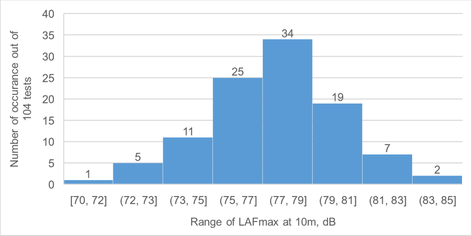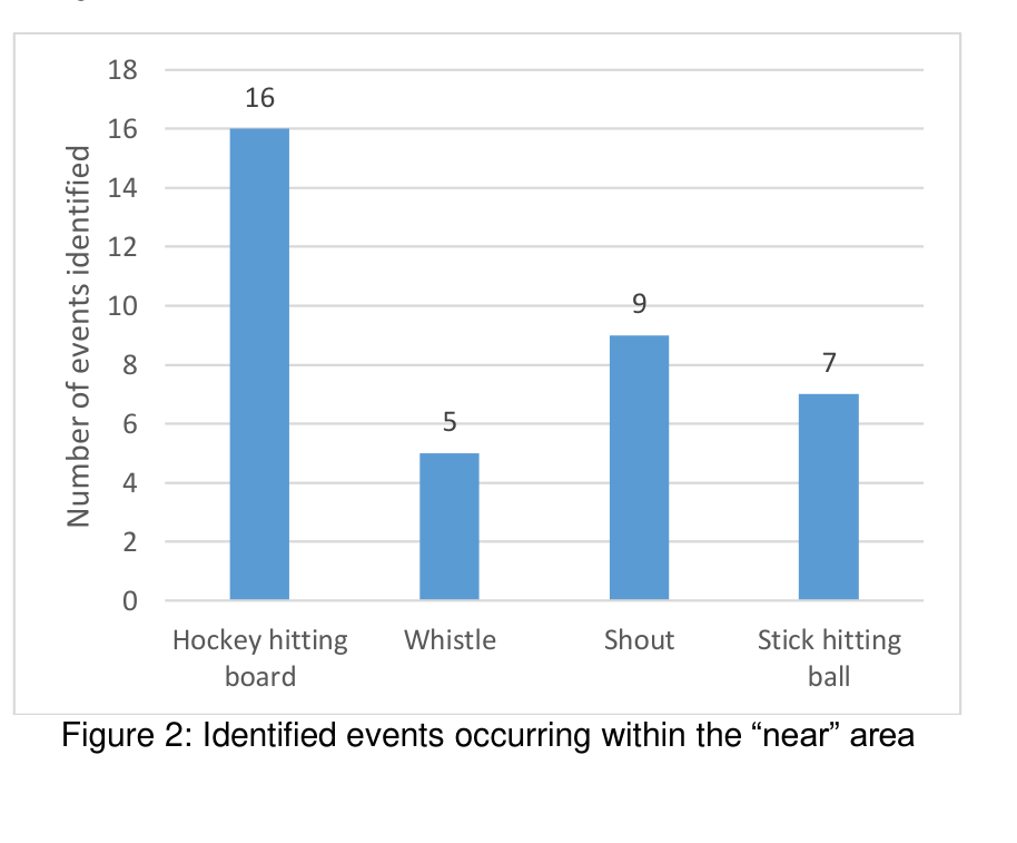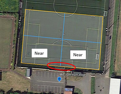 A A A Volume : 43 Part : 1 Proceedings of the Institute of Acoustics MAX NOISE LEVELS FROM HOCKEY PITCHES Weigang Wei Apex Acoustics Limited, Gateshead, UK J Harvie-Clark Apex Acoustics Limited, Gateshead, UK 1 ABSTRACT A field measurement and a controlled measurement were carried out to quantify the maximum noise levels from hockey pitches. The main noise sources during a hockey match include hockey balls hitting perimeter boards, whistle blows, shouting, and hockey sticks striking the ball. The most significant noise source is the hockey balls hitting perimeter boards. Based on the measurements, it is found that 1) the typical sound power level for maximum sound, L AFmax , is around 118 dB L AW without mitigation, which can be reduced to 105 dB L AW if three layers of turf materials are installed to the backboard; 2) the sound power levels for maximum sound, L AFmax , of stick hitting hockey balls and players shouting are approximately 106 dB L AW and 98 dB L AW respectively; 3) the typical sound power level for maximum sound, L AFmax , of whistles is around 100 dB L AW , however, it can reach as high as 121 dB L AW . 2 INTRODUCTION The main noise sources during an outdoor hockey match include hockey balls hitting back boards, whistles, players shouting, and hockey sticks striking the ball. Research of such noise sources are mainly focused on the occupational noise impact on officials, mainly the potential risk of hearing loss. A study of the sport officials indicates that the major noise source causing the hearing loss was identified as the whistles with the sound levels ranging between 104 dB(A) and 116 dB(A) 1 . However, this study does not clearly specify if these numbers are sound levels at the ear position of the sport officials. The author further refers to the sound level of whistles may be over 80 dB(A) at 15m (equivalent to 112 dB L wA ). In a World Health Organisation report, the noise level from spectators at a sport event can range between 85 dB and 100 dB 2 . This range refers to the noise in large indoor arenas rather than open field sports facilities. A study of indoor hockey matches show that the average noise level is around 90 dB (SD=2) with peak noise level around 133 dB (SD=5) varying slightly at different arenas 3 . A detailed whistle noise level measurement was also carried out in this study and the measured whistle noise is 115 dB (SD=1) at 1.2 m above a hard surface within an arena, equivalent to 125 dB L w . Other measurements of noise from spectators inside an arena indicate an average noise level around 85 dB(A) with the maximum noise level of 135 dB(A) 4 . An Australian measurement indicates the event’s maximum noise level is above 100 dB(A) (SD=5) 5 . This data is mainly for assessing occupational noise impact on participants and all the measurements were carried out in an indoor environment. It is also not possible to accurately predict the sound power levels of these noise sources as the internal acoustic parameters are unknown. For the noise impact assessment on other noise sensitive receptors rather than the sport officials, the maximum sound power levels from sources on an outdoor pitch need to be quantified. Based on our previous measurements5, the most significant noise source is the hockey balls hitting perimeter boards. This noise level can be reduced by more than 13 dB by wrapping the perimeter boards with a few layers of the synthetic turf. With this mitigation, the most significant noise source is not known. Although the current field measurement studies indicate a typical maximum noise level of 79 dB L AFmax at 10 m 6 , the most significant sound source has not been identified and the sound power level is not able to be calculated as the distance between the sound source and microphone is unknown. To address these two outstanding issues, two measurements have been conducted: 1) a field measurement during a normal match while the events (ball impact, whistle etc) and their location were recorded; 2) a controlled measurement at fixed locations when a professional player strikes a hockey ball and lets it hit the fence. With these two sets of measurements, the most significant sound source of a hockey match is identified, and the sound power level for maximum sound is calculated. These data can be used for more consistent and accurate assessments of noise impact. Vol. 43. Pt. 1. 2021 Proceedings of the Institute of Acoustics 3 MEASUREMENTS 3.1 Field Measurements during a Hockey Match The maximum noise levels were measured for 40 minutes during a whole session of an adult / senior hockey game. The arrangement of the measurements is shown in Figure 1. The microphone was 10 m from the edge and 1.5 m above the ground level. The pitch was divided into 4 areas. When a noise event such as a whistle blow or stick hitting the ball occurred in the “near” area, they were noted for the calculation of their sound power levels. The identified number of events are shown in Figure 2. When an event is identified at the “near” area, it is considered that the event occurred at the centre of the “near” area. Therefore, the distance from the source (where the event happened) to the microphone is approximately 25 m. Figure 1: Maximum noise level measurement demonstration 18 16 16 Number of events identified 14 12 9 10 7 8 5 6 4 2 0 Hockey hitting Whistle Shout Stick hitting board ball Figure 2: Identified events occurring within the “near” area Vol. 43. Pt. 1. 2021 Proceedings of the Institute of Acoustics 3.1.1 Measured noise levels of different events The highest noise levels of hockey balls hitting back boards were around the area close to the microphone, as indicated in red in Figure 1. These noise levels were used to calculate the sound power levels of the ball hitting perimeter boards. The 10 highest measurements of balls hitting the perimeter board range from 83 dB L AFmax to 91 dB L AFmax at around a measurement distance of 10 m. The logarithm