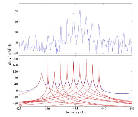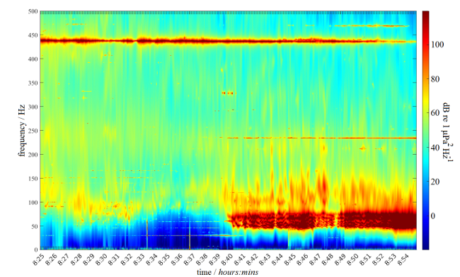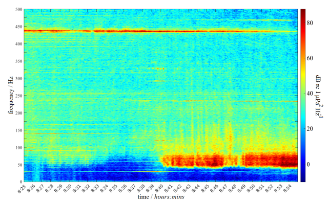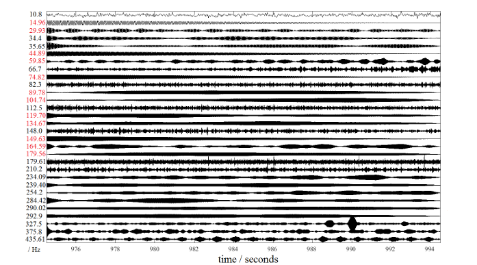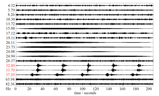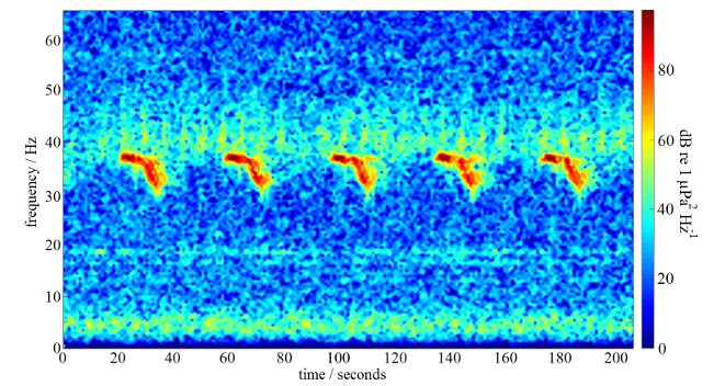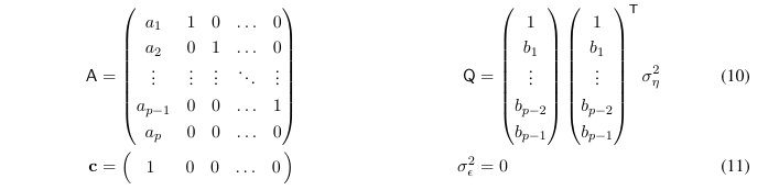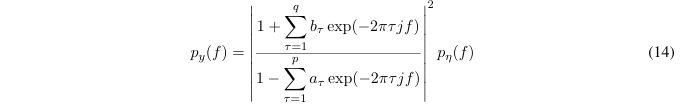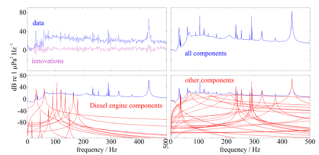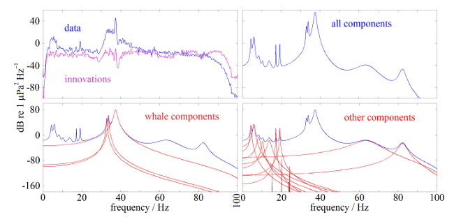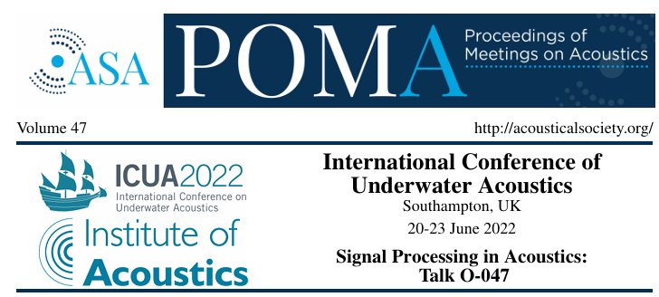 A A A Volume : 47 Part : 1 Analysis of hydroacoustic time series by parametric predictive modelling Andreas Galka Citation: Proc. Mtgs. Acoust. 47, 055001 (2022); doi: 10.1121/2.0001596 View online: https://doi.org/10.1121/2.0001596 View Table of Contents: https://asa.scitation.org/toc/pma/47/1 Published by the Acoustical Society of America ARTICLES YOU MAY BE INTERESTED IN Comparison of two different methods to include a beam pattern in parabolic equation models Proceedings of Meetings on Acoustics 47, 070006 (2022); https://doi.org/10.1121/2.0001593 Accuracy of numerically predicted underwater sound of a ship-like structure Proceedings of Meetings on Acoustics 47, 070001 (2022); https://doi.org/10.1121/2.0001565 Correlations between sound speed and density in seabed sediment cores collected in Norwegian waters Proceedings of Meetings on Acoustics 47, 070004 (2022); https://doi.org/10.1121/2.0001588 Three inventions to clean ship hulls, decontaminate hospital floors, and treat wounds, using air, sound and water Proceedings of Meetings on Acoustics 47, 032001 (2022); https://doi.org/10.1121/2.0001606 Acoustic attenuation of cohesive sediments (mud) at high ultrasound frequencies Proceedings of Meetings on Acoustics 47, 070009 (2022); https://doi.org/10.1121/2.0001594 Sonar array beampattern bounds and an interval arithmetic toolbox Proceedings of Meetings on Acoustics 47, 055002 (2022); https://doi.org/10.1121/2.0001613 Analysis of hydroacoustic time series by parametric predictive modelling Andreas Galka Department GF620, Bundeswehr Technical Center for Ships and Naval Weapons, Maritime Technology and Research (WTD71), Eckernforde, Schleswig-Holstein, 24340, GERMANY; andreas.galka@gmail.com In this paper we study hydroacoustic time series by parametric predictive modelling, using linear state space models. The aim is to detect, separate and characterise sound components emitted by complex sources such as ships, marine mammals, explosions, etc. The models are fitted to the data by Kalman filtering and maximisation of the likelihood, using various algorithms for numerical optimisation. We demonstrate that by state space modelling parametric estimates of the power spectrum can be obtained which have attractive properties, as compared to classical spectral methods. We present several examples for the application of state space modelling to actual data, including ship sounds and whale vocalisations. Special emphasis is given to the modelling of combs of ship lines, stemming e.g., from Diesel engines, or from propeller singing. 1. INTRODUCTION Hydroacoustic time series may contain mixtures of signal components of various origin, such as technical or natural sources. As a prominent example for technical sources we mention ships, while examples for natural sources include biological sources (e.g., marine mammals), but also earthquakes and effects related to weather. For various purposes, it may be desirable to separate such mixtures and to reconstruct and investigate the source components. As examples for such purposes we mention the analysis of hydroacoustic signatures of ships, possibly with respect to reconnaissance, furthermore acoustic underwater communication, detection of transient events, such as earthquakes or explosions, but also research related to biological sources. If several simultaneously recorded time series are available, e.g. obtained by using an array of hydrophones, the task of separation of components can be approached by beamforming techniques or by Blind Signal Separation (BSS) algorithms. However, frequently only a single hydrophone is employed, such that only a single scalar time series is available; in such cases, the task of separating several components represents an underdetermined inverse problem. In this paper we propose to solve this inverse problem within a particular framework for parametric predictive modelling of time series, known as state space modelling. 1, 2 This framework has been shown to provide solutions to a variety of time series analysis tasks arising in diverse fields such as statistics, physics and engineering, but also econometrics. A standard element in the analysis of time series is the estimation of the power spectrum (power spectral density); usually this task is performed by the Discrete Fourier T ransform (DFT), representing a classical non-parametric approach. Through parametric predictive modelling, an alternative approach to the estimation of power spectra becomes available, providing parametric estimates of the power spectrum. Compared to their non-parametric counterparts, these offer the advantage of much smoother appearance, i.e., better noise suppression. In this paper we will present examples for parametric estimates of the power spectrum and of the spectrogram of actual hydroacoustic time series. The structure of this paper is as follows. In Section 2 we review the mathematical background of parametric predictive modelling by state space models. In Section 3 we discuss the practical fitting of these models to actual data sets. In Section 4 results for two actual data sets are presented; the paper closes with a section containing discussion and conclusions. 2. PARAMETRIC PREDICTIVE MODELS We denote the time series data to be modelled by y (t) , where t = 1 , . . . , N denotes time in units of the sampling time; N denotes the length of the time series. We assume that the mean of the time series has been subtracted, such that afterwards the mean is zero. Two classes of parametric predictive models will be discussed now: Autoregressive moving-average models and state space models. A. AUTOREGRESSIVE MOVING-AVERAGE (ARMA) MODELS A parametric predictive model aims at predicting the value of the recorded quantity at time t , i.e., y (t) , by using a set of previous values of the recorded quantity, i.e., y (t − 1) , y (t − 2) , . . . , y (t − p) : In this model, f (.) represents some (in general nonlinear) deterministic function, wh