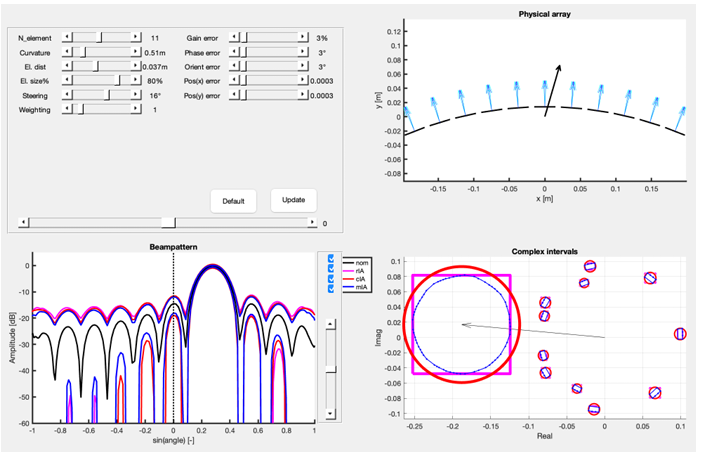 A A A Volume : 47 Part : 1 Sonar array beampattern bounds and an interval arithmetic toolbox Havard Kjellmo Arnestad, Gábor Geréb, Tor Inge Birkenes Lønmo, et al. Citation: Proc. Mtgs. Acoust. 47, 055002 (2022); doi: 10.1121/2.0001613 View online: https://doi.org/10.1121/2.0001613 View Table of Contents: https://asa.scitation.org/toc/pma/47/1 Published by the Acoustical Society of America ARTICLES YOU MAY BE INTERESTED IN Modelled sonar and target depth distributions for active sonar operations in realistic environments Proceedings of Meetings on Acoustics 47, 070013 (2022); https://doi.org/10.1121/2.0001610 Photogrammetry as a finite element modelling geometry builder Proceedings of Meetings on Acoustics 47, 022001 (2022); https://doi.org/10.1121/2.0001611 Analysis of hydroacoustic time series by parametric predictive modelling Proceedings of Meetings on Acoustics 47, 055001 (2022); https://doi.org/10.1121/2.0001596 Accuracy of numerically predicted underwater sound of a ship-like structure Proceedings of Meetings on Acoustics 47, 070001 (2022); https://doi.org/10.1121/2.0001565 Estimation of uncertainties in underwater sound measurements of ships Proceedings of Meetings on Acoustics 47, 070002 (2022); https://doi.org/10.1121/2.0001571 Comparison of two different methods to include a beam pattern in parabolic equation models Proceedings of Meetings on Acoustics 47, 070006 (2022); https://doi.org/10.1121/2.0001593 Sonar array beampattern bounds and an interval arithmetic toolbox Havard Kjellmo Arnestad and Gábor Geréb Department of Informatics, University of Oslo: Universitetet i Oslo, Oslo, 0373, NORWAY; havard.arnestad@gmail.com; haavaarn@uio.no; gaborge@uio.no Tor Inge Birkenes Lønmo Kongsberg Maritime AS, Horten, Viken, NORWAY; Tor.Inge.Birkenes.Lonmo@km.kongsberg.com Jan Egil Kirkebø InPhase Solutions AS, Trondheim, 7038, NORWAY, janki@ifi.uio.no Andreas Austeng and Sven Peter Näsholm Department of Informatics, University of Oslo: Universitetet i Oslo, Oslo, 0373, NORWAY, andreas.austeng@ifi.uio.no; svenpn@ifi.uio.no The framework of interval arithmetic (IA) and its extension to complex numbers has in the last decade been applied as a tool for finding robust tolerance bounds of antenna arrays. The IA framework complements statistical methods, as inclusive upper and lower bounds of the beampattern are obtained directly, only assuming error bounds on specifically chosen array parameters. Recently, beampattern synthesis for sonar arrays subject to amplitude excitation errors has been extended from linear arrays with omnidirectional elements to non-linear arrays with directive elements. In this work, we demonstrate that the analysis can be developed further to include both amplitude and phase errors. Moreover, we account for error bounds in element position and orientation, thus representing a more comprehensive method for evaluating the worst-case performance due to uncertainty bounds in a multitude of design parameters. For this purpose, we have created an open-source MATLAB toolbox to calculate beampattern bounds for an array with bounded error tolerances. The toolbox features an object oriented library of interval classes and an interactive graphical user interface with easily configurable settings, where results for different interval representations are shown along with their corresponding bounds. The beampattern bounds of a sonar array is illustrated through an example 1. INTRODUCTION In underwater applications, sensor arrays are used to increase the signal-to-noise ratio as well as to steer the directivity of the sonar system. However, there will always be differences between the theoretical and attained image quality due to, e.g., imperfections in the manufacturing and deviations from the propagation medium model. This affects both the directivity and the noise suppression capabilities of the sensor array. It is therefore important to be able to predict the magnitude of these errors quantitatively and how they affect the imaging quality, as discussed by Bates1 in the context of acoustical imaging. Several aspects of the imaging quality and capabilities of a sensor array can be evaluated from the beampattern (see Johson and Dudgeon2). The lateral resolution of the array is largely determined by the width of the beampattern’s mainlobe, and the directional noise suppression capability (and thus the contrast) is given by the beampattern sidelobe level. The nominal beampattern (without errors) is mainly a function of the position, directivity, and weighting of the array elements. For a fixed element configuration, it is possible to trade off mainlobe width to sidelobe level by adjusting the weighting of the array elements. This is referred to as array pattern synthesis, tapering, or apodization. Inherent uncertainties in the manufacturing process and deviations from specifications and models can cause significant degradation in the array performance, i.e. in the beampattern of the sensor array, which has been shown by Ruze3 for antennas and by Sherman and Butler4 in the context of arrays for underwater acoustics. These errors can, e.g., appear in the amplitude and the phase of the element sensitivity, the element orientation, and its location. The resulting increase in sidelobe level can be critical for common applications of such sensor arrays since it can impede the detection of targets. Therefore, it is of great importance to understand how the manufacturing tolerances to these errors can affect the beampattern, so that upper and lower bounds can be estimated for the beampattern and the sonar performance. Several approaches have been studied for estimating the beampattern interval bounds due to these errors, such as statistical methods applied by Steinberg5 and Lee et al.6 However, since mainstream statistical tools like Monte Carlo methods are based on generating a set of random beampattern realizations, they can only sample from a distribution of beampatterns, and eff