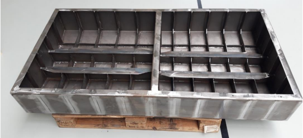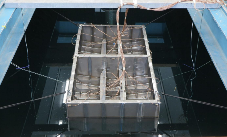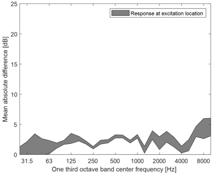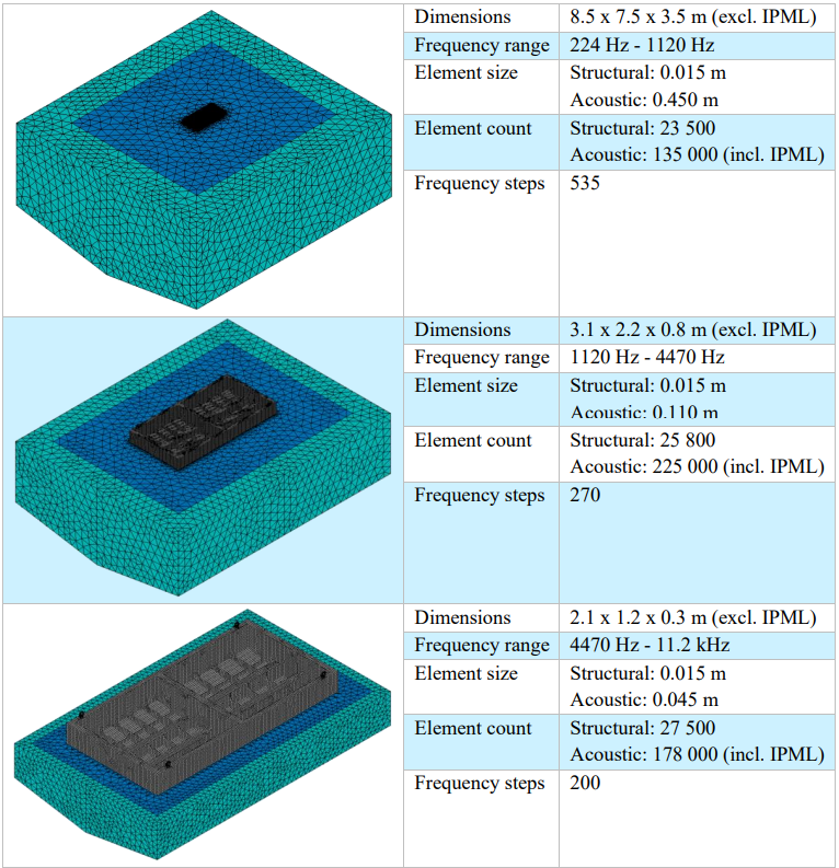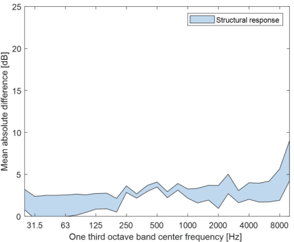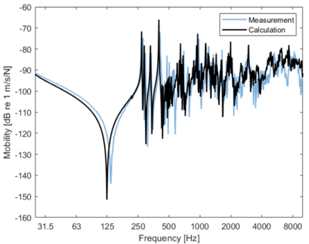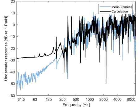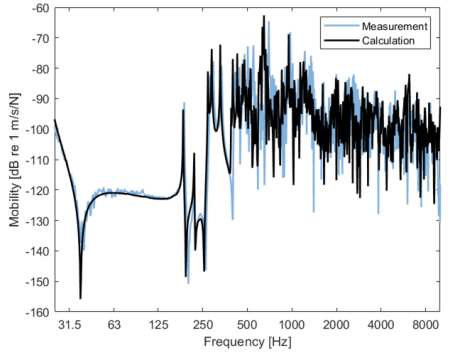 A A A Volume : 47 Part : 1 Accuracy of numerically predicted underwater sound of a ship-like structure Tjakko Keizer , Renaud Gaudel and Izak Goedbloed Citation: Proc. Mtgs. Acoust. 47 , 070001 (2022); doi: 10.1121/2.0001565 View online: https://doi.org/10.1121/2.0001565 View Table of Contents: https://asa.scitation.org/toc/pma/47/1 Published by the Acoustical Society of America ARTICLES YOU MAY BE INTERESTED IN Estimation of uncertainties in underwater sound measurements of ships Proceedings of Meetings on Acoustics 47 , 070002 (2022); https://doi.org/10.1121/2.0001571 Analysis of underwater acoustic data collected under sea ice during the Useful Arctic Knowledge 2021 cruise Proceedings of Meetings on Acoustics 47 , 070003 (2022); https://doi.org/10.1121/2.0001574 Correlations between sound speed and density in seabed sediment cores collected in Norwegian waters Proceedings of Meetings on Acoustics 47 , 070004 (2022); https://doi.org/10.1121/2.0001588 Comparison of two different methods to include a beam pattern in parabolic equation models Proceedings of Meetings on Acoustics 47 , 070006 (2022); https://doi.org/10.1121/2.0001593 Photogrammetry as a finite element modelling geometry builder Proceedings of Meetings on Acoustics 47 , 022001 (2022); https://doi.org/10.1121/2.0001611 Analysis of hydroacoustic time series by parametric predictive modelling Proceedings of Meetings on Acoustics 47 , 055001 (2022); https://doi.org/10.1121/2.0001596 Accuracy of numerically predicted underwater sound of a ship-like structure Tjakko Keizer and Renaud Gaudel Research Department, Damen Research, Development & Innovation, Gorinchem, NETHERLANDS; tjakko.keizer@damen.com ; renaud.gaudel@damen.com Izak Goedbloed Damen Naval, Vlissingen, 4381 NK , NETHERLANDS; I.Goedbloed@damennaval.com In order to assess the accuracy of numerical underwater sound prediction methods, a ship-resembling struc- ture, i.e. a structure with frames, girders, stiffeners and bulkheads, is designed, built and tested. The response of this structure to an excitation force as well as the radiated underwater sound is calculated using numerical calculation methods and compared to the experimental results obtained from measurements performed in a large an-echoic water basin. The measurement results are used to assess the accuracy of the predictions of structural response and radiated underwater sound levels. 1. INTRODUCTION Underwater radiated sound is becoming more and more important. Historically, underwater sound is important for naval vessels in order to reduce the detectability and for (fishery) research vessels as ship generated underwater sound can degrade the performance of the used acoustical sensors. For commercial ships underwater sound is becoming important with respect to the environmental impact. All ship-generated underwater sound originates from fluctuating forces, this can either be temporal fluctuations of the force strength at a fixed location, or spatial fluctuations of the force location with a fixed strength or even combinations of these two. Well known sources of temporal fluctuating forces on board ships are the propulsion machinery including all auxiliary machinery. A typical source of spatial fluctuating forces is the rotating propeller. In this paper the transfer of the temporal fluctuating stationary forces to the underwater sound is investigated using a scale ship-like model. Measurements are performed of the transfer functions between excitation force and underwater radiated sound. These measurements are subsequently used to investigate the accuracy of numerical calculations. 2. SCALE MODEL A picture of the model is given in Figure 1. The main dimensions are given in Table 1. Figure 1. Picture of the steel scale model. Table 1. Main dimensions of the steel scale model. In contradiction of what the naming ‘scale model’ suggests, the model is not actually on scale. For the model to be correctly geometrically scaled, for instance the shell plating thickness should have to be less than 1 mm, resulting in a model that is unpractical to be produced and handled. This model is therefore much stiffer than for instance the models used by De Jong1,2 . The model is therefore made to resemble a ship structure with all ship-like features. It consists of a welded steel construction with frames, stiffeners, bulkheads, girders, etc. This way all possible structural dynamical properties of a ship structure are captured and can be studied. The scale model consists of two open compartments, with different frame spacing and girder dimensions. The shell plating is folded in order to minimize welding length, all other parts inside the model are fully welded. 3. TESTING Transfer functions have been measured on the scale model floating in a large anechoic basin. The dimensions of the basin are about 8x10x8 m (LxBxH), which is large enough to accommodate wave lengths for frequencies above approximately 200 Hz. The basin is provided with underwater sound absorption in order to reduce reflections as much as possible, even though at low frequencies some reflection might still occur. The model is held in place using elastic cords at the corners. In Figure 2, the instrumented scale model is shown in the anechoic water basin. Figure 2. Picture of the instrumented steel scale model in the anechoic water basin. Transfer functions have been measured up to a frequency of 10 kHz. Hammer excitation is used to excite the scale-model, the excitation force is being recorded using a force sensor on the hammer. Several combination of hammer weights and tip stiffnesses have been used to cover the complete frequency range of interest with a sufficiently high signal to noise ratio. With each hammer-tip combination multiple impacts have been performed at each impact location and averaged in order to reduce random noise in the measurements. Measurements are performed with a measurement duration of 4 seconds, resulting in a transfer functions with a 