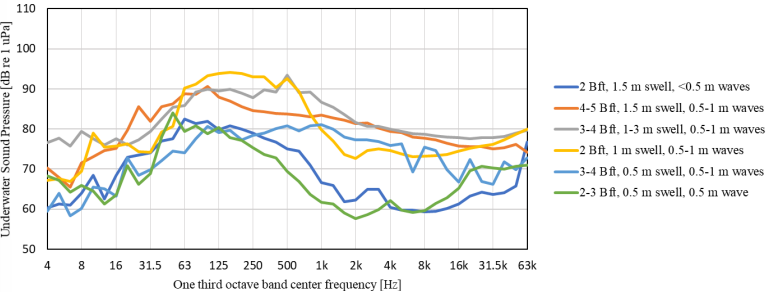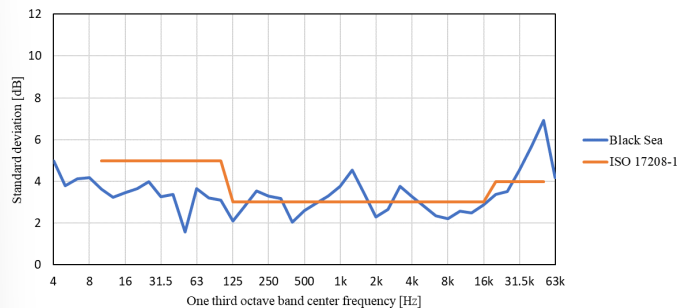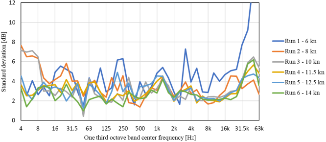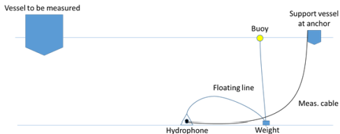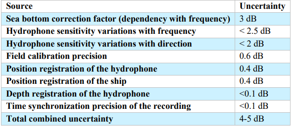 A A A Volume : 47 Part : 1 Estimation of uncertainties in underwater sound measurements of ships Tjakko Keizer , Renaud Gaudel , Lean Macleane , et al. Citation: Proc. Mtgs. Acoust. 47 , 070002 (2022); doi: 10.1121/2.0001571 View online: https://doi.org/10.1121/2.0001571 View Table of Contents: https://asa.scitation.org/toc/pma/47/1 Published by the Acoustical Society of America ARTICLES YOU MAY BE INTERESTED IN Accuracy of numerically predicted underwater sound of a ship-like structure Proceedings of Meetings on Acoustics 47 , 070001 (2022); https://doi.org/10.1121/2.0001565 Analysis of underwater acoustic data collected under sea ice during the Useful Arctic Knowledge 2021 cruise Proceedings of Meetings on Acoustics 47 , 070003 (2022); https://doi.org/10.1121/2.0001574 Correlations between sound speed and density in seabed sediment cores collected in Norwegian waters Proceedings of Meetings on Acoustics 47 , 070004 (2022); https://doi.org/10.1121/2.0001588 Comparison of two different methods to include a beam pattern in parabolic equation models Proceedings of Meetings on Acoustics 47 , 070006 (2022); https://doi.org/10.1121/2.0001593 Analysis of hydroacoustic time series by parametric predictive modelling Proceedings of Meetings on Acoustics 47 , 055001 (2022); https://doi.org/10.1121/2.0001596 Sonar array beampattern bounds and an interval arithmetic toolbox Proceedings of Meetings on Acoustics 47 , 055002 (2022); https://doi.org/10.1121/2.0001613 Estimation of uncertainties in underwater sound measurements of ships Tjakko Keizer , Renaud Gaudel and Lean Macleane Research Department, Damen Research, Development & Innovation, Gorinchem, NETHERLANDS; tjakko.keizer@damen.com ; renaud.gaudel@damen.com; lean.macleane@damen.com David Tolman, Bruce Paterson and Chanwoo Bae British Columbia Ferry Services Inc., Victoria, CANADA; david.tolman@bcferries.com ; bruce.paterson@bcferries.com ; chanwoo.bae@bcferries.com An experimental assessment of the uncertainty in underwater sound measurements of ships is performed on basis of measurements of 6 nominally identical road ferries. The obtained statistics allow to identify uncertainties in measuring underwater sound levels due to the use of different equipment, in different weather conditions for different nominally identical products. The results of these measurements are compared with the claimed uncertainties on basis of ISO 17208-1. 1. INTRODUCTION For six Island Class ferries underwater sound levels have been measured. These vessels are constructed for British Columbia Ferry Services, Inc. (BC Ferries) by Damen Shipyards Galati. In Figure 1, the outline of the ferry is given and in Table 1, the main characteristics of these vessels are given. For these vessels, low underwater sound levels are of importance as these vessels are likely to be operated in areas where the Southern Resident Killer Whales live. The underwater sound of these vessels can affect the ability of these endangered animals to communicate, reproduce, rest, hunt and navigate. Therefore, BC Ferries has developed a long-term underwater noise management plan 1 to address this issue. As part of this initiative, the underwater sound of the six new Island Class vessels was measured during the acceptance trials of the ships at the Black Sea. All six ships are nominally identical. They are all built at the same shipyard, according to the same drawings and using the same components. Therefore, the underwater sound of these six ships is expected to be identical. However, as a result of a natural variability as well as uncertainties in the measurements there will be a certain spread in the measured results. Knowledge of the amount of spread is important when analyzing the measured results for a single ship or a limited amount of ships. For example, when comparing the results of the measurement to the predicted results or when comparing a predicted level with a requirement. Since the prediction is aimed to predict the mean expected level, even for a perfect prediction the measurement of a single ship will deviate from this as a result of the above-described spread. This spread cannot be reduced, as most affecting factors are either unmanageable or too expensive to control. In this paper the total or combined uncertainty of underwater sound level measurements is quantified based on the performed measurements of these six ships. Figure 1. Outline of the Island Class ferry. Table 1. Main characteristics of the Island Class vessels. 2. MEASUREMENT SETUP Underwater sound levels have been measured using the DNV-GL Silent methodology2 . A hydrophone is positioned at the seabed of the Black Sea, at a depth of 70 meters, using a steel fixture, as given in Figure 2. Figure 2. The hydrophone mounted in the fixture. The track line of the ship is chosen such that the beam aspect of the ship is measured at a transverse distance of about 200 meters. During the measurements, the actual distance between the ship and the hydrophone is measured using DGPS for each run. A schematical overview of the measurement setup is given in Figure 3. Figure 3. Schematical overview of the measurement setup used. The underwater sound is recorded over two ship lengths. As the forward and aft part of the ship are symmetrical, the acoustic center is taken at the mid ship. The measurement is started at the moment the acoustical center is one ship length before the closest point of approach (CPA) and ends the moment it is one ship length aft of CPA. From the obtained recording, an equivalent one third octave band spectrum is derived. Since the hydrophone is positioned close to the seabed, it measures both the direct incident sound of the ship as well as the sound reflected via the seabed. For the first and most dominant reflected path, the incidence angle of the sound on the seabed is smaller than the critical angle of incidence, resulting in nearly perfect reflection. The sound reflected from the seabed is thus almost as stro