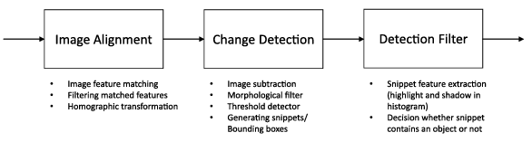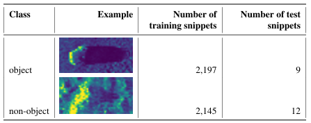 A A A Volume : 47 Part : 1 Reducing the false alarm rate of a simple sidescan sonar change detection system using deep learning Yannik Steiniger , Sven Schröder and Jannis Stoppe Citation: Proc. Mtgs. Acoust. 47 , 070022 (2022); doi: 10.1121/2.0001642 View online: https://doi.org/10.1121/2.0001642 View Table of Contents: https://asa.scitation.org/toc/pma/47/1 Published by the Acoustical Society of America ARTICLES YOU MAY BE INTERESTED IN Simulating elastic targets for sonar algorithm development Proceedings of Meetings on Acoustics 46 , 070002 (2022); https://doi.org/10.1121/2.0001605 The SOUNDS project: towards effective mitigation of underwater noise from shipping in Europe Proceedings of Meetings on Acoustics 47 , 070021 (2022); https://doi.org/10.1121/2.0001638 Acoustic source localization in underwater environment using set methods Proceedings of Meetings on Acoustics 47 , 070023 (2022); https://doi.org/10.1121/2.0001643 Utilizing imaging geometry meta-data in classification of synthetic aperture sonar images with deep learning Proceedings of Meetings on Acoustics 47 , 070011 (2022); https://doi.org/10.1121/2.0001607 Fourier and wavelet techniques in denoising and deconvolving sperm whale data from the northern Gulf of Mexico Proceedings of Meetings on Acoustics 46 , 055001 (2022); https://doi.org/10.1121/2.0001573 Development of software for performing acoustic time reversal with multiple inputs and outputs Proceedings of Meetings on Acoustics 46 , 055003 (2022); https://doi.org/10.1121/2.0001583 Reducing the false alarm rate of a simple sidescan sonar change detection system using deep learning Yannik Steiniger Department of Situational Awareness, German Aerospace Center DLR Institute for the Protection of Maritime Infrastructures, Bremerhaven, Bremen, 27572, GERMANY; yannik.steiniger@dlr.de Sven Schröder and Jannis Stoppe German Aerospace Center DLR Institute for the Protection of Maritime Infrastructures, Bremerhaven, Bremen, 27572, GERMANY; sven.schroeder@dlr.de, jannis.stoppe@dlr.de Detecting changes on the sea floor between two sonar images is a challenging but important task. Typical image based change detection methods are prone to have a high false alarm rate. In this work we introduce a change detection processing chain which uses a convolutional neural network (CNN) to classify potential detections into the two classes object and non-object. Simulated data as well as real sidescan sonar images are used to analyse the proposed method. A new simulation pipeline based on Blender and image transformations is introduced to generate the synthetic dataset. Using the classification by the CNN as a filtering technique a reduction of the false alarm rate is achieved. In the most complex scenario the number of false alarms can be reduced by 57.5% compared to a filtering method based on the histogram of the pixel intensities inside the snippets. 1. INTRODUCTION When searching for objects on the sea floor image sonar systems like sidescan sonar (SSS) or synthetic aperture sonars (SAS) are used. They are typically mounted on an autonomous underwater vehicle (AUV) to enable an automatic capturing of the data, i.e., scans of the sea floor. Using a special processing the data captured by the sonar system can be displayed as a georeferenced image. Since over the course of a scanning mission a large amount of data is automatically captured, an automatic processing to aid the operator interpreting the images is essential. Several research works have focused on implementing methods from the computer vision domain (mainly neural networks) for the detection [1–4], segmentation [5–7] and classification of sonar images [8–13]. If two images of the same location are captured at different time instances, information about changes in the environment can be extracted. This technique is known as change detection and can for example be used to detect sunken or manually placed objects in the later image. In general, change detection algorithms are divided into image-based and symbolic-based methods [14]. Image-based change detection directly com- pares two images while in symbolic-based change detection objects are detected in both images separately, georeferenced and then compared [15–17]. Image-based change detection using SAS can further be divided into non-coherent and coherent change detection, where the former considers only the magnitude informa- tion and the latter also the phase information [18]. Our work deals with SSS data and thus an image-based non-coherent change detection processing chain as shown in Figure 1 is applied. This change detection con- sists of the typical steps: image alignment, subtraction and detection [19,20]. However, the result is prone to have a high false alarm rate caused by changes of the seafloor, noise or poor image alignment. Thus, the detections need to be filtered in order to reduce the number of false alarms. In our work, we propose to utilise a convolutional neural network (CNN) for this task. The CNN is trained to classify sonar snippets into the two classes object and non-object. To the best of our knowledge, deep learning methods like CNNs have not yet been considered for change detection in SSS or SAS images. Furthermore, to account for the fact that sonar images suited to test change detection algorithms are hard to acquire, we set up a simulation pipeline based on Blender. Several transformations are applied to the image generated by Blender to generate a more realistic look. Objects can be added or removed and image transformations, like translation and rotation, be applied to simulate an image from a second mission with changes present. To this end, the baseline and deep learning based change detection processing chain are compared using simulated as well as real SSS images. Our work comprises the following contributions: • We propose a simple and efficient simulation pipeline to generate SSS images, which can be used to analyse the perfo