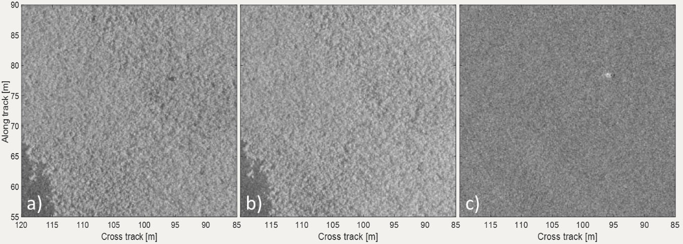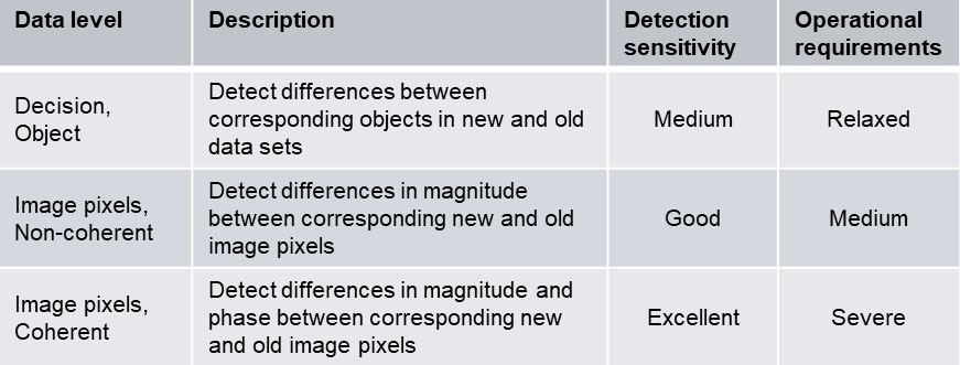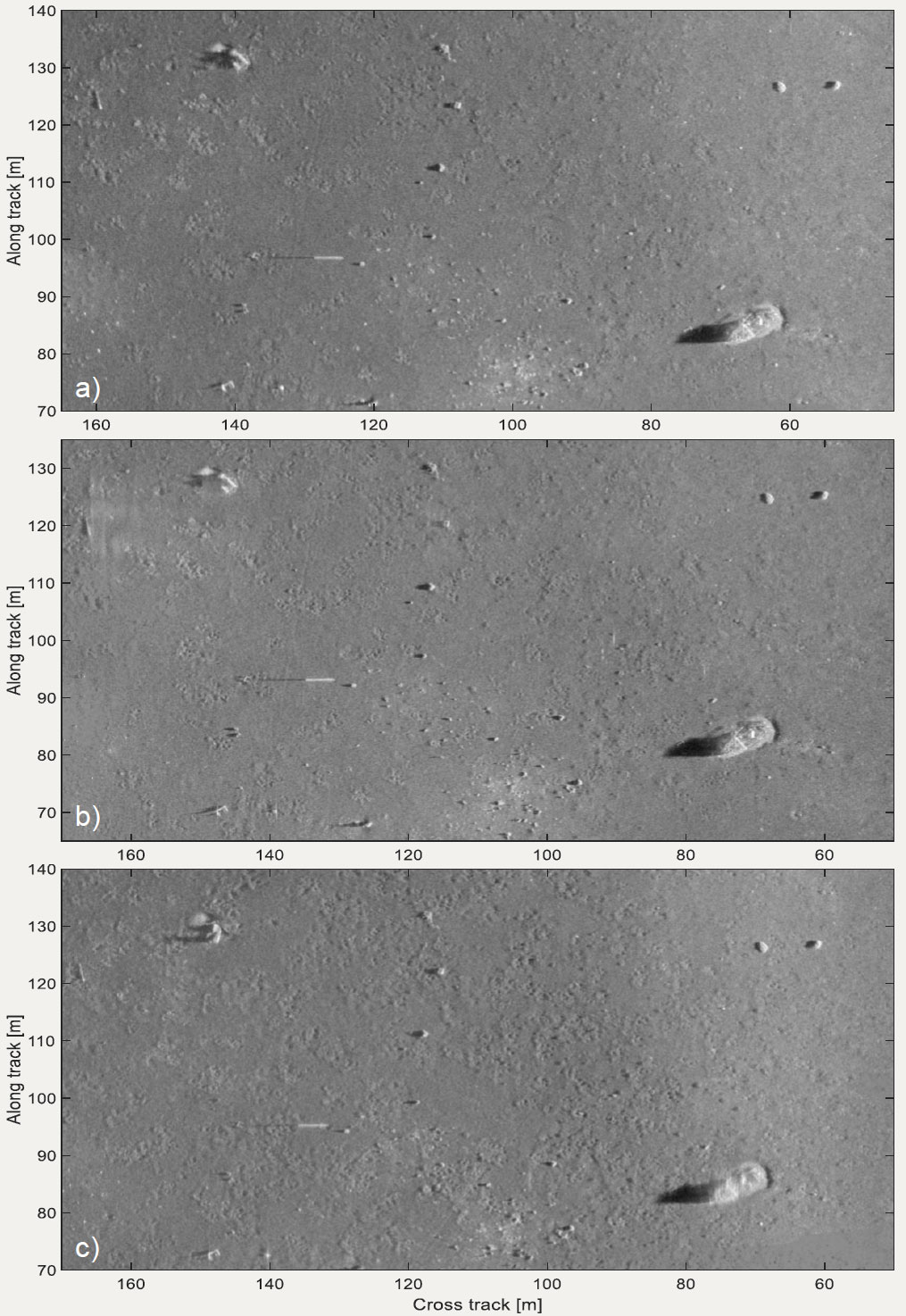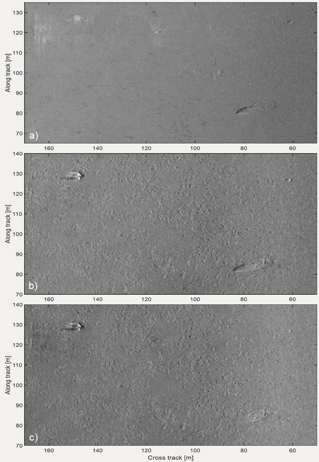 A A A Volume : 45 Part : 1 Proceedings of the Institute of Acoustics Challenges of automated change detection in repeat-pass synthetic aperture sonar imagery Ø. Midtgaard, Norwegian Defence Research Establishment (FFI), Kjeller, Norway T. O. Sæbø, Norwegian Defence Research Establishment (FFI), Kjeller, Norway N. D. Warakagoda, Norwegian Defence Research Establishment (FFI), Kjeller, Norway 1 INTRODUCTION Change detection extracts regions of interest as temporal differences by imaging a scene before and after changes may have occurred. We denote the initial image as the reference and the more recent as the current image. Automated tools for image comparison are a prerequisite for many change detection applications, because the large data rates and detailed, yet repetitive contents of the imagery make full manual analysis tedious and prone to errors. Although automated change detection (ACD) in repeat-pass imagery is a well-established technique for synthetic aperture radar (SAR)1, it is far less mature for underwater sonar due to inherent properties of both traditional side-scan sonar (SSS) imaging and the complex ocean environment. These properties impede for example sensor trajectory control, data positioning accuracy and image resolution. The increasing use of autonomous underwater vehicles (AUVs) equipped with advanced synthetic aperture sonar (SAS) and aided inertial navigation systems (AINS) has partly remedied these limitations and facilitated the development of ACD methods for the sonar domain2-5. Still, important challenges remain, in particular regarding scene stability, sensing consistency and image alignment between surveys. 1.1 Applications ACD in repeat-pass SAS imagery holds the potential to increase significantly both the efficiency and effectiveness of many military and civilian operations connected to seafloor monitoring. The prime naval application is arguably mine counter-measures (MCM), where ACD can improve mine hunting performance by eliminating mutual clutter objects (rocks and debris) in the two datasets. ACD can thus reduce the fraction of seafloor areas currently deemed unhuntable due to excessive clutter densities, and may be the only feasible option to detect mines with unknown physical characteristics, i.e. improvised explosive devices (IEDs) and novel mine models. Other important naval applications include intelligence, surveillance and reconnaissance (ISR), port protection and seabed warfare. In the offshore industry, ACD can provide operational benefits during external inspection of seafloor infrastructure such as pipelines, cables, well-head and wind farm installations. Another promising application is environmental monitoring of e.g. underwater dumpsites (unexploded ordnance and industrial waste), degradation of hazardous wrecks and trawling/fishing impact on the seafloor. Within marine science, ACD can document e.g. bioturbation activities and vegetation coverage changes. Due to the diversity of potential ACD applications, the relevant types of changes depend on the given task. Mine hunting, for instance, aims to detect new, mine-like objects, while detections of changes in seafloor texture constitute false alarms. The latter change signatures may, however, be relevant detections for other ACD usages within e.g. environmental monitoring or marine science. To maximize detection performance, it may be beneficial to optimize the ACD algorithm in a supervised manner for the specific task. For many applications, realistic resurvey intervals are in the order of years, due to the high costs of large area seafloor surveys. The remainder of this paper is structured as follows: Chapter 2 categorizes the ACD processing approaches, while Chapter 3 describes the challenges for ACD in SAS imagery. Chapter 4 visualizes some of these challenges using experimental data from the HISAS1030 sonar. Chapter 5 summarizes the main findings and concludes the paper. 2 PROCESSING APPROACHES Table 1 categorizes ACD approaches based on the data level used as input for temporal comparison. Both the detection sensitivity and the requirements for successful operation increase considerably from the top to the bottom table entry. Using the most sensitive approach whose requirements are fulfilled in the given environment and scenario, will provide the best achievable performance. Neither of the approaches are therefore generally superior to the others. Decision level methods process the reference and current data separately to detect and classify e.g. mine-like objects, before matching the two sets of results. The results may include estimated object class, position, dimensions and other characteristics. These approaches are necessarily supervised, because creation of the detector/classifier requires a priori models or training data for the given task. Decision level methods are vulnerable to processing errors in the individual data sets and incorrect data associations, but are otherwise unaffected by varying sensing conditions and scene stability. Early sonar ACD works focused on decision level (contact based) methods for mine hunting, i.e. locating new mine-like contacts without a reference contact in corresponding position6-7. Contrarily, image level ACD methods compare individual pixels (or small regions) in the current and reference images. These methods can be either non-coherent or coherent, depending on whether they consider only the pixel magnitude or both magnitude and phase. Non-coherent change detection (NCD) is more operationally robust, while coherent change detection (CCD) is more sensitive and may even detect phase changes caused by minute displacements of sediment grains that are undiscernible in the magnitude images. The processing for both variants typically consists of three main steps. The first step retrieves roughly corresponding image data based on the platform navigation solutions and performs algorithm-specific image preprocessing. The next step applies fine