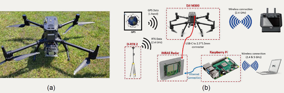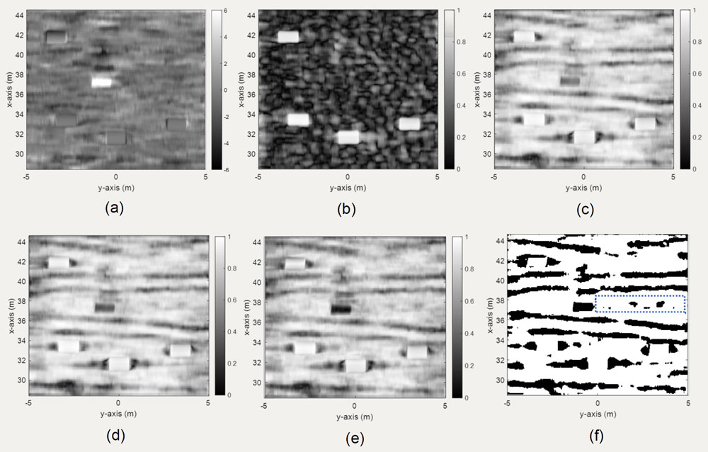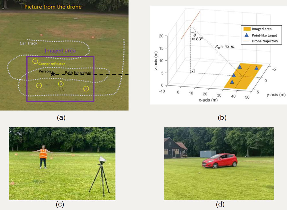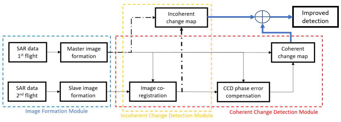 A A A Volume : 45 Part : 1 Proceedings of the Institute of Acoustics Drone-borne SAR change detection techniques Ali Bekar, Department of EESE, University of Birmingham, UK Christopher J. Baker, Department of EESE, University of Birmingham, UK Michail Antoniou, Department of EESE, University of Birmingham, UK 1 INTRODUCTION Mini consumer drones have several unique characteristics such as being cheap, easily accessible, rapidly deployable, easy-to-operate, and able to access difficult areas where human access is dangerous and unsafe. In parallel, drone technology has been progressing and drone technical specifications have been improving such as increasing flight time, better positioning accuracy, and higher resistance to changing weather conditions. Hence, it has been used by the synthetic aperture radar (SAR) community as a new radar platform over the last decade. Previous research showed that high-frequency drone-borne SAR systems are capable to provide very fine-resolution imagery of an extended target area by employing data-driven autofocus techniques [1]. Having the capability to obtain high-resolution imaging, a natural next step is to investigate how such imagery can be exploited through advanced SAR imaging modes. Drone-borne SAR may employ the SAR change detection technique to detect defects and changes that occur over time and improve situational awareness. Change detection (CD) relies on the comparison of repeat-pass, temporally separated SAR images. It is a well-known SAR technique and widely used by the SAR community [2] – [7]. Both large-scale changes and subtle changes can be detected by CD methods. When higher operating frequencies are used, the sensitivity to subtle changes in the scene improves. However, precision SAR focusing and high coherence between repeat-pass images are preconditions for SAR CD. Fundamentally, the main challenge in CD is ensuring a high correlation between the image pair. Due to the short-range, high-frequency, and high-resolution application, the drone's motion deviation from the nominal trajectory results in space-variant errors besides the space-invariant errors. These errors are unique for each pass, which makes two-pass imaging geometries mismatched. Even if two focused images are formed, high co-registration errors and spatially invariant/variant phase errors can exist in the resulting change map. The previous study showed that calibrated target displacements can be detected by both the incoherent ratio method and the classical coherence estimator, and the SAR system operating at 24 GHz can potentially provide a mm-level sensitivity to the scene change [8]. However, only phase-ramp errors were compensated in the coherent change detection process. Hence, the algorithm in [8] can be used when motion errors are low. The aim of this study is to generate CD maps robustly by minimizing the effect of motion errors and to compare the performance of the different change detection approaches for high-frequency, high resolution drone-borne SAR. In this work, the proposed algorithm in [8] is modified to form CD maps more robustly. After examining the drone-borne SAR capability in detecting human activities and car tyre marks experimentally using the conventional change detection methods employed in [8], further improvement in the CD performance of the system is investigated by employing Berger's coherence estimator and combining coherent and incoherent methods. In summary, SAR images are formed using data-driven autofocus techniques as described in [1]. Then, geometric mismatches are minimized by employing an intensity-based co-registration algorithm. Later, an interferometric phase error compensation technique that uses a parametric optimization approach is implemented. Finally, incoherent/coherent change maps are formed using the above-mentioned methods, and the improvement in the detection performance is investigated when coherent and incoherent techniques are used together. The remainder of this paper is organized as follows. Section 2 explains SAR change detection whereas Section 3 explains the algorithm. The experimental results are presented in Section 4. Finally, in Section 5, conclusions are drawn. 2 SAR CHANGE DETECTION Change detection is a repeat-pass, repeat-geometry SAR method. The change can be detected by incoherent and coherent methods. Incoherent methods are more sensitive to large-scale changes, such as the displacement of a sizeable object whereas coherent methods can detect subtle changes, such as tyre marks and footprints. In incoherent change detection (ICD), temporally separated SAR images are compared in terms of mean backscatter power. Conventionally, averaging of multiple resolution cells’ intensities is taken to obtain the mean backscatter power. The change map can be generated by considering the difference between the intensities. However, this method is not befitting to detect changes in SAR imagery because the result changes depending on the intensity levels of the images [4]. As an alternative approach, the ratio method which is independent of intensity variance and only depends on the relative change can be used. The change is calculated by using a sliding window: where π and π are the first and the second complex images obtained from two passes, π₯ and π¦ represent ground-range and cross-range samples, π and π indicate resolution cells within the sliding window, and π and π determine the number of resolution cell samples along the ground-range and cross-range directions, respectively. The change can also be expressed in decibels as 10 log(πΆπ·1). In this case, high-intensity pixels represent arriving targets whereas low-intensity pixels indicate leaving targets. Coherent change detection (CCD) relies on the comparison of repeat-pass, temporally separated SAR images at the phase level and the subsequent extraction of an image coherence map. The pixels in the CCD map have values in the range [0, 1], and