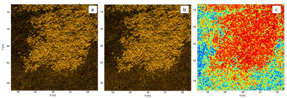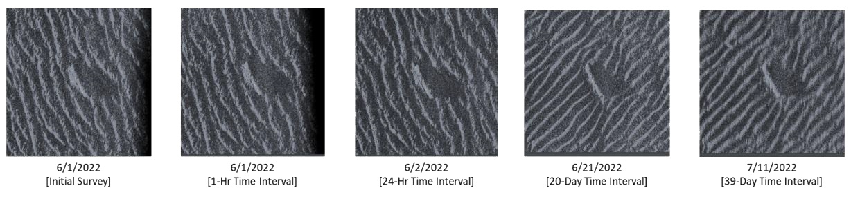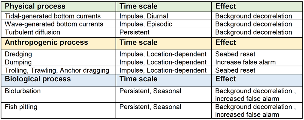 A A A Volume : 45 Part : 1 Proceedings of the Institute of Acoustics The impacts of scene stability and acoustic backscatter coherence on automated seabed change detection E. Shouldice, Defence Research and Development Canada, Dartmouth, Nova Scotia, Canada S. Smith, Naval Surface Warfare Center Panama City Division, Panama City, Florida, USA T. O. Sæbø, Norwegian Defence Research Establishment, Kjeller, Norway A. Crawford, Defence Research and Development Canada, Dartmouth, Nova Scotia, Canada Ø. Midtgaard, Norwegian Defence Research Establishment, Kjeller, Norway J. King, Naval Surface Warfare Center Panama City Division, Panama City, Florida, USA S. Johnson, Pennsylvania State University, State College, Pennsylvania, USA D. Sternlicht, Naval Surface Warfare Center Panama City Division, Panama City, Florida, USA A. Penko, U.S. Naval Research Laboratory, Stennis Space Center, Mississippi, USA A. Lyons, Center for Coastal and Ocean Mapping / Center for Acoustics Research and Education, University of New Hampshire, Durham, New Hampshire, USA E. Bakken, Norwegian Defence Research Establishment, Kjeller, Norway 1 INTRODUCTION Practical implementation of long-term seabed monitoring for civilian and military activities requires automated tools for detecting temporal seabed changes, such as for detection of new trawling activities or mine-like objects on the seafloor. Automated Change Detection (ACD) identifies relevant changes in a particular area of seabed by comparing a pair of Synthetic Aperture Sonar (SAS) images collected before and after the change. Some amount of time after the baseline SAS image data is collected, the same seafloor scene is resurveyed, producing the repeat-pass image. Predicting the optimal time interval between images, known as the resurvey frequency, is needed for the best implementation of ACD. Presently, there is no standard procedure for determining the resurvey frequency that optimizes ACD performance. This paper discusses recent work on factors affecting seabed stability and impacts on requirements for resurvey frequency and effectiveness of ACD. The ACD processing chain can be summarized in four steps: (1) collect a pair of baseline and repeat pass images, (2) co-register/align the images, (3) generate a change map1,2, and (4) detect changes of interest, along with false alarms. There are multiple techniques for co-registering image pairs; for example, one method applies a large-scale alignment followed by a small-scale co-registration3,4. ACD methods applied to multi-temporal SAS imagery can be broadly categorized as incoherent (ICD) or coherent (CCD). ICD techniques process the mean backscatter power of the images, while CCD employs both the amplitude and phase of the backscattered energy. Generally, CCD demonstrates increased sensitivity to small changes, while ICD is more robust over longer time intervals5,6. This is because utilizing the phase difference between two complex images (i.e. interferogram) can lead to the detection of a physical disturbance in the scene even when there is negligible change in amplitude, such as a slight disturbance of the seafloor or the introduction of an object that has similar scattering properties to the seabed. Figure 1 shows multi-temporal SAS seafloor imagery with a physical change (likely an animal track traversing one burrow to another) that is apparent only in phase, resulting in it being detectable in the coherent change map3. To identify changes of relevance, ACD exploits areas of reduced coherence between the pair of coregistered images. Detecting areas of reduced coherence on the change map implies that the image backgrounds have maintained high coherence throughout the duration of the resurvey frequency. Maintaining temporal seabed coherence depends heavily on the stability of the scene, often determined by the composition of the seafloor that is the image background. The seafloor can be dynamic, and between surveys the scene may undergo drastic changes. Changes in the scene due to changes in background seafloor characteristics, rather than changes of interest, can confound ACD and increase the false alarm rate. Higher scene stability improves ACD processing and results, reducing the number of false alarms and allowing for sensitive interferometric analysis techniques such as CCD. Figure 1: Comparison of Incoherent (ICD) and Coherent (CCD) Change Detection where (a) is the baseline image, (b) is the repeat pass image, (c) is the incoherent change map, and (d) is the coherent change map. Environmental and anthropogenic factors that affect the seafloor, such as bottom type, weather, bathymetry, hydrology, biota, and dredging, also affect ACD performance. For optimal ACD performance, an appropriate resurvey frequency must be chosen while taking into account the specific scenario, including environment, sensor, and mission. This paper is concerned with laying the groundwork for developing a tool to predict the optimal resurvey frequency by employing environmental dynamics modeling to make scenario-specific predictions, using a sandy seafloor and CCD techniques as an example. 2 RESURVEY FREQUENCY & SCENE STABILITY Scene stability in ACD refers to how static the seabed, or SAS image background, remains between baseline and repeat pass images. Scene stability can be quantified as the amount of loss of coherence between pixels in a coregistered image pair over the duration of the resurvey interval. The loss of background coherence over time is known as temporal decorrelation and is a cause of deterioration in ACD performance. Temporal decorrelation can result in a high false alarm rate due to numerous detections of changes in the scene background, which can obscure detection of changes of interest. Increased false alarm rates due to low scene stability can decrease ACD performance to potentially insufficient levels. ACD performance can be measured as the ratio of detected changes of interest to the total of detection