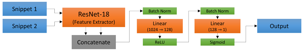A A A Volume : 45 Part : 1 Proceedings of the Institute of Acoustics DAFI: A deep learning-based autofocus improvement metric for synthetic aperture sonar J. Dale, Naval Surface Warfare Center, Panama City, FL, USA M. Emigh, Naval Surface Warfare Center, Panama City, FL, USA J. Prater Jr., Naval Surface Warfare Center, Panama City, FL, USA 1 INTRODUCTION In synthetic aperture radar (SAR), and especially synthetic aperture sonar (SAS), uncompensated platform motion often leads to defocused(†1) images. When images are highly defocused, it is difficult to detect and identify objects on the seafloor, both for human operators and automated target recognition (ATR) algorithms. As a consequence, the detection rate of ATR algorithms can suffer and post-mission analysis times can increase. To make clear what we mean by focus and defocused SAS images, we provide example SAS image pairs in Figure 1. First, we briefly survey a number of methods exist in the literature for directly performing autofocus on beamformed SAR/SAS images. Early methods for data-driven SAR autofocus techniques were developed by Brown and Ghiglia1,2, which culminated in the popular phase gradient autofocus (PGA) algorithm3,4. While SAS and SAR are similar sensing modalities, Callow et al.5 point out that PGA requires some tailoring to achieve SAR-like performance on SAS imagery. As such, they developed a method called stripmap phase gradient autofocus (SPGA), which is commonly used in practice for SAS systems. It is not lost upon the community that SAR/SAS autofocus could benefit from deep learning-based approaches. For example, in SAR, SAE-Net6 employs a denoising autoencoder to combine image formation with autofocus in a self-supervised paradigm and the AFnet/PAFnet models7 directly learn to correct polynomial phase error. Most relevant to SAS, Gerg and Monga developed a highly effective deep learning model for performing SAS autofocus on low size, weight, and power (SWaP) devices8. The proposed DAFI metric, however, is just that — a metric, not an autofocus algorithm. Rather, it is designed to be paired with an autofocus algorithm and provide a second opinion as to whether image quality has actually been improved. Ideally, this will lead to both increased operator confidence in autofocus algorithms as a whole, and to generally clearer SAS images. We have found practical need for such a method, and found no references in the literature that seek to perform the same task. Thus, DAFI was developed. The rest of this paper is organized as follows. We described DAFI in detail in Section 2, including the model architecture and training procedure. Then, experiments are performed to demonstrate the effectiveness of DAFI in Section 3. Finally, conclusions are drawn in Section 4. 2 METHODOLOGY We seek a deep learning model that accepts two realizations of an ATR snippet as input and outputs a confidence indicating whether the latter is of higher quality than the former. When the two inputs are successive iterations of a SAS autofocus algorithm, the output confidence of the network should be a strong predictor of whether the autofocus has improved the quality of the snippet. In this section, we describe DAFI, the model we have developed in order to achieve this goal, and detail our procedure for training it. Figure 1: Two examples of defocused (left) and focused (right) SAS image pairs, with key differences circled in red. Figure 2: DAFI architecture, containing around 11.3 million learnable parameters. Most model parameters are contained in the red nodes. 2.1 Model Architecture The basis for DAFI is the widely-used ResNet-189, with full model details given in Figure 2. The only difference between the ResNet-18 block in Figure 2 and the originally published model is the number of input channels, which was previously three (for RGB images) and is now one (high frequency SAS intensity). We choose this model due primarily to its relatively low parameter count and fast training time, thus lowering the size, weight, and power (SWaP) constraints required should this model be deployed to edge systems. To further reduce model SWaP, we separate the feature extraction components of ResNet-18 (layers prior to the fully-connected layer) from the classification components (fully-connected layer) in order to reuse the learnable feature extractor parameters for our paired SAS snippet inputs. Without this separation, the model would have ≈ 22.5 million parameters, as opposed to ≈ 11.3 million parameters with a shared-weight feature extractor. During training, each of two snippets is first passed through the feature extractor. Then, the two feature vectors of length 512 are concatenated and fed to the classifier, a sequence of fully-connected layers. The output is the model’s confidence that the second snippet is of higher quality than the first, evaluated on the basis of binary cross entropy. This process, including activation and batch normalization, is diagrammed in Figure 2. 2.2 Training To fully utilize our dataset and avoid a time consuming and subjective labeling process, we adopt a self-supervised paradigm for training DAFI, described in Algorithm 1. First, we degrade one SAS snippet S1 using the phase gradient Φ2 estimated from another snippet S2, according to where F is the Fourier transform in the range dimension and G is the inverse of F. This process is very similar to PGA, except we are trying to defocus a snippet rather than focus it. Then, we present both S1 and S'1to the model in a random order to simulate two successive iterations of an autofocus algorithm. The sequence (S'1, S1) corresponds to an iteration of autofocus that improves the quality of a snippet, as the defocused snippet is presented first. Conversely, the sequence (S1, S'1) corresponds to the case we want to detect in real use cases, in which autofocus has lowered the quality of a snippet. To challenge the model, the phase gradient that is used to defocus eac