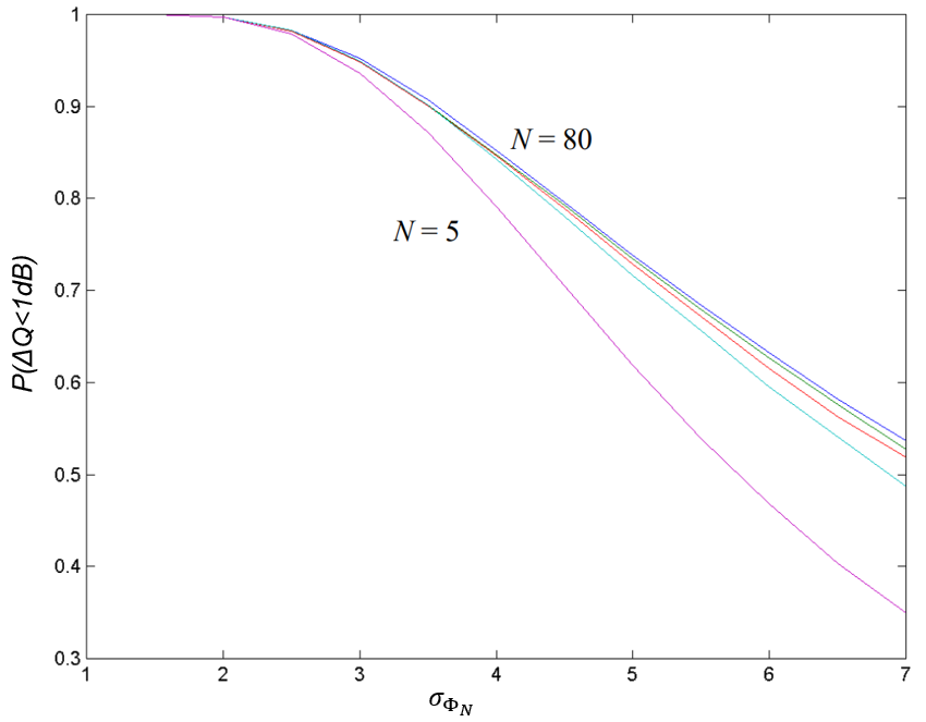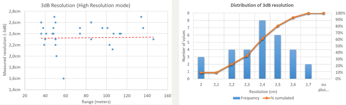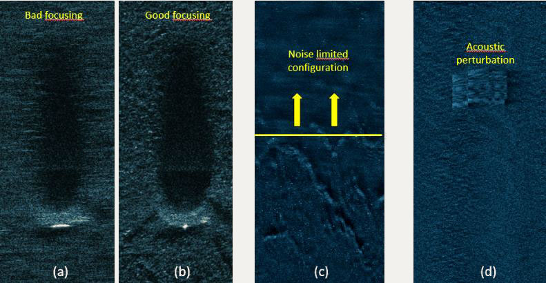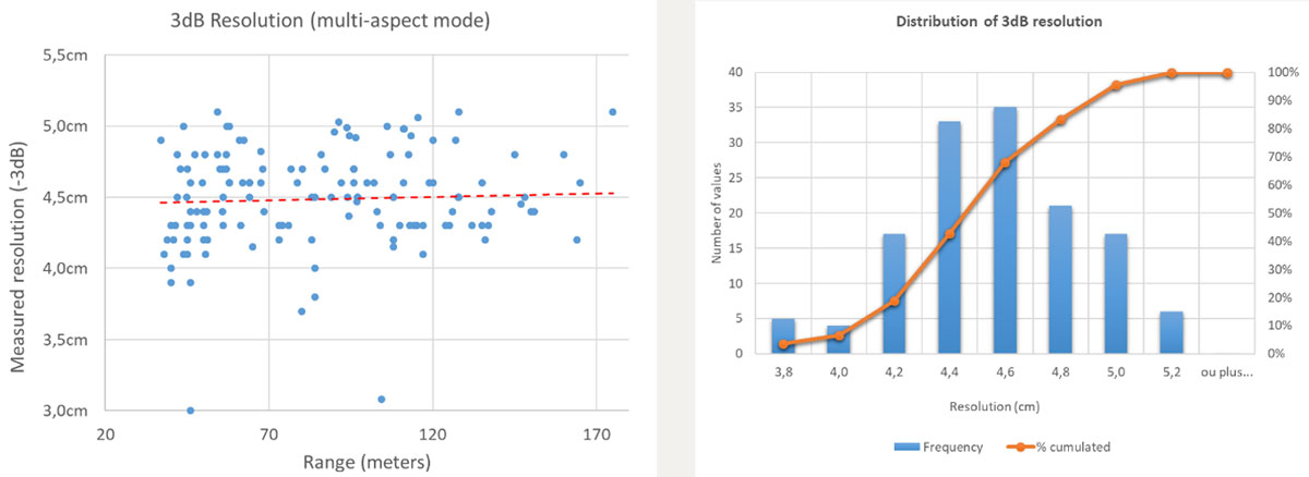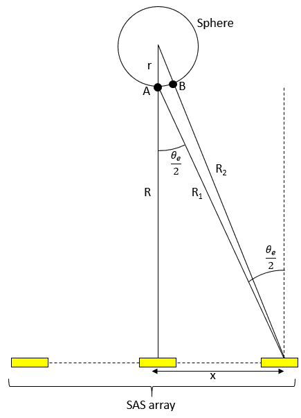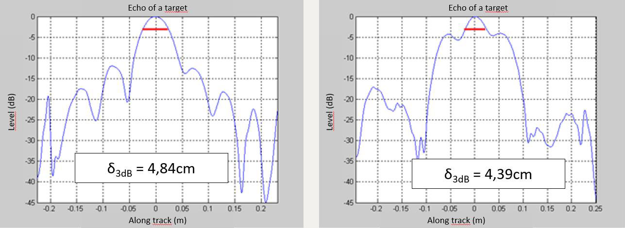 A A A Volume : 45 Part : 1 Proceedings of the Institute of Acoustics Intensive resolution measurement with the SAMDIS multi-aspect synthetic aperture sonar Nicolas Burlet, Thales DMS France SAS Yann Le Gall, Thales DMS France SAS Sebastien Delayes, Thales DMS France SAS Samantha Dugelay, Thales UK Fabien Novella, DGA TN Contact : Nicolas.Burlet@fr.thalesgroup.com 1 INTRODUCTION In the field of mine warfare, improving synthetic aperture sonar (SAS) resolution in order to detect and classify increasingly complex threats is of great interest. Resolution is clearly a fundamental and objective parameter of a sonar (even if the method to measure this resolution is sometimes subject to debate). The quality of a SAS image is affected by multiple factors, such as ambient noise, vehicle instability, propagation conditions, physical and acoustic environment, multiple path, processing, etc. Thus, it seems relatively intuitive to recognize a "bad" image: high side lobes, saturation, defocusing, low contrast, etc. Several interesting illustrations can be found in the article from R.E Hansen1. Other illustrations are visible on Figure 1. As already pointed by J. Dillon2, beautiful sonar images are often presented by sonar manufacturers and especially on wrecks (ships, planes, etc.). Figure 2 is really nice. However, for a mine warfare application, the sonar response of a small object (typically 1mx1m) is more interesting for the end user. Moreover, usually we don’t know how the image was obtained. With a real-time embedded processing or after hours of hand-tuned post-processing in a laboratory? Is this image statistically representative of the other images acquired by the sonar? Does it really qualify the sonar performances? AL van Velsen3 explains that "Relevant performance criteria depend on the application for which the system is to be used". In other words and more complete, a "good" sonar is a sonar that produces images with controlled reproducibility that allows the end user to efficiently perform the task it must accomplish using that image. And this is quite difficult to demonstrate. In this article, we will recall some considerations on the along-track resolution measurement. We will then present the qualification method applied to the high-resolution multi-aspect Synthetic Aperture Mine Detection and Imaging Sonar (SAMDIS), and finally some statistically representative results that guarantee good performance for the end user. Figure 1: Effect of focusing on images (a) and (b). Noise limited configuration on upper part of image (c). Acoustic perturbation on image (c) Figure 2: SAMDIS SAS image from Thales – Swansea-Vale wreck 2 ALONG-TRACK RESOLUTION MEASUREMENT 2.1 Resolution measurement The most used metric is probably resolution2,3,5,7. Resolution9 is the ability to separate points of an object that are located at a small (angular) distance. It is important to remember this basic but physical definition because for a mine warfare operator, this is the ability to discriminate some small elements on a mine that may be the only differences with a natural rock, as can be seen on example10 below (red circles). Figure 3: PDM 12010 mine - Small potentially discriminating elements The resolution measurement simply consists in the width measurement of the main lobe of the azimuth response of a point target. This method, sometimes called HPBW4 (Half Power Beam Width), is the result of the Rayleigh formulation8 in 1879 for optics problems: two point sources are regarded as just resolved when the zero-order diffraction maximum of one diffraction pattern coincides with the first minimum of the other. For the case of a linear array (physical or synthetic) of length L, unshaded, and a cardinal sine beampattern, the application of the Rayleigh criteria leads to an angular resolution definition 2θ4dB equal to the -4dB beamwidth. If λ is the wavelength, we have the following relation: However, conventionally, the resolution is taken equal to the -3dB beamwidth 2θ3dB and the previous equation becomes: For the same sonar, depending on the resolution definition, resolution can vary by more than 10%. It is therefore important to always clearly specify the chosen convention. However this measurement can prove to be very irrelevant if the sidelobes are particularly high. We note 𝛿 3𝑑𝐵 , the along-track resolution at the distance R, for a -3dB angular resolution criteria: On Figure 4, theoretical 3dB resolution is equal to 4,4cm. We understand easily that even if the echo on the right figure reaches the theoretical resolution, quality of the signal on the left is really better. Maybe the signal on the right is badly focused or the target is not really a point target. But this problem cannot be detected if the sidelobes level is not analyzed. Figure 4: 3dB resolution and sidelobes So we recommend to measure the peak sidelobe ratio (PSLR4) which is the ratio between the peak intensity of the main lobe and the level of the first sidelobe. Other sidelobes could be interesting but depending on the target and the environment, they can quickly be disturbed. So, they are less reliable. 2.2 Statistical control of the along-track resolution Unlike a conventional sonar, the resolution of a synthetic aperture sonar is not truly an intrinsic parameter of the system. This resolution has a stochastic nature as it is dependent on the environment. Indeed, the along-track resolution of the SAS depends on the precision of self-calibration11,12,13, which refers to the accuracy of estimating the array movements from ping to ping. The gain of the synthetic aperture (and consequently the resolution) is then dependent on the cumulative phase errors along this aperture. If we consider that the bearing shift β estimated by P2C2 (ping-to-ping cross-correlation) between two pings has a dominant effect on cumulated phase errors14, then the phase error 𝜎Φ𝑁,𝛽 along the synthetic aperture is expressed14,15 as: Where σ