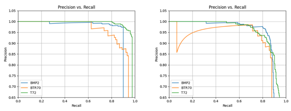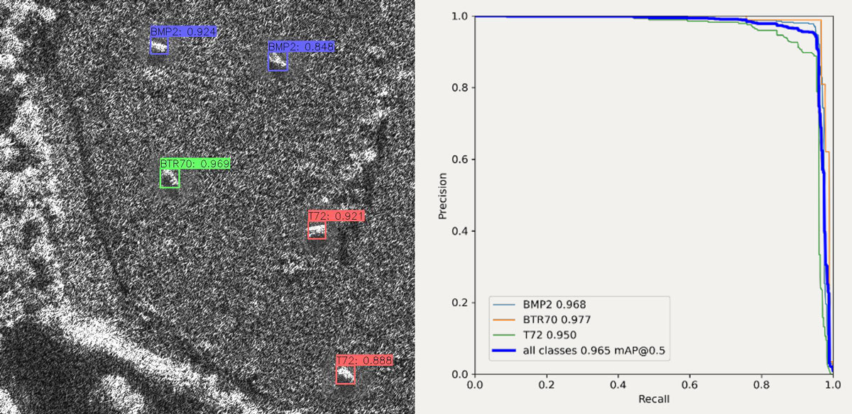 A A A Volume : 45 Part : 1 Proceedings of the Institute of Acoustics Target recognition in SAR images with low SWAP processing hardware R. O. Lane, QinetiQ, Great Malvern, UK W. J. Holmes, QinetiQ, Great Malvern, UK T. Lamont-Smith, QinetiQ, Great Malvern, UK 1 INTRODUCTION Synthetic aperture radar (SAR) is a useful surveillance sensor due to its high resolution, long range, and day/night capability. Recent progress in machine learning (ML) means more processing tasks can be automated than previously. Target detection and classification is of particular interest. However, much modern ML research relies on powerful processing hardware, making use of cloud processing and data centres. This type of system can be used in strategic settings, where data is sent to a central point, but there is a requirement for low size, weight, and power (SWAP) solutions where on-board processing is needed to reduce dependency on tactical comms channels, which may have low bandwidth or be denied in combat situations. For example, instead of transmitting a high bandwidth raw data stream, just metadata for detected objects could be transmitted. We compare the performance of three object detection and classification algorithms applied to SAR data on low-SWAP hardware. The remainder of this paper is organised as follows. Section 2 describes algorithm and hardware selection. Section 3 describes the data collection process. Sections 4 and 5 describe the processing methodology and compare performance of the algorithms. Finally, conclusions are given in section 6. 2 ALGORITHM AND HARDWARE SELECTION The aim of target detection and classification, also known as object detection in the ML literature, is to process an image to produce bounding box coordinates for each object, a class label, and a confidence score. Post processing can be applied, such as thresholding confidence scores to trade true detection rates against false alarms, or tracking bounding boxes between successive video frames to provide smoother estimates. A literature review was conducted to find object detection algorithms appropriate for application on low-SWAP hardware1. Three algorithms were identified as being particularly suitable: You Only Look Once (YOLO)2, RetinaNet3, and EfficientDet4. These algorithms were designed to attain high accuracy while having low computational cost5. Various versions of YOLO have widely been used as baselines for comparison with other algorithms. This paper examines the small (s) and extra-large (x) versions of YOLOv5, and compares the performance of these models with RetinaNet and EfficientDet, using different hardware platforms when applied to SAR data. A review of low-SWAP edge computing devices was conducted1. The aim was to select a particular single-board computer (SBC) to demonstrate operation of the algorithms. An SBC is a complete computer built on a single circuit board, with microprocessor(s), memory, input/output, and other features of a functional computer. SBCs have a high level of integration and low component counts. This gives them a lower SWAP than comparable multi-board computers. The Nvidia Jetson Xavier NX was selected as it has a good trade-off compared to other options: small size (70 mm x 45 mm); low mass (24 g); medium power consumption (10-15 W); high processing ability (6000 GFLOPS with 384 CUDA cores); low cost; and good support. A developer kit form factor of the board was used, as the aim of this work was to rapidly test a proof of concept, rather than develop a productionized system for deployment. It is expected that bespoke hardware solutions could further improve the power efficiency of the system. Computation of power efficiency for each algorithm was out of scope for this work. 3 SAR DATA AND SIMULATION METHODS Comprehensive SAR data sets with annotated objects in large scenes were not available. Therefore a data set was made by combining available background scene data with target vehicle information from the public release of the moving and stationary target acquisition and recognition (MSTAR) data set6,7. The output was a new data set of large scenes containing multiple target vehicles. This hybrid approach of merging datasets based on real measurements has successfully been used for other sensing modalities, such as infrared8 and measurements of electrical device current usage9. The background scene data was selected as follows. QinetiQ owns a number of SAR datasets collected under various UK MOD programmes. A particular set of clutter images, with aerial landscape views containing no targets, was identified for use. This dataset was collected during field trials in 2010 using the PodSAR radar mounted on a Tornado aircraft. The images primarily consist of fields, trees, hedges, bushes, and roads, with a few buildings or structures. Seven large images were identified as shown in Table 1. Image Name Width (pixel) Height (pixel) Pixel Spacing (m) Radar Resolution (m) Train/Test 4005 Fibua 2622 11978 0.261 0.3 Train Larkhill 1 3200 4162 0.255 0.3 Train Larkhill 2 3366 4024 0.255 0.3 Train Larkhill 3 3158 4098 0.255 0.3 Validate Stonehenge 2010 12070 0.263 0.3 Train Stonehenge 2 1752 5580 0.263 0.3 Train 6006 23940 (9*2660) 14204 0.376 x 0.407 0.428 x 0.466 Test Table 1: QinetiQ SAR clutter dataset; pixel spacing and radar resolution are listed as width (azimuth) x height (range). To ensure that no information about the background can leak into decisions on whether a target is in the scene, the first six images were used in training and the final image used in testing. One of the training images was designated to provide the validation set to optimize algorithm hyper-parameters. The test image has a higher contrast than the training images. It also exhibits a meandering beam pattern as the strip-map collection took place over a distance of about 9 km. These differences ensure that reported results are not over-trained to particular image characteristics. As the test image is very wi