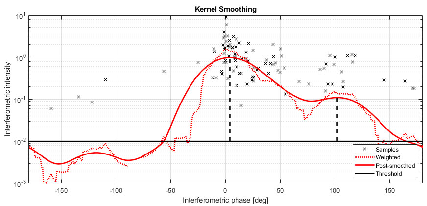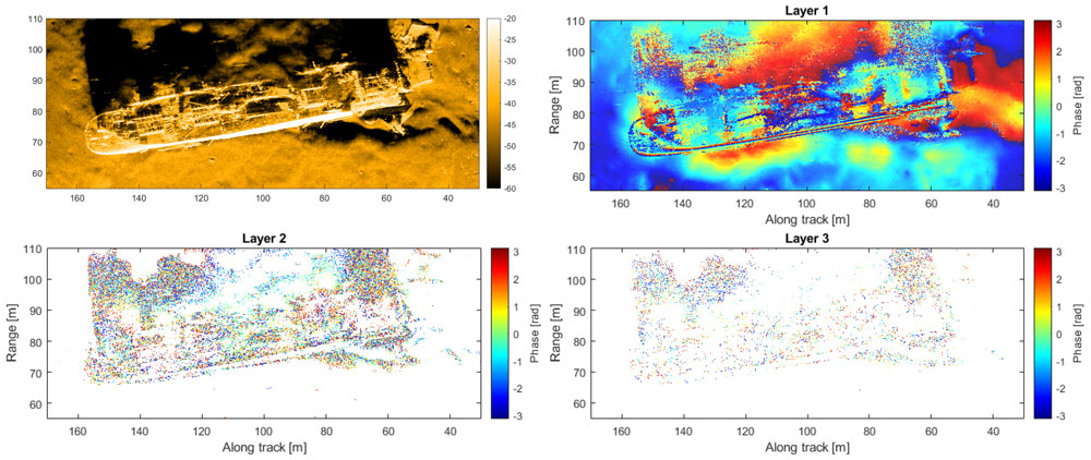 A A A Volume : 45 Part : 1 Proceedings of the Institute of Acoustics Separation of layover in synthetic aperture interferometry Stig A. V. Synnes, Norwegian Defence Research Establishment (FFI), Kjeller, Norway Marc Geilhufe, Norwegian Defence Research Establishment (FFI), Kjeller, Norway 1 INTRODUCTION Synthetic aperture sonar (SAS)1 has become a well-established technique for underwater acoustical imaging of the seafloor. Recent 3D renderings of interferometric SAS recordings on ship wrecks have illustrated the huge potential of interferometric systems also for mapping of complex structures2. 3D renderings of ship wrecks, as the one we present in Fig. 1, have revealed a large number of valuable interferometric height measurements both on near vertical surfaces, and even in layover regions where multiple surfaces are overlaid in the SAS images. In some of the layover regions, the interferometric phase measurements appear to interchange between the different surfaces. In this paper we explore whether nearby measurements from interchanging surfaces can be extended to provide simultaneous measurements on multiple surfaces. We investigate the fundamentals of interferometry in layover regions, and also touch upon the potential bias that surfaces in a layover region might impose on the estimation of each other. Figure 1: 3D rendering of wreck 18 from the Skagerrak munitions dump site, illustrating the value of height measurements on elevated structures, and the potential of resolving multiple surfaces in layover regions2. The effect of layover is typically observed on man-made objects, as illustrated in Fig. 2, but it can also occur on steep terrain. The established method of obtaining height estimation from interferometric measurements exploits a cross-correlation based search over candidate lags3. However, such a search can resolve multiple heights in a layover region only with large separations between surfaces, where the absolute phase shift exceeds the range resolution4. We seek to advance on these limitations to resolve layover from shifts that are smaller than the range resolution. Furthermore, we aim to get the most out of a single-pass recording with an interferometric system, and therefore exclude multi-pass and multi-array techniques of both SAS5 and SAR6 in this study. We establish a theoretical foundation of our work, by building a statistical model of interferometric samples drawn from a layover region, assuming speckle image statistics on each surface. Using this model, we explore different methods for estimation of the interferometric phase related to each surface in a layover region. We expand on our previous findings7 on the topic, and suggest a robust method for separation of layover. Figure 2: Illustration of layover involving three surfaces observed at the same range: 1) Seafloor, 2) Hull, and 3) Deck. The performance of our suggested method is validated on simulated data. We find that the method efficiently separates overlaid surfaces of similar echo strength, but that its performance rapidly drops when surfaces of different echo strength are involved. Finally, we demonstrate the performance of our method on single-pass interferometric SAS data from a simple simulated scene and from real SAS data of a complex ship wreck. 2 MODELLING OF LAYOVER In this section we build a statistical model of interferometric samples from surfaces with speckle image statistics, covering both one surface and layover involving multiple surfaces at the same range. 2.1 Speckle image statistics Acoustical measurements of the seafloor are known to show speckle modulations on top of the seafloor texture and backscattering strength. These speckle variations originate from the superim posed backscattering of randomly distributed scatterers within each resolution cell8. The statistics of speckle is well known, and will be adopted for our study where we approximate that neighbour samples are drawn from the same speckle distribution. In the presence of layover, the contributions from each of the overlaid speckle surfaces are added together into a sample. We first summarize some of the statistical properties of speckle8: Samples drawn from a speckle distribution, s, belong to a circularly symmetric complex Gaussian distribution. The real and imaginary components of a speckle distribution thus form independent random variables drawn from the same zero-mean normal distribution: Re{a} and Im{a} ∼ N(μ = 0, σ2). The normal distribution, N(μ, σ2), has the probability density function (PDF) with mean μ and variance σ2. Samples drawn from a speckle distribution are uniformly distributed in phase and Rayleigh-distributed in amplitude: |a| ∼ Rayleigh(σ). The PDF of a Rayleigh distribution is with mean value of . The resulting intensity, |a|2, of the speckle distribution samples is exponentially distributed, |a|2 ∼ Exp(λ), with λ = 1/(2σ 2), or σ = . The PDF of an exponential distribution is with mean value 1/λ. The mean of the exponential distribution is related to the mean of the Rayleigh distribution, which in turn is closely related to the acoustical backscattering strength. 2.2 Interferometry on layover We model the data recorded at the two vertically displaced receivers, s1(t) and s2(t) as a weighted sum of three normalized time series a(t), b(t) and c(t) at receiver 1, and as a shifted combination at receiver 2. In addition, we model different realizations of white Gaussian noise, ni (t), added at the two receivers: where τa, τb and τc express the different shifts (or delays convertible to depression angles) related to each surface3. The interferometric collection geometry is chosen such that corresponding pixels from an inter ferometric pair of SAS-images will contain the same realization of the speckle statistics after co registration. We assume that the signals are co-registered to within a fraction of the resolution cell, through delaying by τ(t). Such simultaneous co-registration 