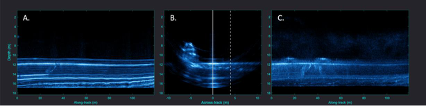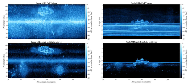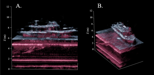 A A A Volume : 45 Part : 1 Proceedings of the Institute of Acoustics Augmentation of down-looking 3D SAS data with a high frequency multibeam sonar TM Marston, The Applied Physics Laboratory, University of Washington, Seattle, WA, USA KL Williams, The Applied Physics Laboratory, University of Washington, Seattle, WA, USA B Brand, The Applied Physics Laboratory, University of Washington, Seattle, WA, USA N Michel-Hart, The Applied Physics Laboratory, University of Washington, Seattle, WA, USA INTRODUCTION The Buried Object Scanning Sonar (BOSS) is a low frequency down-looking synthetic aperture sonar (SAS) that creates volumetric imagery by combining an along-track synthetic aperture with an across track real aperture.1 The low frequencies transmitted by the BOSS allow for significant acoustic penetration into sediment, enabling imaging of the sediment volume and detection of buried objects. In sediments presenting a small impedance discontinuity with the water, the precise location of the interface may be difficult to discern, especially in off-nadir directions where no specular backscattering contributions from the interface exist. In this case an accurate estimate of the burial depth of a detection – an important parameter for remediation – can be difficult to ascertain from volumetric imagery. One method for mitigating this issue is to augment the volumetric data with surface detections from a multibeam sonar. Not only does this mitigate the issue of water/sediment interface location ambiguity in the low frequency volumetric BOSS imagery, but it simplifies and enables the automation of near-surface feature extraction from the volumetric imagery. This paper describes the mechanical integration of a multibeam sonar onto a multi-sensor platform developed at the Applied Physics Laboratory, University of Washington (APL-UW) for detecting and classifying unexploded ordnance (UXO). Subsequently, data-fusion combining the output of the multibeam sonar with data simultaneously captured by a buried object scanning sonar mounted on the same sensor platform will be demonstrated. MULTIBEAM INTEGRATION ON THE MULTISENSOR TOWBODY The Multi-Sensor Towbody (MuST) is a sensor platform built around a MacArtney FOCUS 3 Towbody. The platform, developed by APL-UW via funding from the Strategic Environmental Resource and Development Program (SERDP) and Environmental Security Technology Certification Program (ESTCP), was designed for the detection and classification of proud and buried UXO,2,3 but has also been used for detailed sub-sediment survey applications and cable tracking. The acoustic UXO detection sensors on the platform include a Edgetech Buried Object Scanning Sonar (eBOSS), a dual frequency high resolution sidescan sonar also manufactured by EdgeTech and, most recently, a Reson T50 multibeam sonar. Position augmentation sensors, including an IXblue Rovins Nano inertial navigation system (INS) and Teledyne Pathfinder Doppler velocimeter (DVL), are also integrated onboard the system and are used for determining the underwater location of the towbody. A dual GPS antenna is used for positioning when the towbody on the surface. Figure 1 shows two annotated CAD drawings of the MuST. The main frame, resembling a box-kite, is composed of the FOCUS 3 towbody. The FOCUS 3 has control surfaces for controlling the roll, pitch and heading of the towbody, as well as changing the depth and steering port to starboard. As annotated in the figure, various sensors for UXO detection are mounted onto this towbody. Figure 1: A CAD model of the MuST towbody viewed from the front (A) and from beneath (B). Navigation systems, including an INS, DVL and GPS (for when the system is on the surface) are annotated. The location of the sidescan arrays on the nacelles are indicated, and the eBOSS and multibeam sonars are visible in the figure on the right. For scale reference the eBOSS array is 1.6 meters wide. The acoustic sensors integrated on the MuST are all mounted on the lower side of the towbody, with the sidescan sonar arrays being mounted on the outside of the lower port and starboard nacelles and the eBOSS, DVL and Multibeam being combined on the underside in a mechanical fairing. Along with the other sensors, the multibeam has a dedicated gigabit Ethernet channel used to stream data and communicate top-side with the ship. The data streams from the various sensors on the towbody are received by a data hub in the ship main lab where they are simultaneously recorded and redistributed for the purpose of real-time processing and display for towbody control and monitoring. Timing for the multibeam, INS and onboard sensors is performed via a Network Time Protocol (NTP) server, with the Multibeam having an additional 1PPS trigger to lock in the timestamps. LAKE WASHINGTON DATA FUSION TRIALS Lake Washington, located near APL-UW, is a large body of freshwater that has been used as a testing and performance verification site for the MuST. The lake, formed from a glacial trough, has an approximate surface area of 89 km2, a maximum depth of 65 meters,4 and a large number of natural and man-made targets of interest including many shipwrecks, plane wrecks and man-made debris. Strong currents are not present in the lake, and the average water residence time is approximately 2.3 years.5 The lake has undergone significant limnological changes over the last ~70 years, primarily as a result of fluctuations from phosphorous loading.5 Fine particles deposited from the Cedar and Sammamish rivers and local tributaries have formed a silty layer over much of the lakebed.6 Acoustically, this silty layer has a very similar acoustic impedance to water and, in the operational band of the MuST, appears very nearly acoustically transparent. Though a weak specular scattering contribution is often detectable, very little scattering from the surface or volume is present off nadir. Figure 2 illustrates this, showing along track vertical slices capt