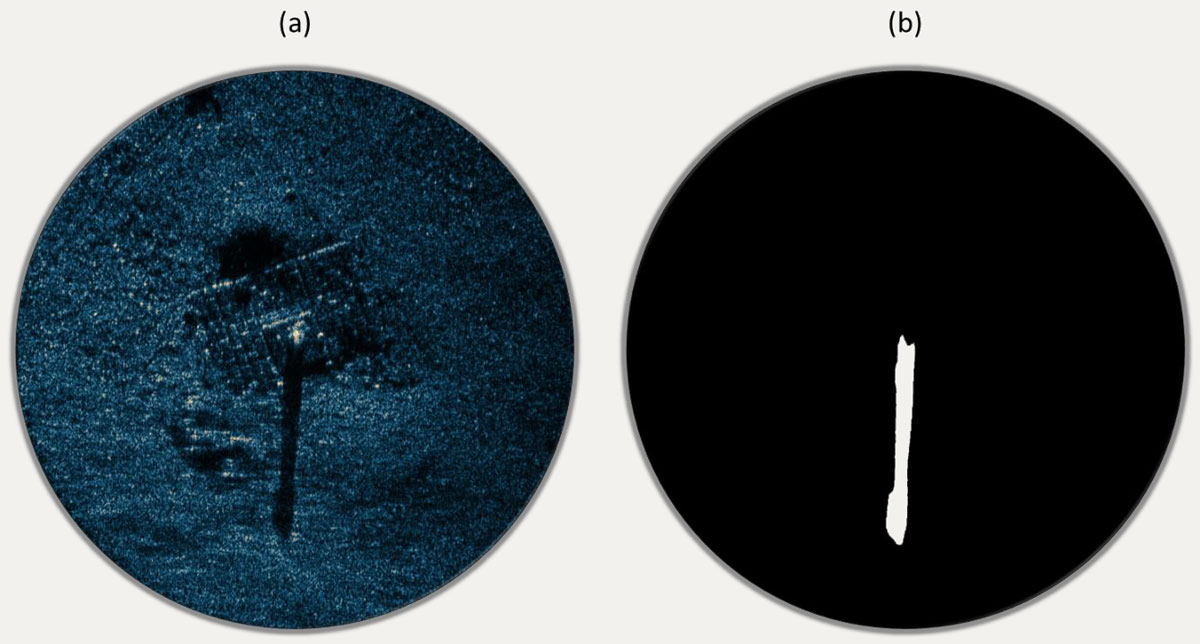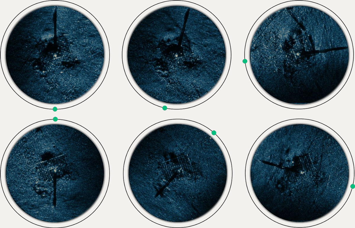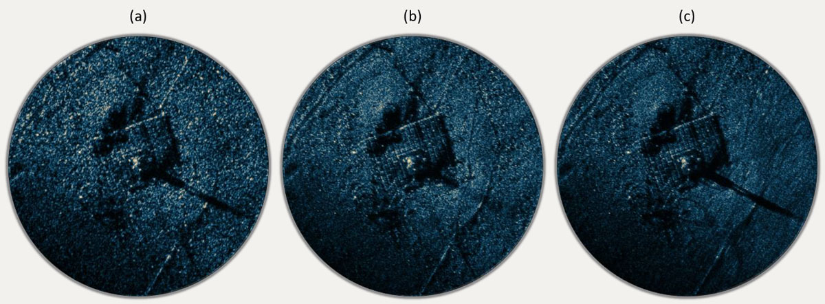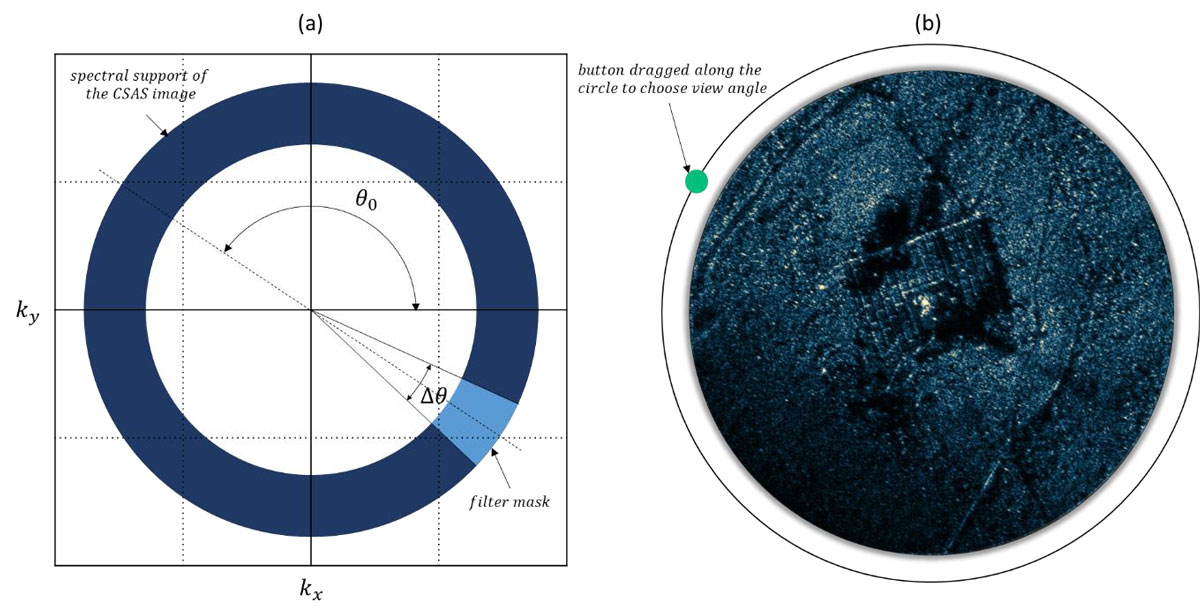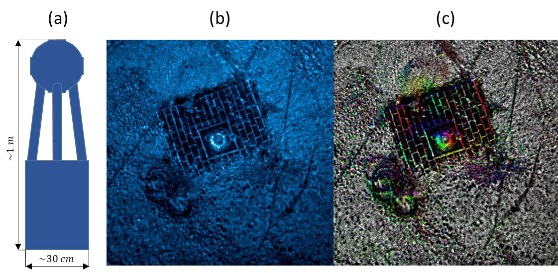 A A A Volume : 45 Part : 1 Proceedings of the Institute of Acoustics Using shadows in circular synthetic aperture sonar imaging for target analysis Yann Le Gall, General Sonar Studies, Thales DMS France SAS, Brest, France Nicolas Burlet, General Sonar Studies, Thales DMS France SAS, Brest, France Mathieu Simon, General Sonar Studies, Thales DMS France SAS, Brest, France Fabien Novella, DGA Naval Techniques, Brest, France Samantha Dugelay, General Sonar Studies, Thales UK, Templecombe, UK Jean-Philippe Malkasse, General Sonar Studies, Thales DMS France SAS, Brest, France 1 INTRODUCTION Circular Synthetic Aperture Sonar (CSAS) is an innovative adaptation of Synthetic Aperture Sonar (SAS) that leverages circular trajectories around targets to enhance resolution. While conventional SAS systems are limited by the horizontal aperture of the transmitter, CSAS overcomes this limitation by continuously illuminating an area of interest along the entire trajectory. As a result, CSAS achieves a significantly smaller theoretical resolution limit, offering improved imaging capabilities [Pailhas, 2017]. However, achieving this theoretical resolution limit in CSAS can be challenging due to errors in trajectory estimation, resulting in a loss of focus in the synthetic array [Billon and Fohanno, 1998]. The ability to maintain a focused synthetic array throughout the circular trajectory is particularly demanding. To address these challenges, various advancements have been proposed. Autofocusing techniques correct the focus aberration caused by phase error accumulation, resulting in well-focused CSAS images [Callow et al., 2010; Marston et al., 2014; Marston and Kennedy, 2021]. Additionally, multi-look processing [Fortune et al., 2003] has been introduced to reduce image speckle and improve image quality. CSAS scans produce high-resolution, low-noise images with sharp edges, making them valuable for target identification. This imaging technique finds applications in scenarios where swift reacquisition of critical targets is essential, long standoff distances are required, or poor water clarity precludes the use of optical systems. Despite these advancements, CSAS images tend to flatten information, diluting aspect-dependent responses into a single image. To address this limitation, color-by-aspect (CBA) processing has been proposed, encoding the dominant backscattering angle using hue [Plotnick and Marston, 2018]. However, while this method significantly improves aspect-dependent information, it does not fully recover all aspect-dependent characteristics. Notably, in CSAS processing, the circular displacement of the illuminator introduces parallax, filling in shadow regions and causing the loss of target shadows on the seafloor. Shadows provide valuable information about target size and shape, which is essential for target recognition. In conventional side-scan sonar, shadow shape analysis plays a crucial role in target recognition processes and automatic recognition algorithms [Fohanno et al., 2010][Myers and Fawcett, 2010]. This paper introduces an interactive viewer that facilitates the exploration of the acoustic response of the target as a function of orientation. Futhermore, we propose a method to retrieve shadow information from CSAS data to enhance target analysis and enable 3D reconstruction. We employ sub-aperture filtering to generate a collection of images from various points of view along the circular trajectory, and we apply shadow enhancement to obtain well-defined shadows. These resulting images are integrated into the interactive viewer, enabling easy probing of target shadows as a function of orientation. Finally, a space-carving reconstruction method is employed to infer the 3D shape of the object from the shadows. The results demonstrate the potential of shadows in circular SAS for improving target analysis and enabling 3D reconstruction. The outline of this paper is as follows. Section 2 introduces the application of CSAS to SAMDIS array data with conventional multi-look processing and CBA. In Section 3, we introduce our CSAS slider, which allows for interactive exploration of target responses, and our approach for enhanced shadow visualization in CSAS imaging. Finally, in Section 4, we showcase our method for 3D reconstruction using the retrieved shadow information. Overall, this research aims to advance CSAS imaging techniques by incorporating shadow information, enhancing target analysis, and facilitating accurate 3D reconstruction. 2 CSAS APPLICATION TO SAMDIS DATA The Synthetic Aperture Mine Detection and Imaging System SAMDIS is a versatile mine warfare sonar that offers multiple imaging modes and high-resolution capabilities [Chabah et al., 2016; Delayes et al., 2022; Malkasse et al., 2023]. It can produce real-time imagery up to 2.5cm resolution along the track and 1.25cm resolution across the track. The system addresses the need for confidence in Mine Counter Measure (MCM) operations by employing a multi-aspect single-pass imaging mode that provides performance equivalent to conducting three surveys with different track orientations in a single coverage. This mode enables effective mine hunting in various environments. SAMDIS is adaptable to different platforms and missions, with varying payload lengths that can be integrated onto towed bodies or Autonomous Underwater Vehicles (AUVs). Additionally, SAMDIS has the potential to support Circular SAS processing. In winter 2019, sea trials were conducted to collect data along a 360° circular trajectory with a 75m radius around a known target. The target is depicted in Figure 1-(a). It is positioned at the center of a 3π × 3π grid which consists of individual 20ππ× 50ππ concrete blocks. The acquired data underwent Circular SAS processing. The results are presented in Figure 1-(b)(c). The Figure 1-(b) displays the Circular SAS image after applying multi-look processing to reduce speckle, while Figure 1-(c) displays the color 