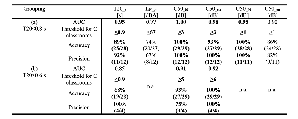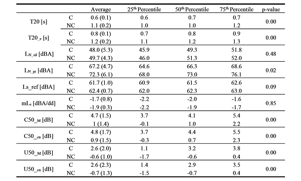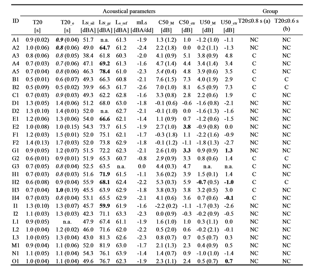 A A A Volume : 44 Part : 2 Proceedings of the Institute of Acoustics A basic protocol to characterize classroom acoustics of primary schools Arianna Astolfi1, Politecnico di Torino, Torino, Italy Greta Minelli2, Politecnico di Torino, Torino, Italy Giuseppina Emma Puglisi3, Politecnico di Torino, Torino, Italy ABSTRACT With the aim to promote a fast and effective characterization of the sound environment in educational facilities and an adequate classroom acoustics design, this work provides a basic measurement protocol which consists of a minimum number of parameters and positions to be considered. The present study involved 29 primary-school classrooms where background noise level during silent and group activities, reverberation time, speech clarity, useful-to-detrimental ratio and speech levels have been acquired in occupied condition along the main axis and in one or two offset positions. Two cut-off values of maximum reverberation time to ensure optimal acoustic conditions in the case of moderate and severe requirements, respectively, were assumed equal to 0.8 s and 0.6 s, according to literature and subjective data. For each cut-off value, classrooms were divided in two consistent groups either if they were compliant or non-compliant with such requirements, respectively. Given the strong correlation among the measured quantities, cut-off values were also identified for the other acoustical parameters. The main result of the work suggests that more convenient parameters, such as clarity in the central location of the classroom, can be used beyond reverberation time, which implies a more laborious measurement procedure. 1. INTRODUCTION The scope of the present work has been to identify the basic parameters and their optimal values necessary to fast and effectively characterize the acoustic quality of parallelepipedal shaped primary school classrooms with small and medium volumes, i.e., between 100 and 290 m3. The study arises from the awareness that many of the available indexes and parameters used for classroom acoustic characterization are closely correlated. On the basis of this knowledge, which is well-supported by literature, there is a need to advance such characterization practices by simplifying the measurement protocols in order to save time and to allow wide experimental campaigns to be made to certify a higher number of classrooms. To this aim, 29 primary classrooms in Turin, Italy, which are heterogeneous in terms of building typologies and acoustic conditions, have been considered in this study. The database we used in Astolfi et al. (2019) [1], has been enlarged in this work, although we have used the same protocol. 2. MATERIALS AND METHODS Measurement campaign were carried out in 29 first-grade classrooms belonging to 13 primary schools in Turin, where about 550 pupils aged from 6 to 7 years participated in this study over three scholastic years, that is, from 2016 to 2019. 2.1. Schools and Classrooms The location, periods of construction and architectural features of the 29 schools involved in the present study differ. Moreover, they were built between 1846 and 1975, and are scattered over the city of Turin, in neighborhoods characterized by low or medium volumes of traffic [2]. The classroom volumes vary between 105 m3and 290 m3, and all the classrooms, except one (G1), have a rectangular shape. The average height of the classrooms ranges from 3.0 m to 5.3 m, and the ceilings are flat or vaulted. The floor finishes are venetian tiles, except for in one case (H1), which is instead in linoleum. The furniture consists of desks and chairs, bookshelves and blackboards. Some classrooms have undergone acoustic correction interventions. 2.2. Characterization of the Classroom Acoustics We performed the acoustic measurements in one-day in each school in the last two months of the school year, over three scholastic years, that is, from 2017 to 2019. We carried out the measurements under occupied conditions, with an average number of 19 children per class. We also measured the reverberation time under empty conditions, at the end of each session. The pupils were seated in the traditional teaching layout (in rows facing the teacher’s desk) in all the classrooms, with three or four rows of desks in each classroom, which were sometimes joined. The teacher’s desk was parallel to one of the shorter walls in each room, except for in E2, where the teacher’s desk and the blackboard were parallel to the longer side of the room, for teaching purposes. We identified the main axis in each classroom,starting from the center of the wall behind the teacher’s area. Details of the measurements, set-up and equipment can be found in Astolfi et al. (2019) [1]. The parameters that were measured are: T20, which is the reverberation time when children are in a class room; T20_e, which refers to the empty conditions; LN_sil, which is the noise acquired when the stu dents are silent and LN_gr, which is the noise acquired while the students are performing group activities. Moreover, the speech level was recorded at 1 m from the source, LS_ref, and then in the other positions, and its slope per double distance along the main axis, mLS, was evaluated; speech clarity and the useful-to-detrimental ratio referred to the mean distributions in the classroom and were la beled with the subscript “M”, e.g., C50_M and U50_M, or referred to single values in the center of the classroom, which were labeled with the subscript “ctr” , e.g., C50_ctr and U50_ctr. 2.3. Statistical Analysis The statistical analysis was carried out with SPSS (IBM Statistics 20, IBM, Armonk, NY, the USA). Once we had checked that the distribution of the database was non-normal, non-parametric methods were used to analyze the data. We investigated any correlations between the acoustic parameters by means of Spearman’s rho [3], and further analyzed those with a p-value < 0.01 through linear regression analysis. We then divide