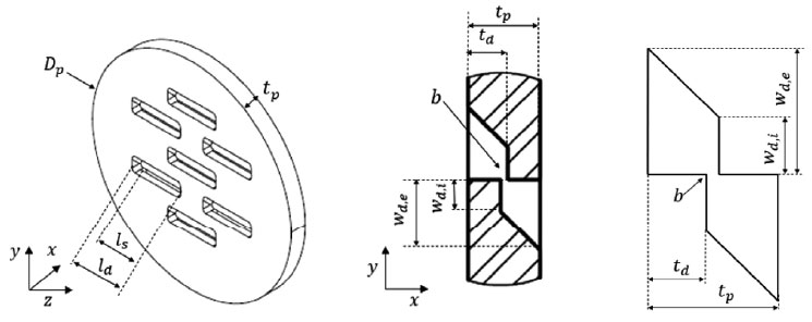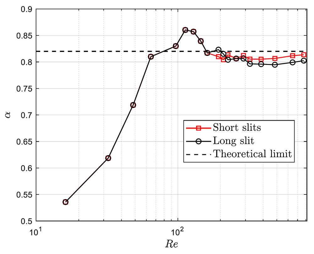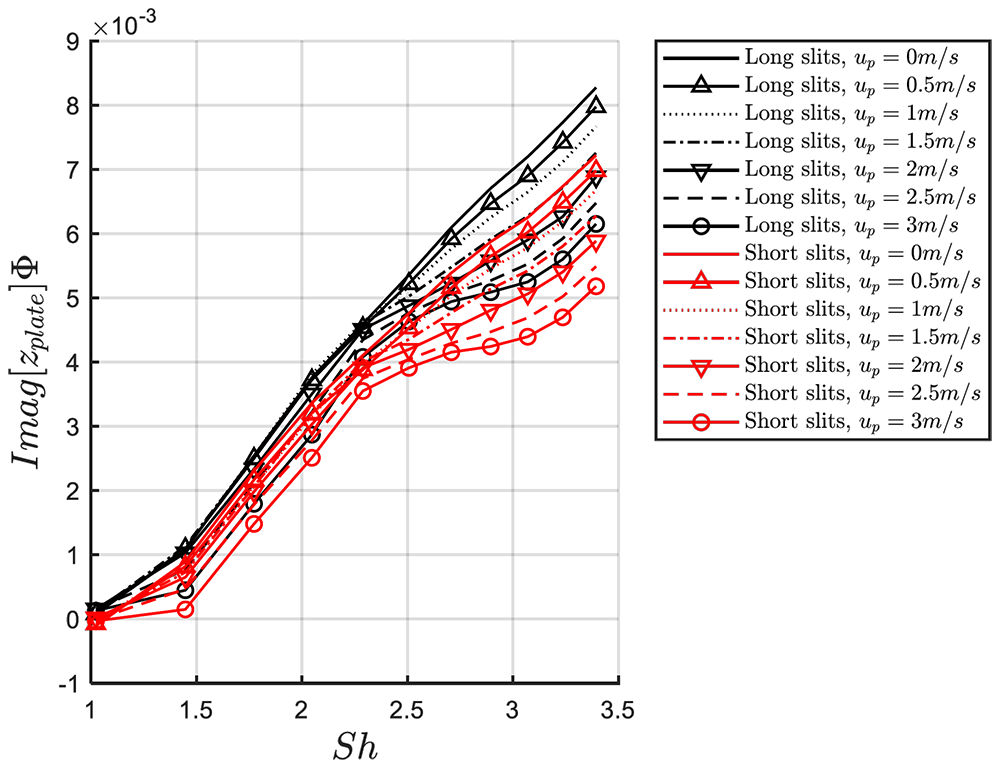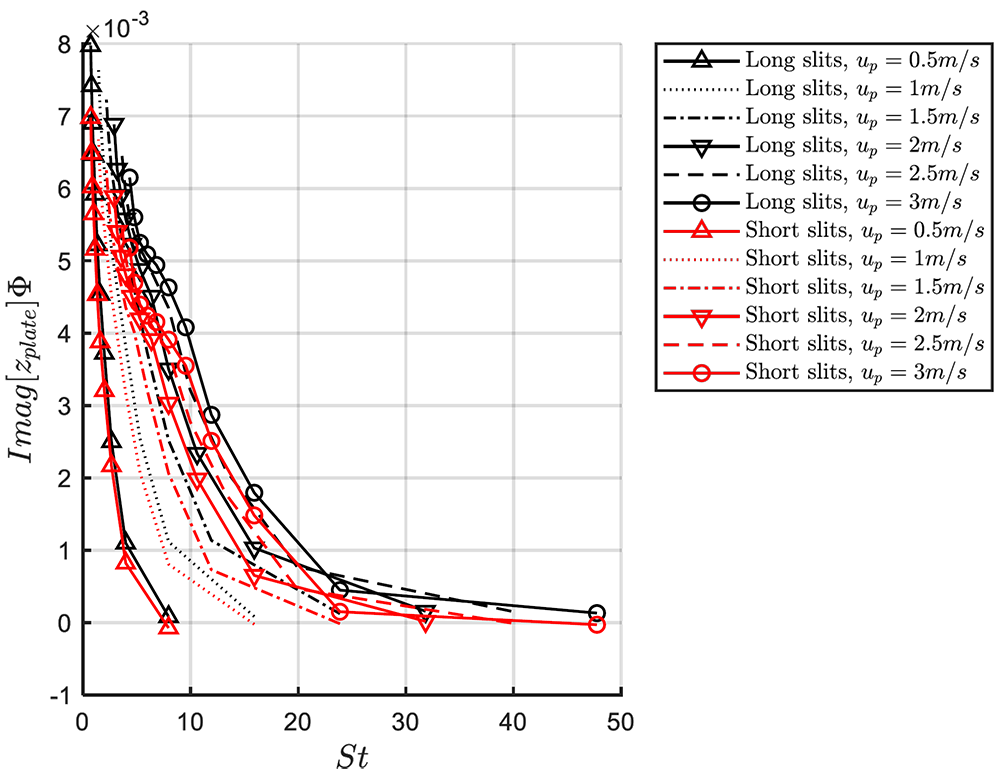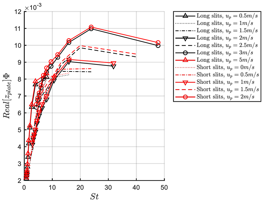 A A A Volume : 44 Part : 2 Proceedings of the Institute of Acoustics Non-linear behavior of the transfer impedance of a Micro-Slit-Plate: effect of slit length in presence of a bias flow Alessia Aulitto1, Eindhoven University of Technology, Eindhoven, The Netherlands Vertika Saxena, Eindhoven University of Technology, Eindhoven, The Netherlands Avraham Hirschberg, Eindhoven University of Technology, Eindhoven, The Netherlands Ines Lopez Arteaga, Eindhoven University of Technology, Eindhoven, The Netherlands ABSTRACT The influence of the slit length in presence of bias flow for a micro-slit plate (MSP) is investigated. MSPs are plates with arrays of slit-shaped perforations, with width of the order of the acoustic viscous boundary layer thickness. Micro-slit plates can be used for passive noise control of thermo-acoustic instabilities in combustion processes. During these processes, high amplitudes acoustic waves are generated and impact on the plates. The geometry discussed in this work is typical for manufacturing by cutting and bending the plate, without removing material. In previous works, in presence of high acoustic amplitudes, a significant difference between short and long slits was observed. In this work, the influence of a bias flow is investigated. This bias flow can also be used to control the wall temperature in hostile environment or for air-conditioning. Impedance tube measurements of the transfer impedance on accurately manufactured micro-slit plates in presence of bias flow have been performed. It appears that the presence of flow does not reduces the effect of the slit length on the transfer impedance of the micro-slit plate at high acoustic amplitudes. 1. INTRODUCTION Micro-slit absorbers and plates (MSAs, MSPs) have been proposed as sound absorbers at low frequencies, providing lightweight and compact solutions to substitute conventional materials [1]. MSPs are plates with slit width b in the sub-millimeter range and low porosity (order of 1%). The slit width is of the order of the viscous-boundary-layer thickness 𝛿𝑣. Hence, the ratio between the slit width and the viscous boundary layer thickness 𝛿𝑣, the so-called Shear number Sh = b/δv, is of order unity. In conventional designs, micro-slit plates are backed by a cavity forming micro-slit absorbers (MSAs) [1-3]. In many applications one can expect the presence of a main flow along the perforated wall or a bias flow through this wall. This is for instance the case in combustion chambers where bias flow is used to cool the wall. In Aulitto et al. the linear and non-linear transfer impedance for a given design of a micro-slit plate is investigated in the absence of flow [4]. The effect of the slit length is discussed. In the present work, the effect of the slit length is investigated in presence of bias flow for a given (high) acoustic excitation. Impedance tube measurements are used to investigate the effect of the slit length by comparison of results for two accurately manufactured micro-slit plates. The edges of the slits are kept as sharp as possible. Both plates have the same porosity and total slit perforation length. The behavior of slits in presence of a grazing flow is studied in several publications. Systematic measurements in the linear regime are provided for grazing flow by Kooijman et al. and for combined grazing/bias flow by Tonon et al. and Moers et al. [5-6-7]. Tam et al. perform numerical simulations of the flow field around a slit resonator in the presence of a grazing flow under acoustic forcing [8]. Dai et al. propose a numerical study of the acoustical response of a slit with a mean bias flow by means of a potential flow model [9]. Vandemaele et al. consider the linear, flow acoustic behavior of a slit resonator, mounted at the side of a flow duct, under grazing acoustic excitation [10]. Several publications investigate the effect of a bias flow for circular perforations and micro-perforated plates [11-17]. The present paper is structured as follows. In Section 2, the main parameters and dimensionless numbers are presented. In Section 3, the experimental setup and the geometrical properties of the samples are described. In Section 4, results of impedance tube measurements for a given amplitude are presented for different bias flow velocities. In the last section, conclusions are summarized. 2. DEFINITIONS OF MAIN PARAMETERS In the linear regime, dissipation of acoustic energy takes place in the oscillating boundary layer of thickness , where ω = 2π f is the angular frequency, ρ is the air density (ρ = 1.18 kg/m3at 25° and atmospheric pressure) and μ is the dynamic viscosity of air (μ = 1.85 × 10−5 kg/ms at 25°). The ratio between the slit width b and the thickness of the viscous boundary layer δv is the Shear number For micro-slit plates, typical Shear numbers, in the frequency range of interest, are of order unity. The behavior of the plate can be studied as a function of the Strouhal number St, defined as the ratio between the slit width b and the amplitude of the oscillating particle displacement in the slits. In formulas, where Up is the cross-sectional surface averaged flow velocity at the slit. The concept of transfer impedance is introduced in the frequency domain (for purely harmonic oscillations of frequency f). The transfer impedance of the plate is defined as the ratio between the complex acoustic pressure difference Δpො and the amplitude of the acoustical velocity uො in a pipe cross-section upstream from the plate. The dimensionless transfer impedance of the plate is where ρ is the density of air and c is the speed of sound in air. The dimensionless transfer impedance of the plate zplate is a complex quantity with i2 = −1, Real[zplate] the resistive part of the transfer impedance of the plate (or resistance of the plate) and Imag [zplate] the reactive part of the transfer impedance of the plate (or inertance of the plate). The transfer impedance of a sl