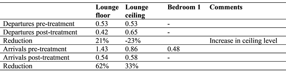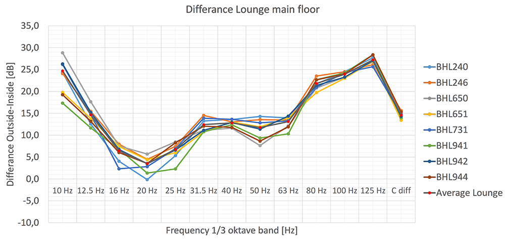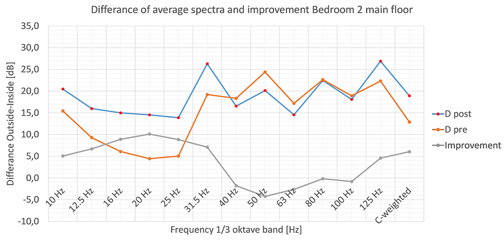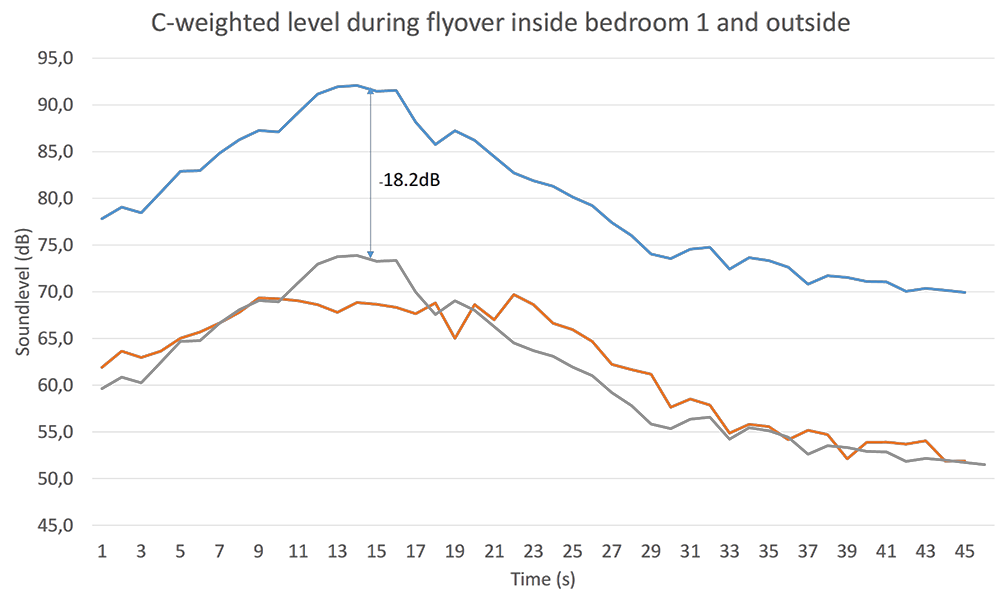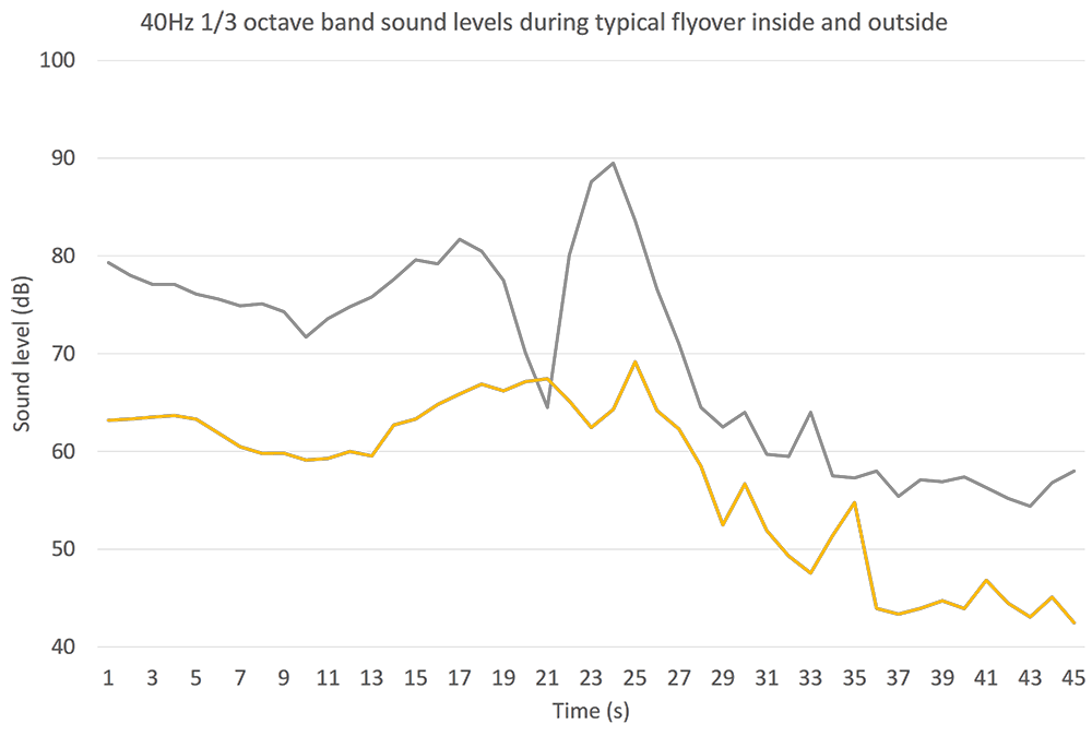 A A A Volume : 44 Part : 2 Proceedings of the Institute of Acoustics A practical method to increase the low-frequency sound insulation of timber frame constructions Michael J. Newman1, Avinor AS, Gardermoen, Norway Arild Brekke2, Brekke & Strand Akustikk AS, Oslo, Norway Ståle Ellingsen3, Brekke & Strand Akustikk AS, Oslo, Norway Frode Eikeland4, Brekke & Strand Akustikk AS, Oslo, Norway ABSTRACT Timber framed houses have little or no sound insulation at low frequencies. A significant set of noise sources emit loud low frequency noise and for some of these, the noise is single frequency or tonal. Improvement of the low frequency insulation has been shown using two methods: increasing the stiffness and applying vibration neutralizers to the structure of the house. A study was carried out on a wall element to assess the viability of the method in a simplified test facility. Impedance measurements were carried out on a test section consisting of 3 studs and panel construction. An initial field implementation has been carried out on a re-purposed dwelling at the end of the runway at Bergen’s airport. Reductions of the order of 5-10dB in the C-weighted indoor noise level have been achieved. The additional attenuation achieved using vibration neutralizers only has effect when the outside noise level exceeds 87dBC. 1. INTRODUCTION Sound insulation of timber frame constructions at low frequencies is limited or non-existent. This is due to the low mass, in comparison to brick, blockwork or concrete, and limited stiffness. A number of sources of environmental noise produce high levels of tonal noise at low frequencies, these include wind turbines, transformers, centrifugal fans for HVAC systems, propeller aircraft and helicopters. Other sources of high levels of broadband low frequency noise include boilers, emergency flares and fighter jets with afterburners. Previous work had been carried out on timber frame constructions to increase their sound insulation at low frequencies [1]. This indicated that increasing the stiffness of the wall gave an increase in the sound insulation at low frequencies. The intention of the work presented here was to increase the insulation for tonal noise at its fundamental and first harmonic. The increase in stiffness provided the basis to add vibration neutralizers [2-4] (tuned mass dampers) to the structure, the wooden structure was assessed as being too weak to add masses and springs at points in the structure. A FEM study was carried out on a wall model to identify suitable treatments and was followed up using a simplified test facility. Impedance measurements were carried out on a test section consisting of 3 studs and panel construction. Following this study, a field implementation was carried out on a re-purposed timber framed house at the end of the runway at Bergen’s airport. 2. NOISE CONTROL MEASURES The previous work had shown that increasing the stiffness of a timber framed structure can increase the sound insulation at low frequencies. Vibration neutralizers have been implemented on many structures to reduce vibration and noise since ca 1900 [2]. These include installation on aircraft [3], pump foundations [4] and may other structures. Their addition to simple timber framed constructions is not previously reported to our knowledge. Neutralizers are useful in controlling single frequency vibration and noise. Metal structures that they are made from have loss factors of 1% or less i.e., provide attenuation over a small bandwidth. The box section used to stiffen the wooden stud provided a good “foundation” in the structure to add the neutralizers, the original stud was not structurally strong enough to support the dynamic forces exerted by the neutralizers. The aim of the study was to assess the viability of the measures to attenuate noise from helicopters, in particular the Sikorsky S92 used for transport of personnel to offshore installations. The noise spectrum produced by the S92 is dominated by its low frequency content, the blade passage frequency of the main rotor (17.6Hz) and its first harmonic (35.2Hz). A section of wall between 2 storage rooms was adapted for testing the measures. The wavelengths in air of 17.6 and 35.2Hz are so large that standardized test facilities (reverberation chambers) are not suitable to carry out these tests. The test method, given by Norén-Cosgriff et al [1] using vibration and impedance measurements, was used to assess the improvements achieved by the measures. Impact excitation and mobility analysis was used to assess whether the improvement measures would give attenuation and which of them was most likely to achieve sufficient attenuation. The chosen measures were to add a steel HUP box section to the timber frame, increasing the stiffness by a factor of 7, and to add pairs of clump masses supported by 3 cantilevers from the box section tuned to 17.2Hz and 35.2Hz. 3. FIELD IMPLEMENTATION The field installation was carried out on a house built in 1957 and extended in 1977. The original construction is typical for the period with 100mm wooden studs and mineral wool insulation covered with plaster board and wood panel on the inside, building paper with air gap and weather boards on the outside. In 2004 the house received an initial round of noise control measures in the form of balanced ventilation, and a double layer of plasterboard on the outside of the studs. The windows were also replaced. The house is situated at the southern end of the runway and very close to the flight paths of the helicopters. The measures were applied to the outside of the walls by first removing the existing weather boards and plaster board. This exposed the original studs and insulation. To the studs, the HUP box section 60 x 40 x 3mm was attached with screws, an intermediate 1.8mm layer of Antifon was applied to increase damping and aid contact over the whole length of the box section. The masses were 60 x 60 x 270mm for the 17.6Hz 