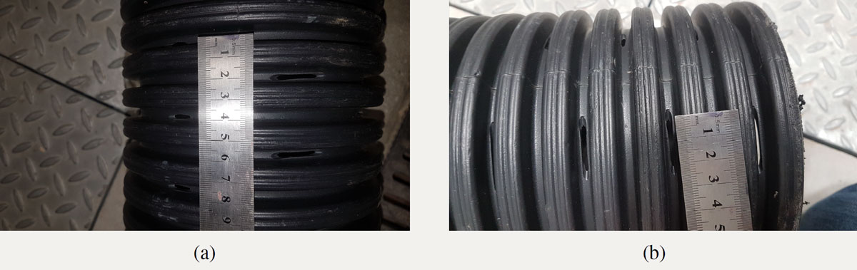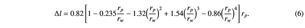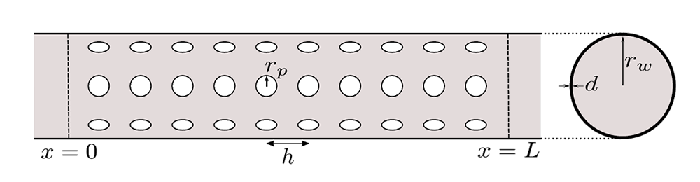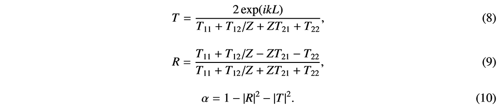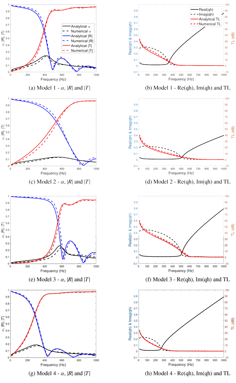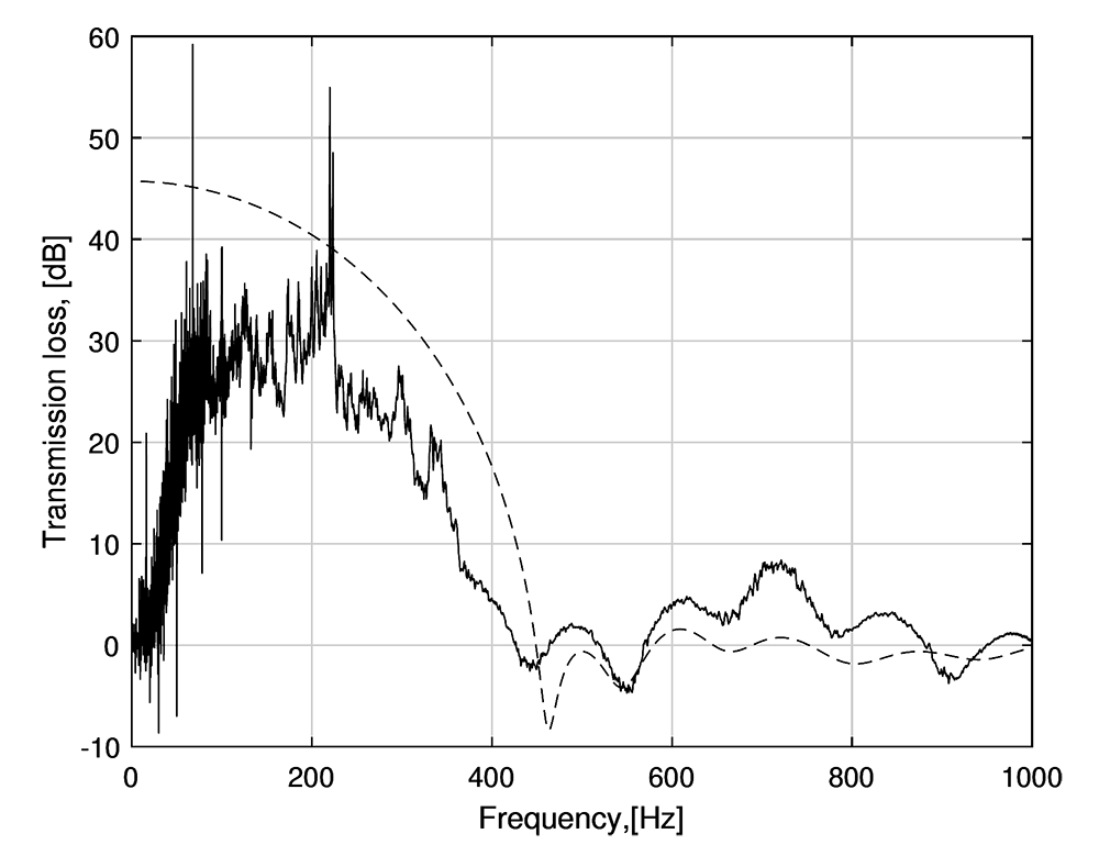 A A A Volume : 44 Part : 2 Proceedings of the Institute of Acoustics Low frequency attenuation of acoustic waves using sound-soft scatterers Alexander Dell1, University of Sheffield, Sheffield, United Kingdom Anton Krynkin, University of Sheffield, Sheffield, United Kingdom Kirill Horoshenkov, University of Sheffield, Sheffield, United Kingdom Gavin Sailor, University of Sheffield, Sheffield, United Kingdom ABSTRACT The attenuation of acoustic waves by silencers is typically achieved through the employment of rigidly backed cavities, connected to a main waveguide by a perforated panel. This invokes a resonant response at frequencies determined by the dimensions of the perforation and the rigidly backed cavity. A limiting factor in this approach is that to achieve low frequency attenuation, either large cavity depths are required, which is often impractical, or narrow neck regions need to be used, where performance is limited due to the viscothermal losses. Within this paper, a non-rigidly backed perforated pipe is presented where the pressure release condition at each perforation creates an acoustic sound-soft boundary condition. By the introduction of sound-soft boundary conditions, a low frequency band gap is created as the first order mode is shifted to a non-zero value, the frequency of which is determined by the dimensions and separation of the perforations. Experimental results displaying this band gap are presented along with a numerically validated ideal analytical model based upon the transfer matrix method. 1. INTRODUCTION The attenuation of acoustic waves by silencers is achieved through the employment of rigidly backed cavities, connected to a main waveguide by a perforated panel. For silencers with partitioned cavities with a single perforation, i.e. a Helmholtz resonator, excellent attenuation can be achieved at the resonant frequency of the resonator. For silencers with un-partitioned cavities and panels composed of multiple identical perforations along the length of the silencer, a similar phenomenon occurs. If the perforated separating panel has a low porosity, a Helmholtz resonator type of attenuation occurs. As the porosity increases, the silencer behaves more like an expansion chamber [1]. Different configurations of partitions can be used to alter the type and number of resonances and dissipative materials can be introduced to help achieve more broadband attenuation [2]. A limitation of these types of silencers is the requirement for large cavity volumes, or narrow neck regions, to achieve low frequency attenuation. A large cavity volume is often impractical for engineering applications and having narrow regions often results in poor attenuation of acoustic waves due to the incurred viscothermal losses. It has been theoretically shown that a sonic crystal in which the surfaces of each scatterer are modelled as sound-soft boundary conditions exhibit a non-zero first order mode [3]. Within this paper, an ideal analytical model based upon the transfer matrix method is presented. This model is validated for various geometrical configurations. Experimental evidence of a band gap produced by sound soft scatterers is also presented. This is for a non-rigidly backed perforated pipe in which the pressure release condition at each perforation creates an acoustic sound-soft boundary condition, thus turning each perforation into a sound-soft scatterer. 1.1. Finite periodic system of sound soft scatterers The transfer matrix method (TMM) provides the relationship between the initial sound pressure, p, and volume flux, V = vSa , where Sa is the cross sectional area and v is the acoustic particle velocity, at the start (x = 0) and at the end (x = L) of a medium in a duct [4]. To differentiate between the initial and end properties, the subscripts 0 and L are used, respectively. The transfer matrix, T, is derived under the assumption that only plane waves propagate through the medium in the x direction, meaning it provides the solution for a 1D wave propagation problem [5]. The general formulation of the transfer matrix is as follows; The transfer matrix for a single fluid layer is constructed as Here, Z = ρc/Sa is the characteristic impedance, k is the acoustic wavenumber and L is the length of the fluid layer. Consider a finite waveguide with n periodic arrangements of sound soft scatterers. Each unit cell has a length h. The general geometry of the system can be seen in Figure 1. The transfer matrix for the total system is given by Figure 1: Graphical representation of a finite system of sound soft scatterers. Mw is the transfer matrix for a fluid layer of length h/2 and Ms is given by where N denotes the number of scatterers per unit cell. The total length of the system L = nh. The characteristic impedance of a perforation with an acoustic soft boundary, Zs , is where Zp is the characteristic impedance, and kp is the acoustic wavenumber, of the fluid within the perforation. Additionally, ∆l is the length correction due to the pressure discontinuity between the perforation and waveguide, which is given by [6] Here rw is the hydraulic radius of the waveguide and rp is the radius of the perforation. The transmission loss (TL) of the total system can then be obtained as where Z is the characteristic impedance of the fluid within the waveguide. As this system is symmetric and isotropic, the transmission, reflection and absorption coefficients can be determined as 1.2. Bloch waves in an infinitely periodic structure Assuming plane wave propagation in a periodic waveguide, the Bloch Floquet theorem can be fulfilled such that the forward and backward propagating Bloch waves display the same dispersion. The Bloch dispersion relation can be found as [7] where q is the Bloch wavenumber and T is the transfer matrix for a single unit cell. The dispersion relationship for a periodic array of sound-soft backed perforations can then be expressed as 2. ANALYTICAL AND NUMERICAL RESULTS Here th