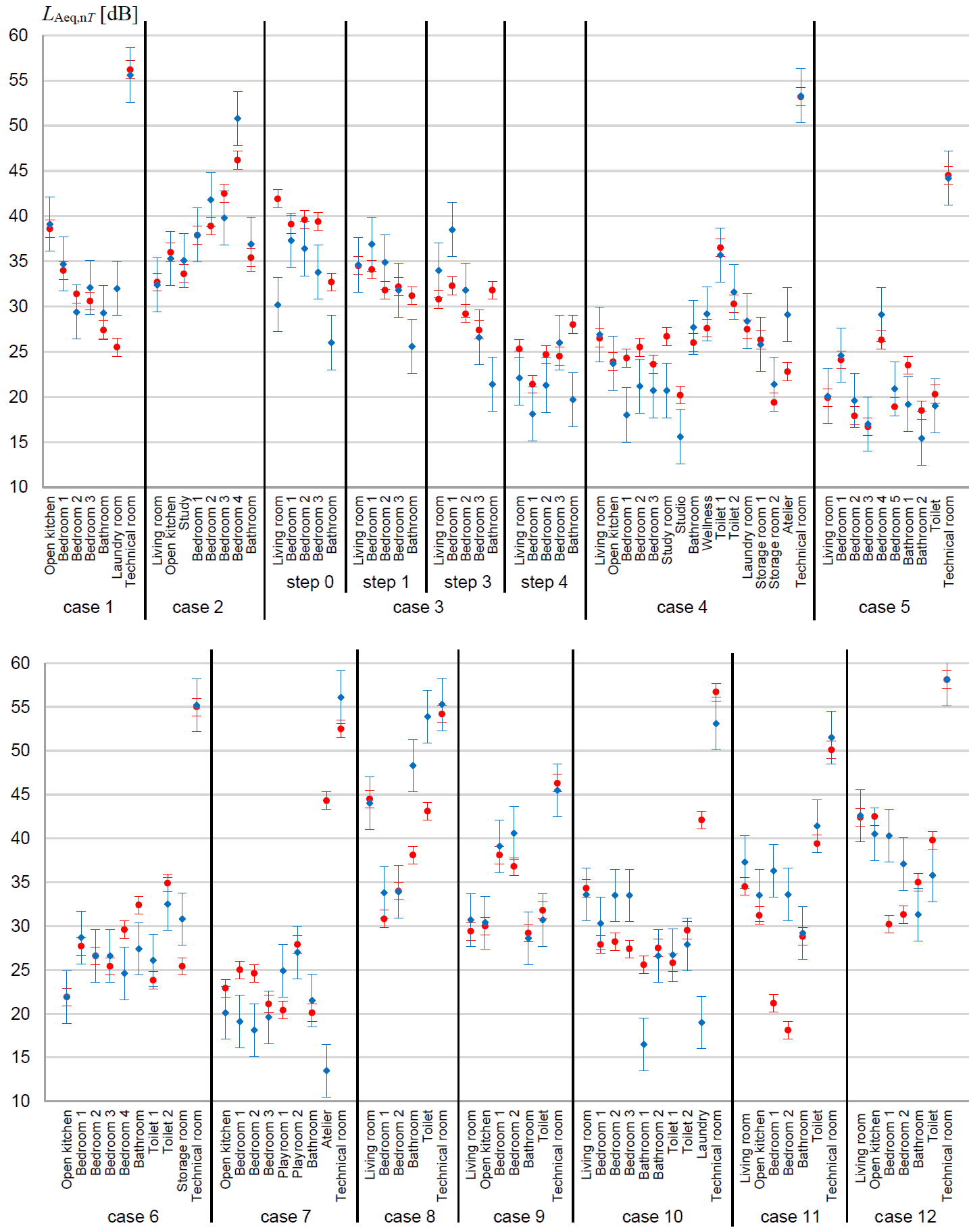 A A A Volume : 44 Part : 2 Proceedings of the Institute of Acoustics Prediction of the noise from mechanical ventilation systems in dwellings: case studies Arne Dijckmans1, Belgian Building Research Institute, Brussels, Belgium ABSTRACT Noise caused by mechanical ventilation systems in dwellings remains a common problem in practice. To help designers and installers, a simplified acoustic calculation tool has been developed which can be used without detailed acoustic knowledge. The tool is based on the prediction models in EN 12354- 5 and VDI 2081 and takes into account the airborne duct sound. The model has been validated by multiple case studies in dwellings. For each case study, the noise levels and airflow rates of the mechanical ventilation system have been measured in each room. Generally, the global A-weighted noise level is predicted with an accuracy of ± 3 dB, on the condition that the airborne duct sound is dominant and sufficiently accurate acoustical input data are available for key components like fans, silencers and air openings. However, some measurement results cannot be predicted by the simplified calculation framework, e.g. when turbulence in two closely placed fittings leads to additional flow noise. The uncertainty also increases when the fan sound is dominated by tonal components. 1. INTRODUCTION Noise is one of the key elements that determines the occupants satisfaction of mechanical ventilation systems in dwellings. Too noisy ventilation systems are often turned off by the users, which has a direct impact on the indoor air quality. Therefore, national standards and regulations impose maximum noise levels on ventilation systems in buildings. For small projects, the acoustical requirements are typically only accounted for by means of simple design guide lines and rules of thumbs (e.g. placing a silencer and limiting the air velocity). However, this does not necessarily guarantee that the ventilation system satisfies the acoustic requirements. To help designers and installers, we want to develop an acoustic calculation tool which can predict the acoustical performance with sufficient accuracy, but doesn’t require detailed acoustic knowledge from the user. Different acoustical design methods, software tools and guidelines exist. EN 12354-5 gives a general framework to calculate installation noise. Guidelines are given in various handbooks (often complementary to the standard and each other), like the German VDI [1], the American ASHRAE [2] and the Dutch ISSO [3]. Several questions arise when applying these calculation schemes [4]. The guidelines use simplified tables or empirical relations but their field and limits of application are not well known. Specific acoustic input data are often lacking for components used in ventilation systems (e.g. networks with manifolds). There is also a lack of confidence in the calculation process, as e.g. interaction between components is not considered. Previous and current research mainly focusses on improving the acoustic calculation methods for ventilation systems by addressing these issues. The ACOUREVE project [4] focused on improving the quality of the acoustical input data for components like junctions, bends, dampers and manifolds. Similarly, numerical analysis and laboratory measurements are being used to investigate the interaction effects between components. On system level, more advanced models have been developed based on a transfer matrix method and a two-port [5] or multi-port [6] characterization of individual components. While this approach can give valuable insight, it is not readily applicable for real-life situations as input data covering the entire frequency range of interest are still lacking for many ductwork elements. The aim of this study was therefore to investigate the accuracy and limitations of the standardized prediction framework of EN 12354-5 when applied to mechanical ventilation systems typically encountered in dwellings in Belgium. 2. PREDICTION MODEL 2.1. General Description The acoustic design tool for mechanical ventilation systems, developed at BBRI, is based on the prediction models in EN 12354-5 and VDI 2081 [1] and takes into account the airborne duct sound. This includes both the inlet or outlet fan sound power radiated into the ducts and the flow noise generated in each component. The calculation is performed in octave bands from 63 Hz to 8000 Hz. The sound power level radiated into a room by the air terminal device (ATD) is determined by a sequential calculation, starting at the fan. For each element, the outgoing sound power level is calculated from the incoming sound power level, the sound power level reduction of the element (ΔLw), and the flow noise generated in the element. The standardized sound pressure level LAeq,nT in the room is calculated at 1.5 m from the ATD (i.e. the minimum distance to the noise source in the measurement procedure according to ISO 10052), accounting for both the direct sound and the reverberant field. When more than one ATD is present in a room, the LAeq,nT is determined at 1.5 m from the noisiest ATD, taking into account only the reverberant field contribution of the other ATD(s). 2.2. Input Data for Elements The following type of elements are implemented in the acoustic calculation model: fans, straight ducts, bends, area changes, junctions, valves, manifolds, silencers and air terminal devices. For all the elements, the generic formulae of VDI 2081 [1] are implemented for flow noise and sound level reduction. Some of the generic formulae are simplified to minimize the required input from the user. Fans: because the fan speed n and optimum efficiency are generally unknown, tonal components and efficiency terms are neglected. A standard relative octave sound power spectrum is used (based on n = 2100 / 3000 / 250 min-1for fan type AM / RR / T, respectively). Flow noise in bends and junctions: a relative rounding radius of r/da = 0.15 is assumed. Bends: t