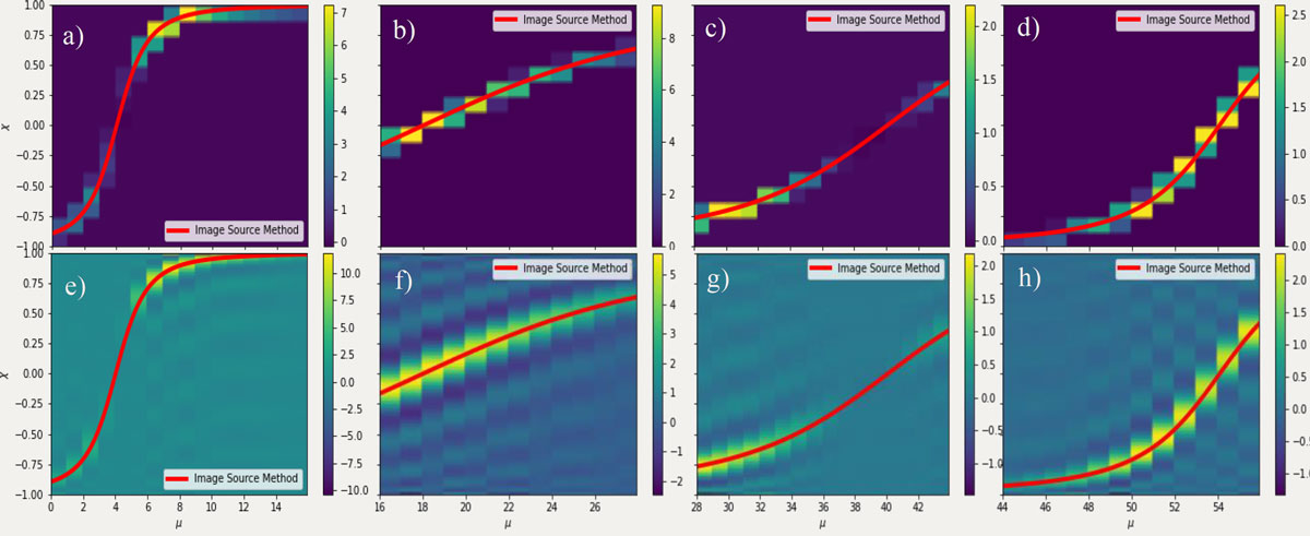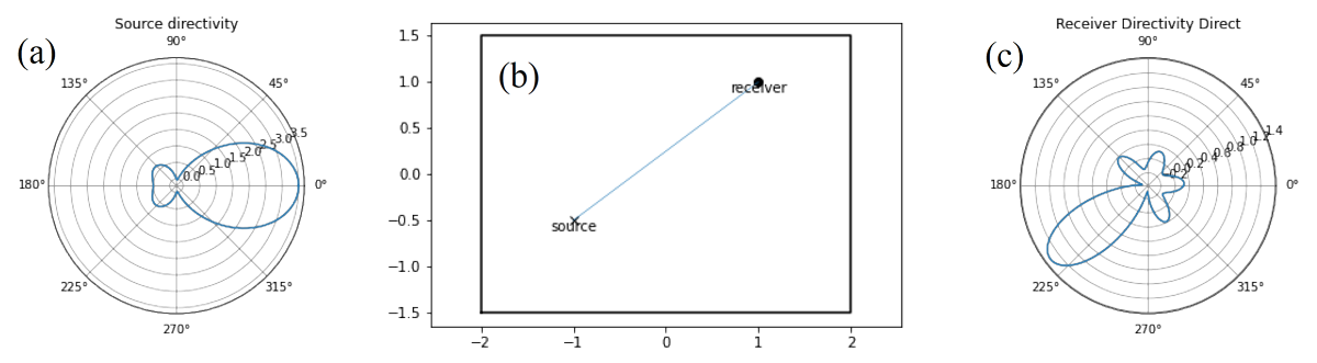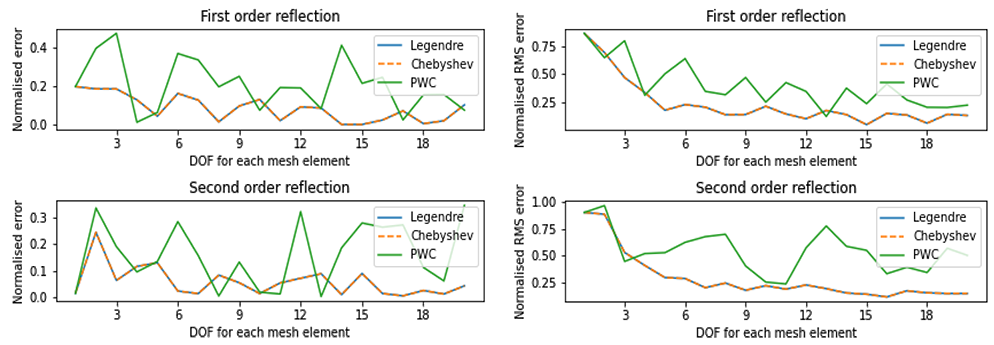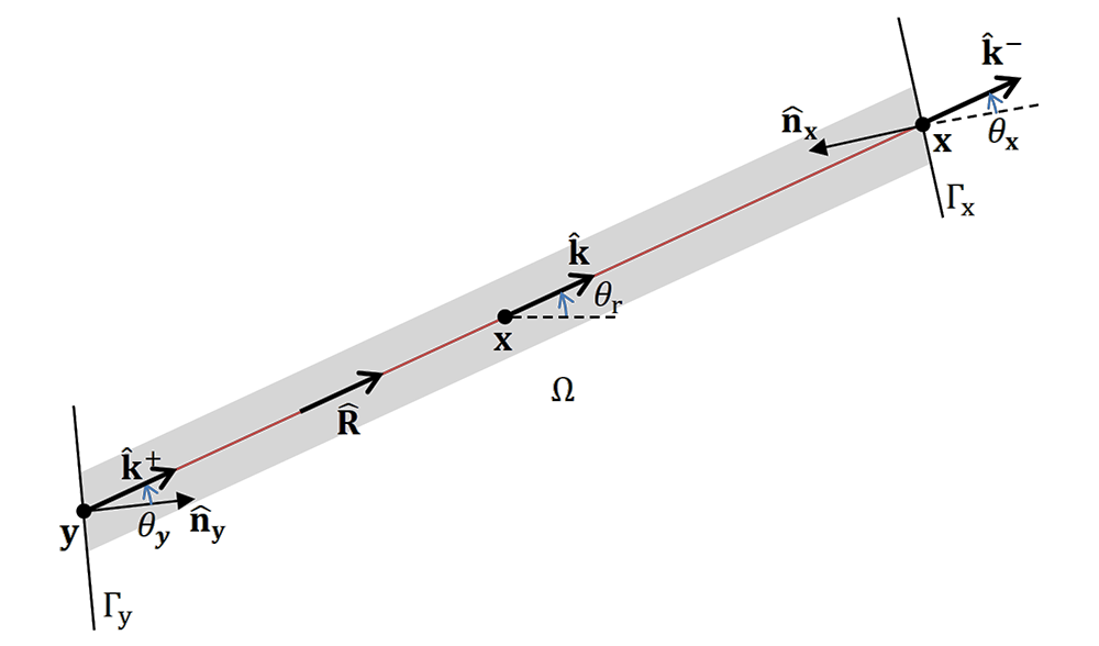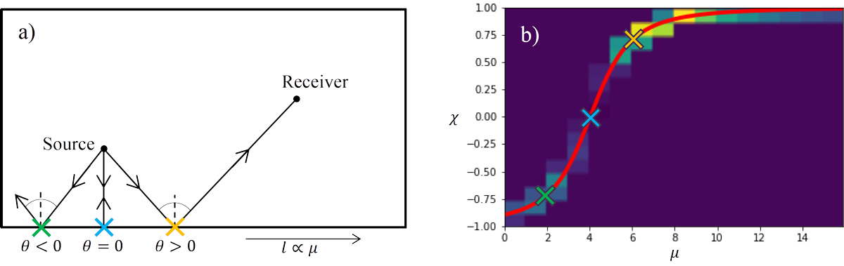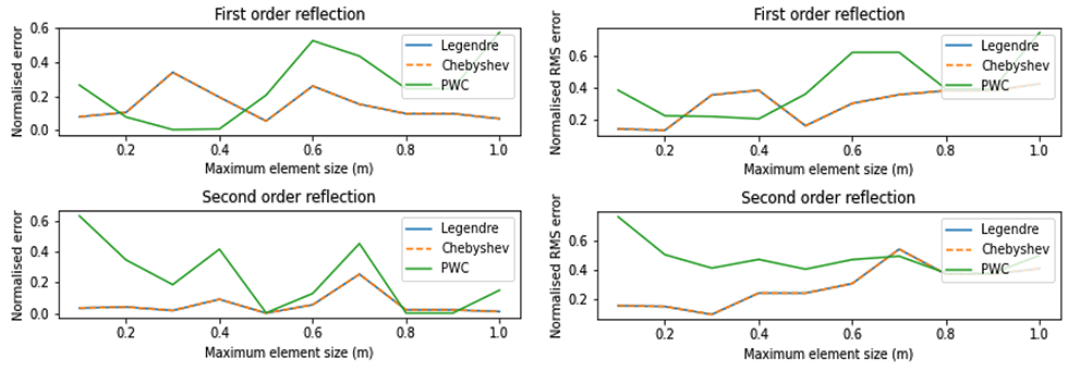 A A A Volume : 44 Part : 2 Proceedings of the Institute of Acoustics Raytracing in Galerkin boundary integral form Amal Emthyas1, Acoustics Research Group, Newton Building, University of Salford, Salford, M5 4WT, United Kingdom Jonathan A2. Hargreaves, Acoustics Research Group, Newton Building, University of Salford, Salford, M5 4WT, United Kingdom ABSTRACT Raytracing is an established method for computing the late-time part of room impulse responses. But it has the drawback that only very crude Monte Carlo models of boundary scattering and diffraction are possible to include without losing its attractive computational cost scaling. This happens because higher-resolution models of these processes output multiple child rays for every parent ray received, making the number of rays grow with reflection order. An emerging solution is so-called ‘Surface-Based’ Geometrical Acoustics. Here the distribution of rays arriving at a boundary is mapped onto a predefined set of spatial elements and angular interpolation functions, producing a vector of coefficients. Re-radiation of subsequent reflections is then a matrix multiplication, with the steady state solution being solvable via a Neumann series. Since rays only ever propagate one reflection order before being collected, diffraction and scattering process that cause them to multiply can be included without issue. Here we present a new formulation based on a Galerkin Boundary Element Method (BEM). A unique feature is its ability to readily change interpolation functions, so their effect on accuracy and convergence can be assessed. In this preliminary work, it is verified against an Image Source Model for a rectangular room. 1. INTRODUCTION Prediction models are at the heart of modern acoustic engineering. They are used in a diverse range of applications, from refining the acoustic design of classrooms and concert halls to predicting how noise exposure varies through an urban environment. They also allow Auralisation to be performed for buildings and spaces before they are built or long after they are lost [1] . Geometrical Acoustics (GA) algorithms currently dominate in room acoustics applications [2]. This is an umbrella category for several algorithms, including Image Source Method (ISM) and Raytracing. These are common in their assumption that sound propagates geometrically, i.e., in straight lines in a homogeneous medium such as air in a room. Notably, GA methods do not automatically include diffraction, meaning it must be added in as an additional process where required. This contrasts with ‘low frequency’ solvers, such as the Finite Element Method (FEM) or Boundary Element Method (BEM), which directly include diffraction as part of how they solve the underlying Partial Differential Equation (PDE) that represents acoustic wave propagation within the domain under study. ISM constructs a solution from simple sources that individually satisfy the PDE, but the way it assembles them is only valid for rectangular (2D) or cuboid (3D) domains. Raytracing is related to the acoustic PDE via the eikonal approximation. ISM is effective for reflections from smooth planar boundaries. Factors that constrain the accuracy include the inability of the standard algorithm to include boundary scattering or diffraction (the latter being zero in a rectangular or cuboid domain). These must be added on as additional processes [3,4]. But it’s main constraining factor is its exponential computational cost scaling with reflection order. This limits it to computing low-order early reflections only in most cases. Raytracing is popular for late-time impulse response generation because its computational cost is linear with reflection order. However, all but the lowest-fidelity models of boundary scattering and diffraction lead to ray-splitting, and this cripples it with exponential cost scaling with reflection order. Recent work has used precomputed edge-to-edge visibility graphs to accelerate this, but this was only applied to ‘direct’ diffraction and the algorithm retains exponential complexity [5]. A final constraint is that the above methods bear little similarity to established methods for low frequencies (FEM and/or BEM), hindering prospects for a unified full-audible-bandwidth approach. 1.1 Surface-Based GA An emerging category of models is what Savioja and Svensson termed “surface-based” GA [2]. These discretise the distribution of acoustic power flow versus position using a boundary mesh, just like BEM uses for low frequency problems. Indeed, it has been called “Energy-Intensity” BEM by some authors [6,7]. The oldest algorithm is this category is Acoustic Radiosity, developed by Kuttruff in the 1970s [8,9]. This does not consider the directional nature of sound arriving at the boundary and instead considers these to all scatter diffusely according to Lambert’s law, which is not a realistic model of real rooms. Results tend not to be too unreasonable for late reflections, where the sound field is diffuse anyway, but it is inaccurate for early reflections, which are sparse in direction. Usefully, however, it can be used to find T60 in rooms with non-uniform absorption [8]. More sophisticated algorithms also parameterise reflection direction [6,7,10–13]. This approach appears to have been developed independently by three different groups, but they can be shown to all be equivalent once choices in dimensionality, interpolation and notation are taken into account. One of the contributions of this paper is a framework that makes this equivalence clearer. A version of the algorithm that operates on volumetric meshes has also been demonstrated [14] but, while this opens up exciting applications in inhomogeneous and structure-borne sound problems, its benefits for homogeneous room acoustics problems are less clear. A characteristic of the surface-based GA method is that the way the solution is interpolated – mathematicians would call this the 