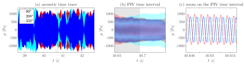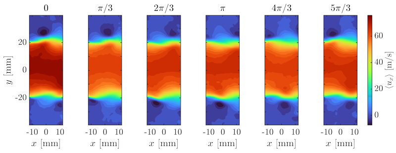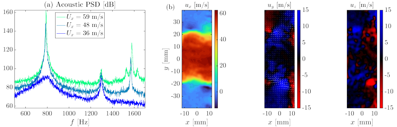 A A A Volume : 44 Part : 2 Proceedings of the Institute of Acoustics Experiments on the aeroacoustic whistling of a cylindrical cavity Abel Faure-Beaulieu1, ETH Zürich, Zürich, Switzerland Tiemo Pedergnana, ETH Zürich, Zürich, Switzerland Yuan Xiong, Beihang University, Beijing, China Nicolas Noiray2, ETH Zürich, Zürich, Switzerland ABSTRACT An air flow going through an axisymmetric cavity can interact with the acoustic modes of this cavity and produce loud self-sustained acoustic oscillations. Acoustic measurements reveal that the nature of the acoustic mode undergoes complex dynamics. Simultaneously to acoustic measurements, time resolved stereoscopic particle image velocimetry gives the three velocity components in a two-dimensional plane. Although the experimental velocity fields are only two-dimensional, the whole tridimensional phase-averaged velocity field can be reconstructed for the specific case of a spinning aeroacoustic mode. This reconstruction reveals the existence of a helical vortex tube spiralling in the shear layer at the cavity opening. 1. INTRODUCTION Aeroacoustic whistling of deep cavities under a grazing flow is a phenomenon studied since decades because it is a source of unwanted noise and vibration in aerodynamic applications and piping systems [1, 2]. It happens when the hydrodynamic fluctuations of the shear layer at the cavity’s mouth efficiently provide energy to one of the acoustic modes of the cavity, causing acoustic oscillations that amplify in return the hydrodynamic fluctuations of the shear layer. This feedback loop mechanism can produce loud tonal whistling. In deep rectangular cavities, which are a typical academic configuration producing aeroacoustic whistling, the acoustic mode involved in the instability is generally a longitudinal mode of the cavity [3]. In the present study, we focus on a different configuration: an axisymmetric deep cavity. Previous studies on whistling in deep or Figure 1: Experimental setup. (a) Picture of the cavity. (b) Side cut of the cavity and the duct. (c) Axial view of the cavity and the stereoscopic PIV system (cameras and laser sheet). The three coloured points correspond to the microphones positions. Shallow axisymmetric cavities have shown that the unstable acoustic modes are azimuthal modes, also sometimes referred to as "diametral modes" [4–7]. Azimuthal modes arise as pairs of degenerate or quasi-degenerate acoustic modes, which leads to more complex dynamics than in the case of the rectangular cavities. The dynamics of azimuthal modes is already a topic of investigation in the domain of gas turbines for power generation and aircraft propulsion, because they are important to model the thermoacoustic instabilities occurring in the annular combustion chambers of these turbines [8–12]. Azimuthal thermoacoustic modes are classified in three categories: spinning modes, propagating in the azimuthal direction at the speed of sound, standing modes, keeping a fixed or slowly evolving nodal line, and mixed modes, being a linear combination of both [9, 13]. The same classification can be applied to aeroacoustic azimuthal modes in whistling axisymmetric cavities. The study of Abdelmwgoud et al. [6] is a compressible LES of the whistling of a shallow axisymmetric cavity. It sheds light on the structure of the shear layer oscillations depending on the nature of the acoustic mode. Spinning modes are associated with a continuous helical vortex tube advected downstream by the grazing flow, while standing modes are characterised by disconnected vortex crescents alternatively produced on both sides of the nodal line of the acoustic mode. However, few experimental studies investigated in depth the hydrodynamic fluctuations of the shear layer. The PIV study from Oshkai and Barannyk [5] captures 2D fields of the vortex shedding associated to the first and second shear layer modes, featuring respectively one and two vortical structures in the width of the cavity opening. In the present paper, we applied for the first time stereoscopic particle image velocimetry to a deep cylindrical cavity subject to aeroacoustic whistling. Stereoscopic PIV allows us to obtain the three components of velocity in a 2D section of the cavity. With the experimental data obtained, we propose a 3D reconstruction of the phase averaged velocity field. This allows to visualize for the first time an experimental reconstruction of the helical vortex tube observed in previous simulations [6, 7]. In a first section, the experimental setup is described. Then, the main features of the instability are commented. The last section describes the process of phase averaging and 3D reconstruction. 2. EXPERIMENTS The axisymmetric cavity, represented in fig. 1, is a cylinder of radius 128 mm and width 30 mm, with a glass window to allow flow visualisation. The grazing flow is supplied through a cylindrical duct of radius 20 mm, ending with anechoic terminations to avoid coupling of the instability with pipe modes. The air mass flow is controlled with a valve and measured with a Bronkhorst mass flow Figure 2: Experimental results. (a) Spectrum measured by a microphone placed on the cavity, for different velocities Ux of the grazing flow. (b) Instantaneous snapshot of the three components of the velocity field in the cavity width, captured with the PIV, during an aeroacoustic instability. The bulk velocity is Ux = 47 m/s.meter. Acoustic measurements are done with three microphones placed on the downstream wall of the cavity at equal radial position 90 mm and different azimuthal locations 90◦, 208◦, 332◦, as shown in fig. 1 (c). The instantaneous fluctuations of the three velocity components are obtained in a plane section of the cavity with fast stereoscopic particle image velocimetry (PIV). Small DEHS seeding particles are injected into the grazing flow. They are illuminated by a fast pulsed laser sheet. The particle images are taken by two fast cameras place