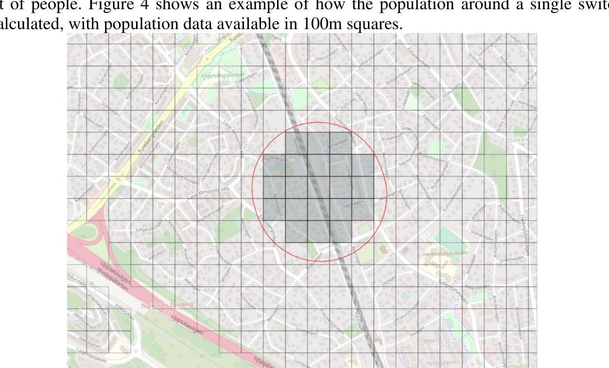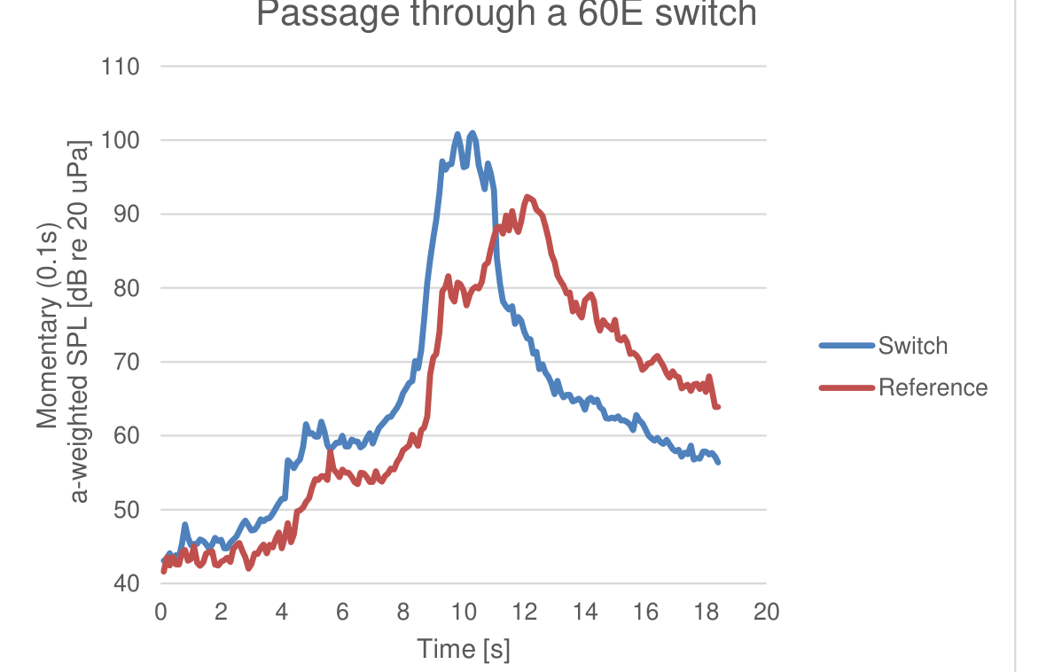 A A A Volume : 44 Part : 2 Impact of railroad switches on rail noise exposure near stations Anders Genell 1 Swedish National Road and Transport Research Institute (VTI) S-581 95 Linköping Sweden Erik Nyberg 2 Swedish National Road and Transport Research Institute (VTI) S-581 95 Linköping SwedenABSTRACT According to Common NOise aSSessment methOdS in EUrope (CNOSSOS-EU) in Annex II of Directive 2002/49/EC, noise from road, rail and airplane traffic, as well as noise from industries, shall be assessed using this common method. For railway noise in Sweden, noise assessment has previously been done using the Nordic Assessment Method for Train Noise, revised 1996 (NMT96). NMT96 includes a simple correction for rail joints of +3dB and for rail switches of +6dB. CNOSSOS-EU instead introduces a speed dependent correction based on a third octave band wavelength spectrum adding up to 20dB rolling noise energy in lower frequencies and down to -40 dB in higher frequencies. Measurements recently performed for two different rail switch types along the Swedish rail system indicate that the frequency distribution corresponds well to the CNOSSOS-EU correction for one type of rail switch but not for the other, and for the overall level difference the opposite is true. In order to investigate to what extent this deviation is affecting noise exposure an inventory of more than 12000 rail switches along the Swedish railroad network has been performed to identify what types are situated in densely populated areas such as railway stations.1. INTRODUCTIONAccording to Common NOise aSSessment methOdS in EUrope (CNOSSOS-EU) in Annex II of Directive 2002/49/EC [1], noise from road, rail and airplane traffic, as well as noise from industries, shall be assessed using this common method. The railway noise source model in heavily influenced by the Harmonoise/IMAGINE noise prediction models [2][3] as well as by the de facto branch standard development software TWINS [4].1 anders.genell@vti.se 2 erik.nyberg@vti.se Figure 1: A flow-chart representation of the TWINS model. Adopted from [5].Figure 1 depicts a flow chart representation of the TWINS model, and as input data at the top is wheel irregularities and rail irregularities. In CNOSSOS-EU [1] a similar approach is used for rolling noise on the basis of total roughness level L R,TOT , as described in Equation (1) where L R,TR is the roughness level of the track and L R,VEH is the roughness level of the wheel.. 𝐿 𝑅,𝑇𝑂𝑇,𝑖 = 10 × log ( 1 0𝐿 𝑅,𝑇𝑅,𝑖𝐿 𝑅,𝑉𝐸𝐻,𝑖10 ) + 𝐴 3,𝑖 (1)10 + 1 0Rail switch impact noise is also represented by a total effective roughness level for a rail section covering 50m before and 50m after the rail position along the track, as represented in Equation (2), where a term L R,IMPACT is added to the wheel and track roughness.. 𝐿 𝑅,𝑇𝑂𝑇+𝐼𝑀𝑃𝐴𝐶𝑇,𝑖 = 10 × log(1 0𝐿 𝑅,𝑇𝑂𝑇,𝑖𝐿 𝑅,𝐼𝑀𝑃𝐴𝐶𝑇,𝑖10 ) (2) Table G-4 of CNOSSOS-EU contains impact roughness level coefficients to be used if no other data is available. In order to investigate the validity of these coefficients for impact noise from Swedish rail switches, measurements for two different types of switches were performed for a number of train types. Figure 2 shows a graph of the rail roughness levels representing rail switch impact noise addition in CNOSSOS-EU.10 +1 0whoo! Sham] vrs oriaer] [Beet receptances| receptanes receptances| L R,IMPACT302010Rougness level [dB]0-10-20LR,IMPACT-30-40-50-60166,32,51,60,8806350402520108542112502000160010003,151,2531,512,5800630500400315250200160125100WavelengthFigure 2. Rail switch impact roughness level as given i table G-4 of CNOSSOS-EU.2. RAIL SWITCHESFigure 3 shows a principal drawing of a single point rail switch. The course of events when a train is passing a rail switch is well described in [6]: “ When a wheel passes over the crossing in the facing move (from the switch panel towards the crossing panel) it will first encounter the wing rail. Due to the outwards deviation of the wing rail, the wheel‒rail contact point will move towards the outside of the wheel profile. For a typical conical wheel profile, the rolling radius will decrease and the wheel will move downwards unless the wing rail is elevated. The reduced rolling radius on the crossing side will induce a yawing motion of the wheelset towards the crossing. Due to the check rail, the lateral motion of the wheelset is restrained and wheel flange interference contact with the crossing nose is prevented. When the wheel reaches and makes contact with the crossing nose, the contact load is quickly transferred from the wing rail to the crossing nose. ”Figure 3: Principal drawing of a single point railway switch. The red parts are guide rails that through interaction with the wheel flange ensures that the train follows the correct lateral position through the switch.In Sweden, work has been carried out since 2014 to introduce a newer type of rail switch, denoted 60E, to over time replace the older types SJ50, BV50 and UIC60. The 60E switch has a transition zone with such a slightly raised wing rail in order to reduce the impact forces when transitioning to the crossing nose [7]. This could theoretically also reduce the impact noise from the train passing through the switch. Table 1: Types of switches and their prevalence in the Swedish railway system, and amount of nearby population. “EV”, “DKV” and “3V” denotes single, double or tree-way switch respectively.Type Amount Perc Tot population Max population EV-SJ50 4613 29.5% 928014 5970 EV-UIC60 2724 17.4% 549186 5032 EV-XX00 2587 16.5% 270841 3388 EV-SJ43 1767 11.3% 227317 2626 EV-BV50 1297 8.3% 200168 3221 EV-60E 684 4.4% 169128 4541 DKV-SJ50 308 2.0% 115274 3421 3V-SJ50 354 2.3% 68810 2315 EV-SJ41 331 2.1% 51199 1282 3V-SJ43 190 1.2% 34878 2114 A number of different types of switches are employed in Sweden. Table 