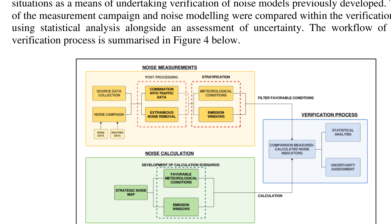 A A A Volume : 44 Part : 2 Verification of railways noise mapping using CNOSSOS-EU: case study on freight trains Álvaro Grilo 1 INERCO Acústica S.L. Tomas Alba Edison, 2 (Isla de la Cartuja), Seville, Spain. Javier E. Mitjavila 2 INERCO Acústica S.L. Tomas Alba Edison, 2 (Isla de la Cartuja), Seville, Spain.ABSTRACT Freight trains are a relevant source of environmental noise and require an acoustical assessment to quantify the exposure of the population using noise mapping. Once the results of the noise calculations have been developed, it might be necessary to adopt mitigation strategies that can be validated using these noise models. It is becoming increasingly common to undertake some form of validation exercise to cross-reference the calculated levels with measurements to reduce the uncertainty in the action planning. Based upon the results of the monitoring, the measured data may then be stratified regarding the source data and meteorological data and introduced into the calculation model, to enable the model to replicate the situation during the measurement windows (meta-models). The results from the calculations of each of these meta-models may then be compared with the noise measurement results as the basis for the validation study. This paper presents an overview of a verification project where such a process was followed using the CNOSSOS-EU as the basis of comparison.1. INTRODUCTIONIn the past decades, the adverse impacts on human health related to noise have become a major worldwide concern, to both administration and the general public. The European Environment Agency (EEA) estimated [1] that railways are the second most dominant source of environmental noise in Europe, with nearly 22 million people affected and, a greater proportion of people exposed to noise levels higher or equal than 65 dB during the night-time. The European Commission also pointed out that the rolling noise of freight wagons is the main source of railway noise [2] [3]. In addition, rail freight traffic is expected to increase by more than 50 % by 2030, compared with 2010 levels [4] with the highest growth among the inland freight transport modes and increases its modal share by 3% in 2050 [5].In terms of noise assessment and control regulations in Europe, the Environmental Noise Directive 2002/49/EC [6] requires all EU countries to develop strategic noise maps and action plans for areas where major roads, railways, airports, and agglomerations are present. Action plan implementation implies an investment to assure that the noise levels comply with national and international noise1 agrilo@inerco.com 2 jemitjavila@inerco.com guidelines/regulations. Thus, it is a common practice to check the efficacy of the proposed action plan through the implementation of the selected mitigation measures into the noise modelling, developed according to the Common NOise aSSessment methOdS (CNOSSOS‐EU) [7]. The verification process of these noise models through noise monitoring at select sites shows is becoming a wide solution for boosting the public confidence in these maps and contributing to further evaluation of the efficacy of the action planning [8].This paper aims to describe the verification methodology of a CNOSSOS-EU noise model through noise monitoring for a freight network in Latin America. The verified noise model process will serve later as the main supporting point for a further proposal of feasible and cost-effective noise mitigation measures.2. DESCRIPTION AND ASSESSMENT OF RAILWAYS NOISEIn Harmonoise WP1.2 [9], an individualization of the noise sources that compose the term “railway noise”, alongside the behaviour of said components, is performed. The report states that railway noise could be divided in traction noise (motor noise and auxiliary noise), rolling noise (interaction between wheel and rail), and aerodynamic noise.Figure 1. Sound pressure level as a function of train speed. Extracted from [9]As presented, in Figure 1, the total railway noise is dominated by traction noise at low speeds (below 50 km/h). On the other hand, the rolling noise dominates total noise level between 50 km/h, and 300 km/h and aerodynamic noise becomes predominant around 300 km/h. The average speed of freight trains goes between 50 and 80 km/h and thus, traction noise and rolling noise are the two major noise components to take into account when assessing freight train noise. However, it also states the existence of other components of noise, due to specific operating conditions such as during bridge passing, curve passing, rail joint passing, and braking [9]. A brief description of braking noise and acceleration from standstill noise is presented:• The braking noise is especially annoying for both passengers and residents if squeal noise and the banging of wagons are present. The squeal noise spectrum is most of the time composed of one or several pure frequencies [10]. • The acceleration from standstill noise is characterized by an increase in the noise coming from the motor (due to increasing revolutions to make the train start moving) but, unlike during pass- by, the train moves slower (and so the noise event last longer).As an example, the evolution of sound pressure level reported in a monitoring station near the studied railway track is shown in Figure 2.‘Sound pressure level dB(A) ‘Train speed [knv/h) Figure 2. Sound pressure level evolution of freight train pass-by during the braking procedure (left)and acceleration from standstill procedure (right).Railway noise is a complex problem where different noise sources, different physical generation mechanisms and behaviour interactions. In accordance with the latter, the key to developing an effective action plan is to follow an assessment methodology that considers all noise sources (and their particularities) presented earlier. The common practice, to assess railway noise impact and validate action plan results, is to perform a noise model using spe
