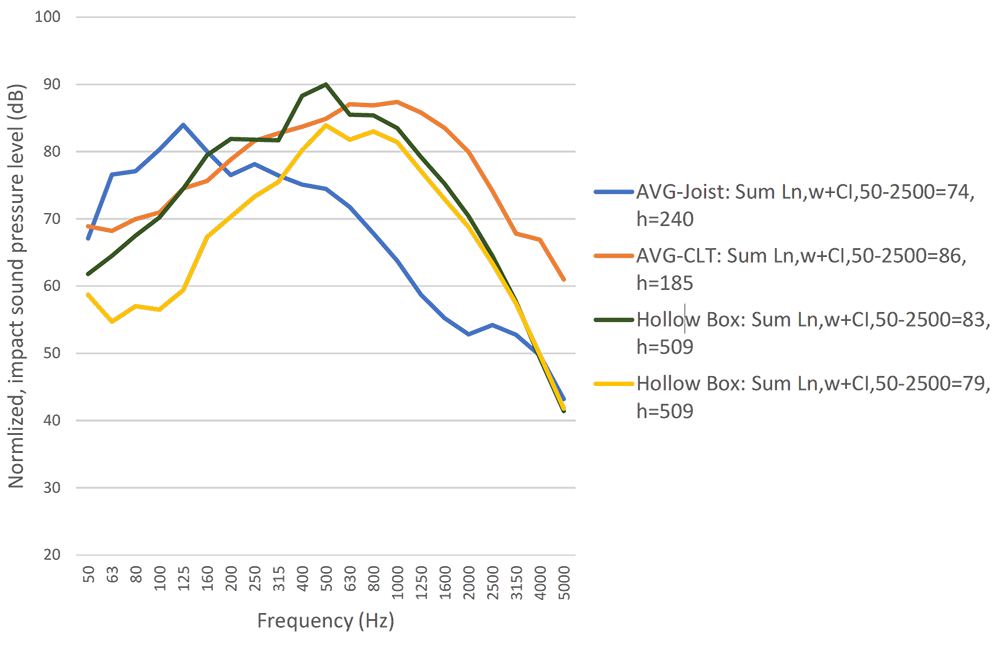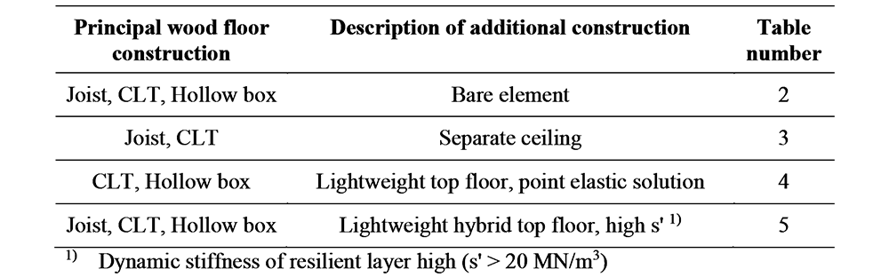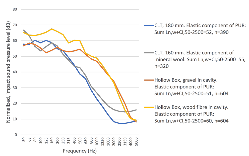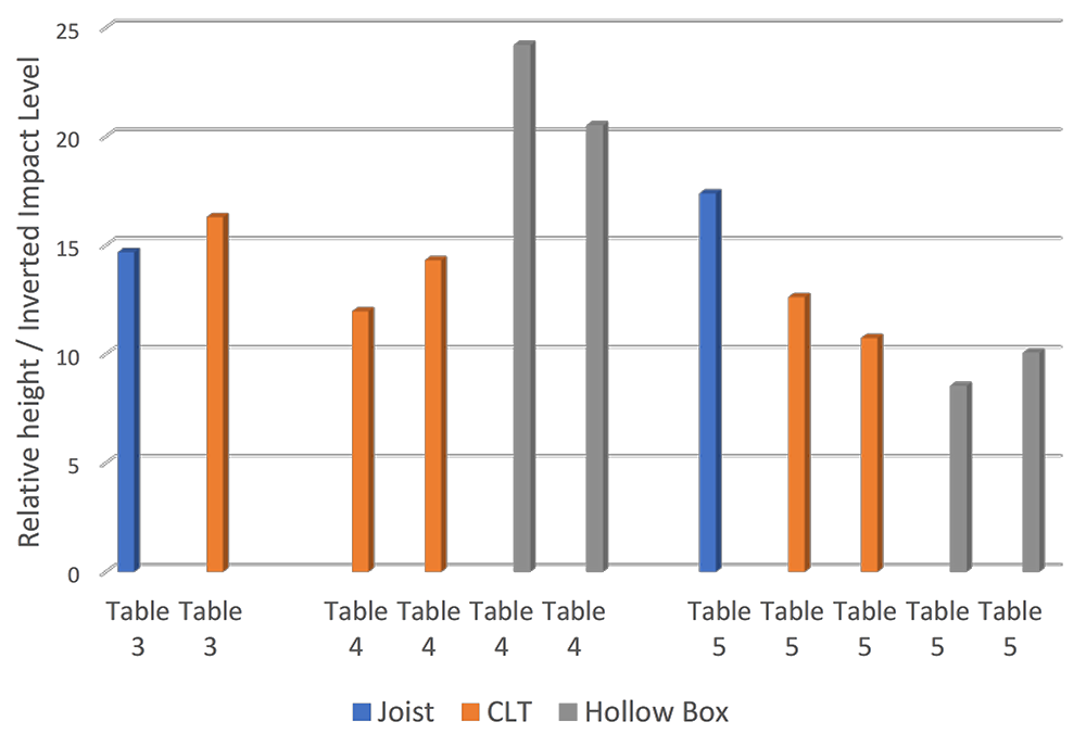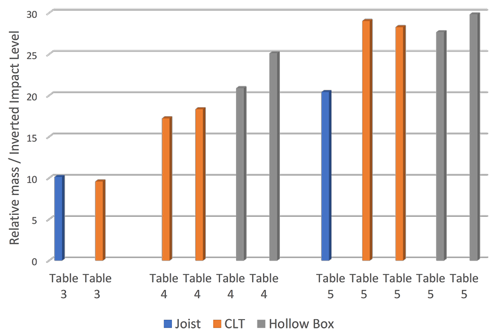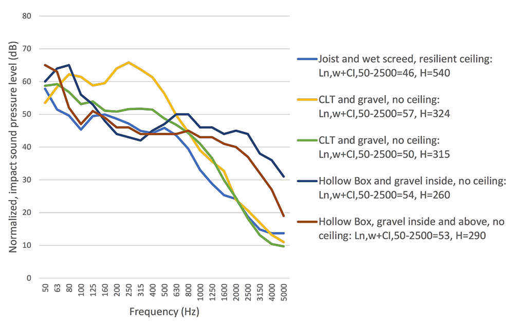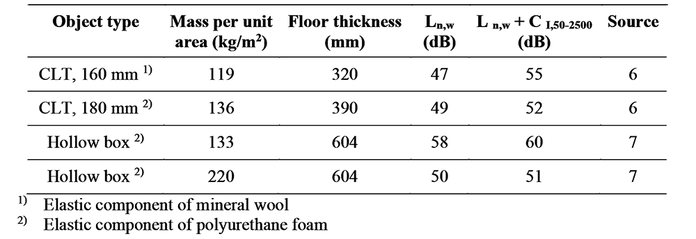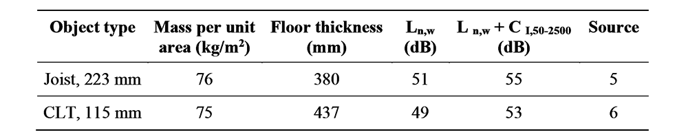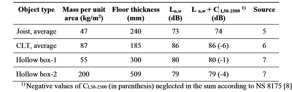 A A A Volume : 44 Part : 2 Proceedings of the Institute of Acoustics Comparison of the direct sound insulation for wooden joist, CLT and timber hollow box floors Anders Homb1, SINTEF Community, Trondheim, Norway Simone Conta2, SINTEF Community, Trondheim, Norway ABSTRACT Timber buildings are now present worldwide, and their market is growing rapidly, pushed by sustainability and environmental arguments. Several technological options for engineered wood systems are available and well developed, the most common being wooden joist, CLT and timber hollow box. In this paper, we present a comparative study of impact sound insulation of the three options. The analysis is based on data collected from laboratory measurements. The results include the comparison of the bare floor construction and examples of assemblies with additional floating floor, suspended ceiling or a combination of the two. We identify the characteristic trends and highlight the effect of selected parameters as for instance mass per unit area, assembly thickness and properties of the resilient layers. The comparison attempts to show the constructive consequences of the different options on the sound insulation properties. It could help selecting the most suitable floor system in future projects and contribute making timber construction more efficient and affordable. 1. INTRODUCTION In the process of designing building, planners and architects have to consider a number of aspects from different disciplines in order to choose the most appropriate design and solution. Due to the increasing interest on environmentally friendly raw material, we see a huge interest the last decade in developing floor constructions based on wooden material. Besides traditional wooden joist floors, we notice a rapid development of CLT based solutions, and an increasing interest in timber hollow box floors. Several research projects and measurement programs were established and carried out in recent years making available a large amount of measurement data on wooden floor constructions. But in this "jungle" of possibilities, how should architects and constructors choose the most appropriate solution depending on the boundary condition in each project? Among several parameters influencing this choice we will mention: The total floor mass(affect the load bearing system, foundation dimensioning and span length) The thickness of the floor construction (affect possible limitations on the number of storeys and integration of installations). The carbon footprint level (the floor itself or for the overall building). Span length (requirements depending on the building category and architectural plan). Fire resistance (affect especially the ceiling solution and use of non-wooden materials) Pros and cons due to horizontal sound transmission and vertical flanking transmission. In this paper, we make a first attempt of comparing wooden joist, CLT and timber hollow box floors based on two input parameters, total floor mass and floor thickness, and evaluating the impact sound insulation properties. A comparison including all the parameters mentioned above would be interesting, but it is very demanding and it is far beyond the scope of this work. Qualitative comments will be given regarding span length and limitations due to flanking transmission. The impact sound level data used in this comparison are measured in the laboratory, which is the most accurate possibility of comparing solutions. 2. COLLECTION OF IMPACT SOUND MEASUREMENT DATA The data collected for this comparison originate from measurements carried out according to ISO 10140-2 [1]standard or previous versions valid at the time of measurement. The different laboratories in which these measurements were carried out were accredited laboratories following the ISO 10140- 1 [2]. Unfortunately, as indicated in ISO 12999-1 [3], there are no results available of frequency dependent uncertainties for impact sound insulation measurements in laboratory conditions. Inter laboratory measurements (round-robin tests) for impact sound insulation are not very common and especially not sufficient in numbers to evaluate laboratory measurement uncertainty. Standard uncertainties for single-number values of laboratory measurement are however given in ISO 12999-1 standard and estimated to be about 1.5 dB. All measurement results presented in this paper were available in the frequency range from 50 Hz. Selected examples of normalised impact sound pressure levels in the frequency range 50 – 5000 Hz are presented in chapter 3 for representative configurations. From the test result, different single number quantities for rating the impact sound insulation were calculated according to EN-ISO 717-2 [4]; Ln,w, the spectrum adaptation term, CI,50-2500 and the sum of these, Ln,w+CI,50-2500. It can be interesting to compare these values with current requirements, for which we refer to [7]. Looking into the different floor constructions, we recognize that some relevant combinations are missing. Measurement data from other floor constructions may exist, but not inside our database so far. When we try to compare different solutions, it is also obvious that supplementary constructions should be on board. Therefore, for some examples the comparison obviously has weaknesses. 2.1. Overview Table Among the datasets available, we extracted the most comparable and typical solutions. We then grouped them according to the type of the bare floor (Joist, CLT or hollow box) and to additional layers. The categories are presented in table 1 where we also refer to the corresponding table summa rising the main properties of each configuration considered. We selected here the total mass per unit area, the total thickness, Ln,w-value, the sum of Ln,w + CI,50-2500 as key parameters. The reference to the data source [5], [6], [7], [8] and [9] is also provided for each configuration. Similar data is also collected for other categories, but these data have no