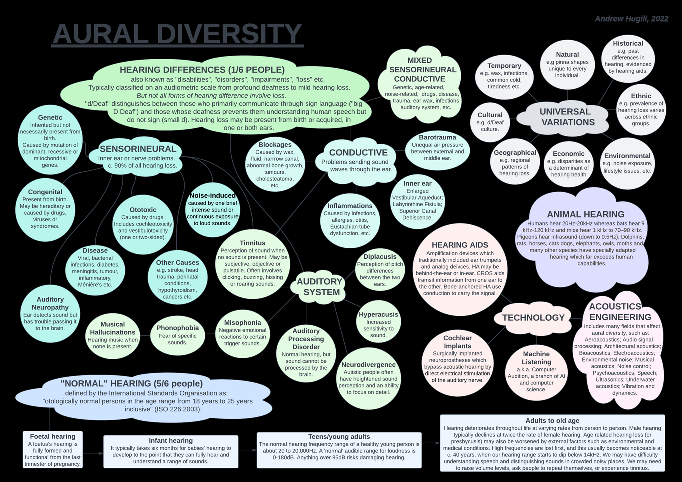 A A A Volume : 44 Part : 2 Aural Diversity: noise control and a sustainable future. Andrew Hugill University of Leicester University Road Leicester LE1 7RH andrew.hugill@leicester.ac.ukABSTRACTThe unquestioned assumption of a "normal" pair of standard healthy ears underpins most sound-re- lated disciplines, from acoustics to engineering, from music to sound studies, from medicine to hearing science. Yet, the reality is that everybody hears differently. Our ears are uniquely shaped. We all experience temporary changes in hearing, such as during a cold. Everybody goes through presbyacusis (age-related hearing loss) at varying rates after the teenage years. More specific aural divergences are the result of an array of hearing differences or impairments which affect roughly one sixth of the world's population [1]. These include noise-related, genetic, ototoxic, traumatic, and disorder-based hearing loss, some of which may cause full or partial deafness. Moreover, "loss" is not the only form of difference: auditory perceptual disorders such as tinnitus, hyperacusis and misophonia involve an increased sensitivity to sound. This paper presents findings from the AHRC- funded Aural Diversity Network, which explores the consequences of these differences for noise- related engineering and many other fields. How may we ensure a sustainable future that acknowl- edges aural diversity?1. INTRODUCTIONLet's begin with a provocative statement: noise control that ignores aural diversity is not noise con- trol! Noise is defined as unwanted sound which may be hazardous to health, interfere with speech and verbal communications, or is otherwise disturbing, irritating or annoying. In other words, it is a matter of perception. What is noise to one is, by definition, not necessarily noise to all. We cannot control noise in a one-size-fits-all sort of way. The notion of Aural Diversity is essential if we are to succeed in controlling something so subjective and variable. 2. AURAL DIVERSITYAural Diversity is founded on the observation that everybody hears differently. This is simply a matter of fact. Naturally occurring physical differences such as the shape of the flaps, or pinna, of the outer ear, are unique to each individual. The ridges and folds of these appendages gather in sounds and convey localisation information, and other aspects, in ways that are subtly different from person to person and from situation to situation. Our age, our state of health, our social situa- tion, the environment around us, and many other time-based factors, also affect the way we hear. If we have a cold on a given day, that can change our hearing. We are doubtless all familiar with that blocked up feeling in the Eustachian tubes, or a sudden change in hearing when a yawn changes the relative air pressure between outer and middle ear.21-24 AUGUST SCOTTISH EVENT CAMPUS ? O? ? GLASGOW Every person experiences age-related hearing loss, or presbycusis, which begins in our early twen- ties and starts to become noticeable in middle age. Men lose their hearing this way faster than women, but everybody finds themselves sooner or later struggling with speech in crowded situa- tions, unable to distinguish certain vocal sounds such as 's' and 'th', loss of perception of high fre- quencies, and an increasing tendency to ask people to repeat themselves or speak up until it sounds like shouting - a process called recruitment. Such loss is normally remedied by hearing aids, which amplify and modify aspects of the incoming signal. The hearing aid is a prosthetic machine listen- ing device that replaces natural hearing. What sounds like noise through a hearing aid is rather dif- ferent to what sounds like noise to an unmediated ear. All of this is normal and common to every adult to some degree. But one sixth of the world's popu- lation, roughly 32 million people, possesses hearing differences that are measurable enough to be medically diagnosed [1]. These range from profound congenital deafness to heightened hearing sen- sitivities. These are often called impairments, but the social model of disability suggests that it is the environment that is disabling. Not every hearing difference is a problem for the individual, but they are all a distinct difference. For some people, the onset of this difference is experienced as a loss. Others who are born with hearing difference or acquire it at a very young age may well see it as integral to their identity as a human being, as inseparable from their essence as left or right-hand- edness, or the colour of their eyes. "Aural Diversity" then, like biodiversity, simply describes this great variety of hearing. It includes the hearing of babies, whose acoustic apparatus takes six months to develop to the point that they can fully hear and understand sounds. And it goes beyond human hearing, to encompass animals, whose capabilities are vastly different to those of people. We may point to the ultrasonic emissions of bats or the infrasonic listening of pigeons and thousands of other examples, such as dolphins, ele- phants, owls, moths, cats, dogs, rats, and many more. Machines also hear differently to humans, if "hearing" is indeed the right word for machine handling of sound. The process of becoming familiar with cochlear implants, for example, is essentially a human-computer interface adjustment as the brain slowly makes sense of the range of strange and etiolated sounds that are received by the sen- sorineural system. As Meri Kytö points out, the cochlear implant is in effect a soundscape arranger, with compositional agency in the act of listening [2]. The infographic in Figure 1 attempts to summarise all this in a single diagram. It is of course very high level and probably fairly incomplete, but it does manage to convey something of the extent of aural diversity.21-24 AUGUST SCOTTISH EVENT CAMPUS ? O? ? GLASGOW 21-24 AUGUST SCOTTISH EVENT CAMPUS ? O? ? GLASGOWFigure 1: Aural Diversity infographicHEARING DI