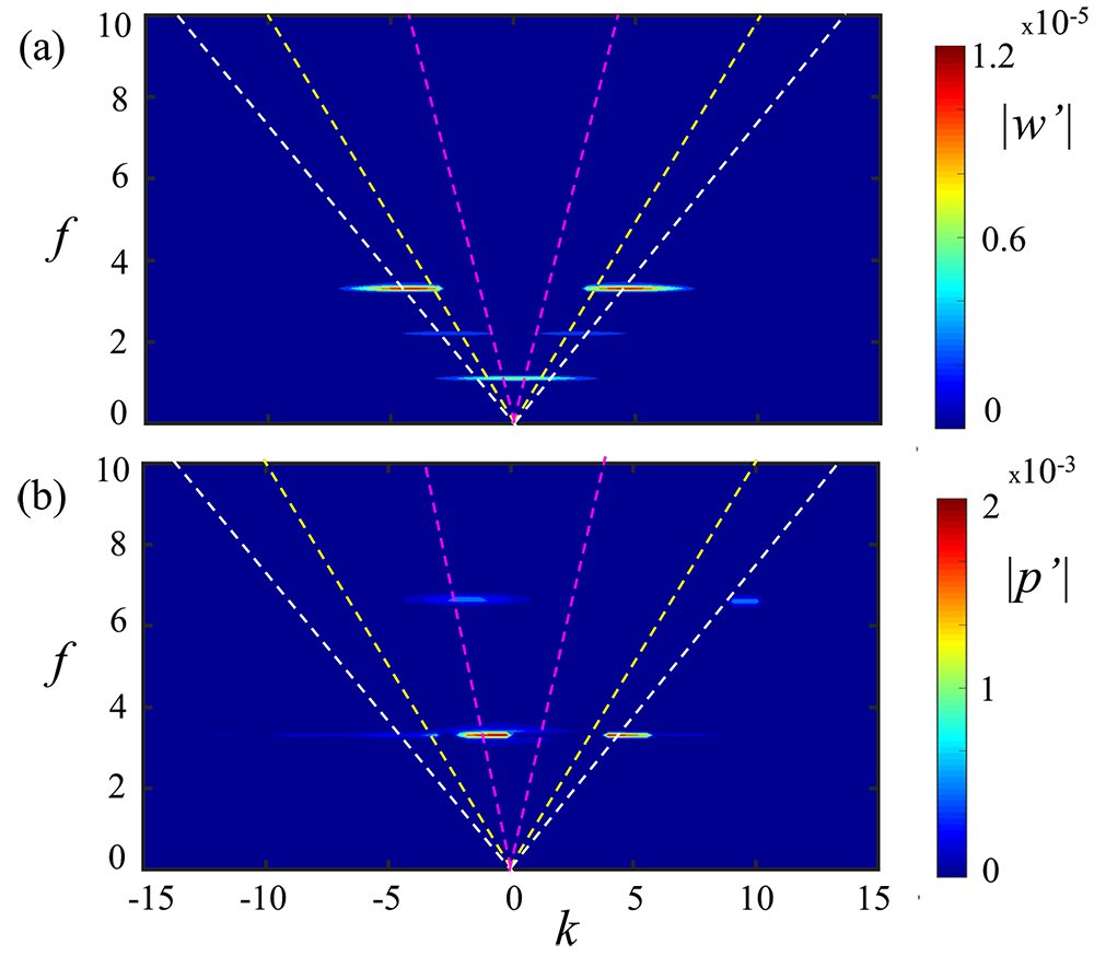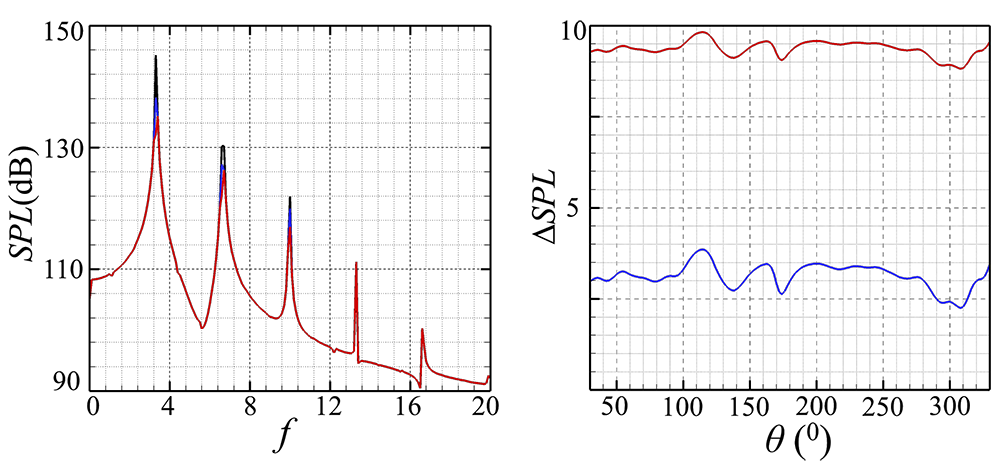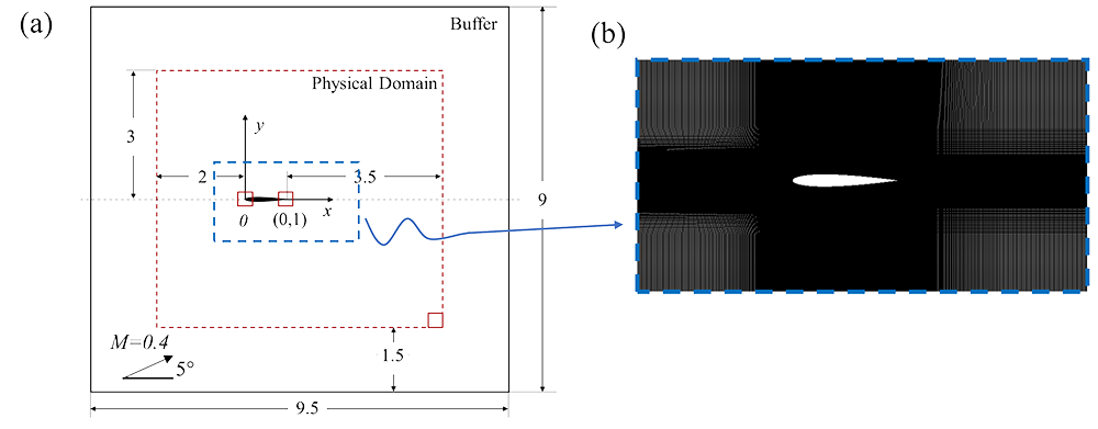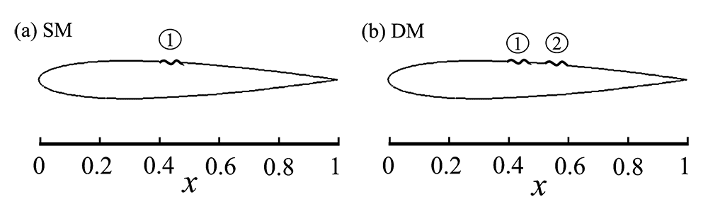 A A A Volume : 44 Part : 2 Proceedings of the Institute of Acoustics Fluid-structure interactions and aeroacoustic coupling of airfoil with flexible membrane(s) Arif Irsalan1, The Hong Kong Polytechnic University, Hong Kong, P. R. China Randolph C. K. Leung2, The Hong Kong Polytechnic University, Hong Kong, P. R. China Garret C. Y. Lam3, The Hong Kong Polytechnic University, Hong Kong, P. R. China Muhammad Rehan Naseer4, The Hong Kong Polytechnic University, Hong Kong, P. R. China ABSTRACT In this paper, fluid-structure interactions of a NACA 0012 airfoil mounted with short membrane(s) and its coupling effect on airfoil aeroacoustics are presented. A time-domain direct aeroacoustic simulation coupled with structural dynamics is carried out at a low Reynolds number of 50,000 to explore the aeroacoustic-structural interactions. Two different airfoil configurations based on single and dual membranes are analyzed. The membrane displacements and their impact on the flow field are characterized in wavenumber-frequency domain to analyze the structural dynamics due to flow unsteadiness within the laminar boundary layer and the resulting acoustic waves emanating from the airfoil trailing edge. A strong correlation between the membrane displacement and downstream propagating flow is observed for both configurations whereas the correlation is considerably weakened between the membrane displacement and upstream acoustic waves which ultimately results in the airfoil self-noise reduction without affecting the airfoil aerodynamics. The extent of noise reduction for dual membranes airfoil configuration is observed to be considerably higher than the single membrane airfoil configuration which corresponds to a much lower correlation among the upstream propagating acoustic waves and membrane displacement resulting in the redistribution of upstream flow energy into different frequencies. 1. INTRODUCTION Self-noise generation of an airfoil operating at low/moderate freestream Reynolds number (Re) is one of the most undesirable aspects associated with its operations. The mechanism of airfoil self-noise generation has been studied over the years by several researchers since the early stages of airfoil aeroacoustics and has been explored to date. Brooks et al. [1] gave a classification of the different flow physical mechanisms that can lead to noise radiation from airfoil. They categorized different airfoil self-noise mechanisms at subsonic flow conditions. The first category is turbulent boundary layer (TBL) trailing edge noise which is associated with the flow turbulence passing over the trailing edge at high Re. Secondly, at low Re, the laminar boundary layer (LBL) develops over the airfoil and the noise generation is associated with the vortex shedding. Another form of airfoil self-noise is due to vortex shedding occurring at the aft region of blunt trailing edge. Also, at high angles of attack (AoAs), the separated flow may cause stall which results in low-frequency noise radiation. Lastly, noise can be radiated due to the formation of tip vortices occurring at the tips of wings or blades. The airfoil tonal noise generation phenomenon involves the interaction among different physical mechanisms involving hydrodynamics, acoustics, and even structural dynamics in some cases. Hence, the study of airfoil tonal noise require in-depth understanding of all the physical processes involved and their inter-dynamics. One of the most interesting aspects on the airfoil tonal noise generation is to identify whether the events occurring on the pressure side of the airfoil or the suction side are responsible for eventual tonal noise generation. Earlier studies mostly focused on airfoil pressure side flow separation and the resulting tonal noise generation; however, some of the later studies even noticed the role of the suction surface of the airfoil in tonal noise generation at some flow conditions. Paterson et al. [2] observed no change in tonal noise behavior when the airfoil suction surface was tripped, whereas the tonal noise was almost eliminated on tripping the pressure side of the airfoil. Hence, the tonal noise generation was mostly associated with the events occurring on the pressure surface of airfoil. However, Jones et al. [3] observed that the events on the suction surface are responsible for tonal noise generation. In their experimental study, Inasawa et al. [4] observed that the suction surface of airfoil is responsible for feedback loop at low Re up to 2.1×105. The involvement of both suction and pressure side of airfoil in tonal noise generation indicates their dependence based on a number of flow conditions such as Re, freestream Mach number (M), airfoil profile, and incidence of flow. A comprehensive study on tonal noise regime for a NACA 0012 airfoil at low to moderate Re (3 × 104- 2.3 × 105) and effective AoA from 0โฆto 6.3โฆ was carried out by Probsting et al. [5]. Their study presents a very valuable overview of the tonal noise regime and their dependence on either suction side or pressure side or interaction of both sides of airfoil based on Re and AoA. Chong et al. [6] and Plogmann et al. [7] observed multiple tones and ladder-like structure in their experimental studies. [7] showed that the boundary layer becomes turbulent when the pressure side boundary layer was tripped and subsequently separation bubble and tonal noise was suppressed. Desquesnes et al. [8] in their numerical investigation observed the involvement of both the pressure and suction surfaces in tonal noise generation. A recent study by Sanjose et al. [10] shows a significant connection between tonal noise and T-S waves. In recent years, flow control methods based on the fluid-structure interactions have been attempted and employed on the airfoil; however, most of them are aimed to enhance the aerodynamic characteristics such as airfoil stall [11–13, 15]. Hence, the rationale behind the design of flexible panel(s)/membr