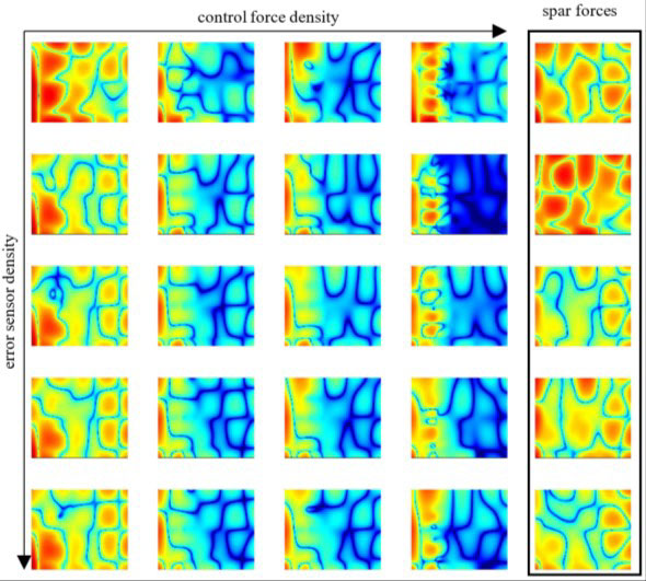 A A A Volume : 44 Part : 2 Proceedings of the Institute of Acoustics Towards the placement of actuators and sensors for an active control of structure-borne sound in a stiffened rectangular panel Alexander Kokott1, German Aerospace Centre – Institute of Composite Structures and Adaptronics, Lilienthalplatz 7, 38108 Braunschweig, Germany Hans Peter Monner2, German Aerospace Centre – Institute of Composite Structures and Adaptronics, Lilienthalplatz 7, 38108 Braunschweig, Germany ABSTRACT The active control of structure-borne sound proposes an alternative approach towards the global reduction of vibration and noise. By actively reducing or blocking the energy flow from upstream noise sources, e.g. engines or APUs of an aircraft, inside a structure, acoustically relevant down stream section of a system, e.g. the passenger cabin, may be attenuated. This work deals with a numerical analysis towards the placement of actuators and sensors on a simple stiffened structure in order to achieve a reduction in energy flow, continuing recent research on the topic for simpler plates, where advantages of the approach could be shown already. A set of virtual error sensors is used to measure the components of structural intensity on either the shell or stiffening elements. A feed-forward control is used to drive pairs of control forces to minimize those components and, hence, overall energy transmission. It can be shown that an inclusion of internal forces can achieve a greater global reduction in vibration compared to a simple velocity control also for a stiffened plate. By using structural intensity or its components, a greater reduction of downstream vibration can be achieved using a less dense array of sensors respective to the sound wavelength. 1. INTRODUCTION The location of noise emission and its sources are not collocal in many cases. This poses the issue of large radiating surfaces compared to the comparably smaller source of vibration. Rear mounted counter-rotating open rotors, for instance, would cause high amplitudes of vibration being transmitted to the aircraft’s front and, hence, the passenger cabin. There, sidewall panels and ceilings, for example, act as large radiating surfaces all over the cabin. To attenuate this radiation, multiple approaches exist already. Active noise control (ANC) uses the destructive interference of airborne sound waves, whilst active vibration control (AVC) has a comparable approach, but is targeted on the structural vibration itself. Both approaches have in common that they yield a local attenuation only. This location can be the passenger’s ear or head position or certain areas of the mentioned radiating surfaces. A global attenuation of the whole cabin, however, would need a very large number of sensors (and actuators) or would be even unfeasible. The approach of Active Structural Acoustics Control (ASAC), though, can achieve global attenuation by targeting the air-borne sound power. This idea was adapted to structure-borne sound. Therefore, the structure-borne sound power is used as the control target. The benefit of this approach is the reduction or even blockade of energy transmission to downstream areas. Consequently, this would lead to a global reduction of noise due to simply lacking vibratory energy. The idea itself is not new. Literature reveals several examples of sound power control, e.g. [1–3]. However, modern signal processing capabilities bear good prospects for the application in more complex structures, as for example stiffened curved shells as they appear in an aircraft fuselage. Previous studies of the author confirmed the advantage of this approach on simple structures as beams and plates. This work deals with the next step towards the targeted structures by adding stiffening elements to a rectangular plate. Here, the same approaches are investigated in order to reduce downstream vibration globally. 2. NUMERICAL SET-UP 2.1. Measurement of Structure-borne Sound The control of structure-borne sound requires a mathematical definition of the latter in order to define a respective control algorithm. Hence, structure borne sound can be described by the sound power estimate or its areic version, structural intensity. The latter is comparable to sound intensity, which, on the other hand, describes the air-borne sound power per area. Sound power and structural intensity were already investigated in the early 1970s for simple beams and plates. The structural intensity for flexural waves in a single direction can be derived by the following equation [4]: where 𝑄𝑥 defines the shear force, the element velocity, 𝑀𝑥𝑦 the bending moment, 𝑀𝑥𝑥 the twisting moment and 𝜔𝑥/𝑦 the respective angular rates, as depicted in figure 1. Figure 1: Coordinate system and measures of positive influence line of a plate element It shall be stated here that this equation as well as the general approach assume the kinematic conditions of Kirchhoff-Love plate theory. This assumption is necessary in order to allow the approximation of structural intensity, or its components respectively, by application of available sensors (accelerometers or strain gauges) and finite differencing in multiple orders. This approximation is valid for unstiffened flat plates. For the current case of a stiffened plate, these assumptions are not met anymore. However, it shall be investigated, how the mismatch of conditions and assumptions still allows a better performance considering a global vibration reduction. Hence, several simplifications and adaptations can be considered. NOISEUX [4] already proposed the assumption of free-field vibration, i.e. vibrations far away (in terms of wavelength) from discontinuities. Hereby, the number of required accelerometers for finite differencing could be reduced to four for a single direction (compared to eight for a near-field approximation [5]) by assuming the equality of shear force and moment components of equation 1 