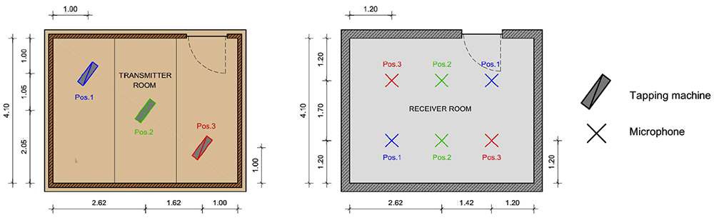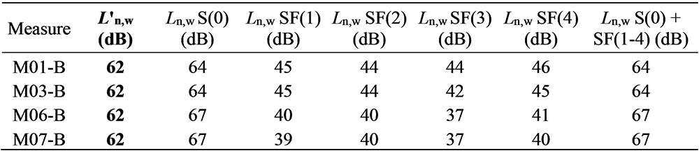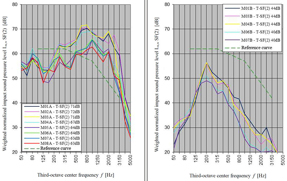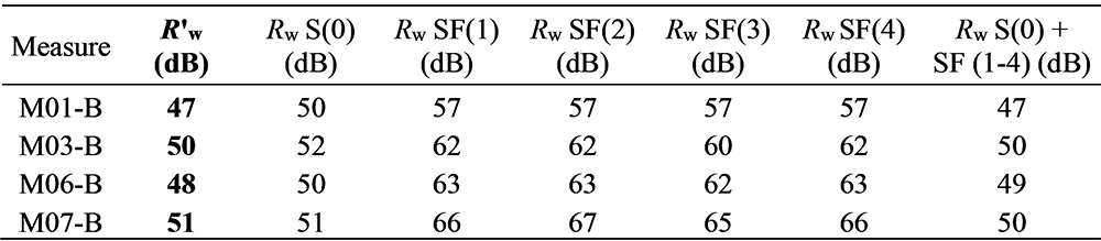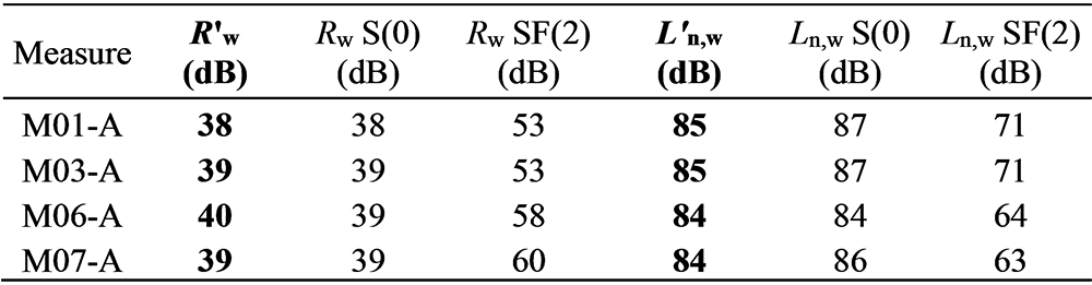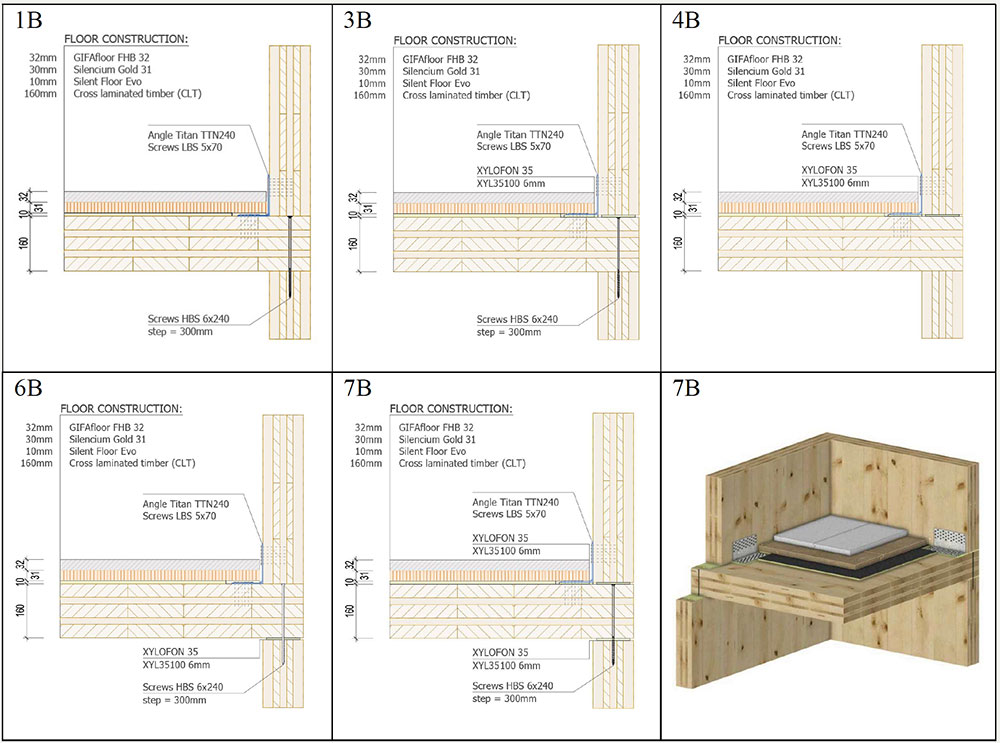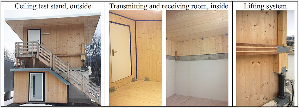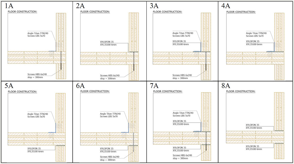 A A A Volume : 44 Part : 2 Proceedings of the Institute of Acoustics Acoustic behaviour of CLT structures: influence of decoupling bearing stripes, floor assembly and connectors under storey-like loads Anton Kraler1, University of Innsbruck, Innsbruck, Austria Paola Brugnara2, Rotho Blaas srl, Cortaccia, Italy ABSTRACT Timber buildings do not have a high acoustic performance regarding vibration transmission through the structure. To find out the peculiarity of timber sound conduction, an acoustic lab test with CLT was set up. Several measurement configurations were built and airborne sound measurements according to EN ISO 16283-1 and impact sound measurements according to EN ISO 16283-2 were carried out. The test results were set in relation to reference measurements on the bare CLT slab and on a floor assembly, with and without decoupling bearing stripes and with and without connectors. In addition to the standard sound measurements, the sound transmissions through the ceiling element and through the flank components (walls) were also measured with accelerometers. The results showed in an experimental evaluation method a reduction of the apparent sound reduction index R ' and normalized impact sound pressure level L'n. All tests were carried out with the same load of 17 kN/m on the decoupling bearing stripes and the ceiling element. The load was applied by means of threaded rods and secured by strain gauges. The influence of decoupling bearings stripes, types of fastening systems and floor structures on sound transmission through the flanking components on a real scale mock-up could therefore be investigated. 1. INTRODUCTION The measurement of airborne and impact sound insulation of building ceilings is an indispensable component and cannot yet be determined exclusively by simulation calculations. This applies in particular to the evaluation and further development of innovative timber ceilings (lightweight construction) that take into account sound transmission via sound bypasses in its form as the weighted apparent sound reduction index R 'w and as the weighted standardized impact sound pressure level L'nT,w according to OIB RL5 in Austria. The current research is of scientific interest with regard to the competitiveness of lightweight timber construction, which can be seen as the building material of the future due to its sustainability and resource efficiency. In terms of building technology, the scientific challenge is to generate innovative and economical ceiling structures. In addition to the optimal sound insulation quality (airborne and impact sound), the possibilities of heat supply with combined floor/ceiling heating also need to be included. In timber construction (lightweight construction), in addition to the combinations of the layers of the ceiling structure, the sound bypasses (flank transmissions) must also be taken into account, especially with regard to the proper choice of materials and design. In this publication, special attention is paid to this area and fundamental investigations are carried out concerning this matter. 1.1. Definitions of terms Apparent sound reduction index R ' Ten times the common logarithm of the ratio of the sound power, W1, which is incident on a test element to the total sound power radiated into the receiving room if, in addition to the sound power, W2, radiated by the test element, the sound power, W3, radiated by flanking elements, is significant. R ' is expressed in decibels. Standardized impact sound pressure level L'nT Energy-average impact sound pressure level, Li, reduced by a correction term that is given in decibels, being ten times the common logarithm of the ratio of the measured reverberation time, T, to the reference reverberation time, T0 = 0.5 s, when the impact source is the tapping machine. L'nT is expressed in decibels. Normalized impact sound pressure level L'n Energy-average impact sound pressure level, Li, increased by a correction term that is given in decibels, being ten times the common logarithm of the ratio between the measured equivalent absorption area, A, of the receiving room and the reference equivalent absorption area, A0 = 10 m², when the impact source is the tapping machine. L'n is expressed in decibels. 1.2. Acoustic Test Lab For the planned investigations, a ceiling test stand was set up based on a standard test stand, in which the flank transmission via the component connections can also be measured. The ceiling test stand consists of a transmitter room, a receiver room and a small measuring room. The transmitter room, the raw ceiling (separating component) as well as the upper part of the receiver room (1.0 m high) consist of cross laminated timber elements. Due to the existing situation, the height of the cross laminated timber walls is only 1.0 m, instead of 2.5 m required in EN ISO 10848-1. This ceiling test stand is therefore a research test stand that is used to gain new knowledge. The height of 1.0 m of the cross-laminated timber element (upper part of the receiving room) was chosen in order to be able to absorb at least a quarter of the wavelength at 100 Hz (the wavelength at 100 Hz is 3.40 m). Low frequencies can so only be partially detected. It is therefore an experimental evaluation. The lower part of the receiver room consists of lime-cement bricks and reinforced concrete with a mass per unit area of 500 kg/m² (complies with the standard requirements for a sound test stand). For the installation of decoupling bearings, the upper floor (transmitter room) can be raised up to 30 cm with and without a ceiling element using hydraulic cylinders. A staircase connects the measuring rooms. A special feature that is indispensable for this type of investigation is the possibility of preloading the wall-ceiling-wall connection by means of threaded rods. The amount of prestressing can be adjusted by means of strain gauges installed on the threaded rods. This makes it possible to simulate different loa