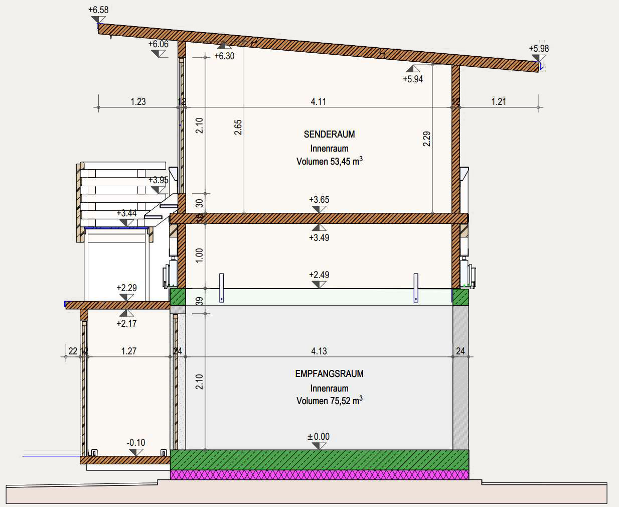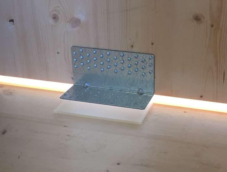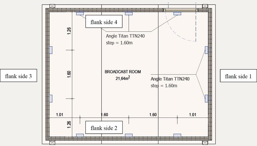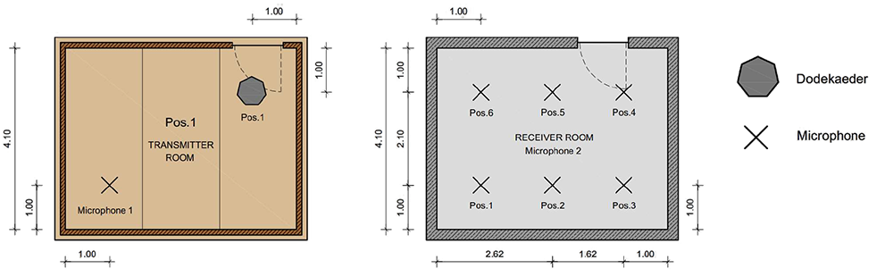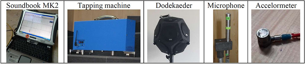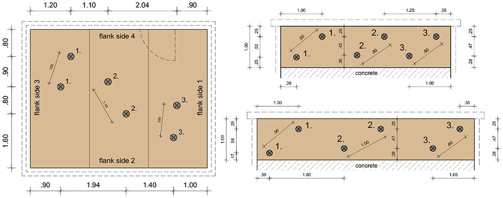 A A A Volume : 44 Part : 2 Proceedings of the Institute of Acoustics Acoustic behaviour of CLT structures: influence of decoupling bearing stripes, floor assembly and connectors under storey-like loads Anton Kraler1, University of Innsbruck, Innsbruck, Austria Paola Brugnara2, Rotho Blaas srl, Cortaccia, Italy ABSTRACT Timber buildings do not have a high acoustic performance regarding vibration transmission through the structure. To find out the peculiarity of timber sound conduction, an acoustic lab test with CLT was set up. Several measurement configurations were built and airborne sound measurements according to EN ISO 16283-1 and impact sound measurements according to EN ISO 16283-2 were carried out. The test results were set in relation to reference measurements on the bare CLT slab and on a floor assembly, with and without decoupling bearing stripes and with and without connectors. In addition to the standard sound measurements, the sound transmissions through the ceiling element and through the flank components (walls) were also measured with accelerometers. The results showed in an experimental evaluation method a reduction of the apparent sound reduction index R ' and normalized impact sound pressure level L'n. All tests were carried out with the same load of 17 kN/m on the decoupling bearing stripes and the ceiling element. The load was applied by means of threaded rods and secured by strain gauges. The influence of decoupling bearings stripes, types of fastening systems and floor structures on sound transmission through the flanking components on a real scale mock-up could therefore be investigated. 1. INTRODUCTION The measurement of airborne and impact sound insulation of building ceilings is an indispensable component and cannot yet be determined exclusively by simulation calculations. This applies in particular to the evaluation and further development of innovative timber ceilings (lightweight construction) that take into account sound transmission via sound bypasses in its form as the weighted apparent sound reduction index R 'w and as the weighted standardized impact sound pressure level L'nT,w according to OIB RL5 in Austria. The current research is of scientific interest with regard to the competitiveness of lightweight timber construction, which can be seen as the building material of the future due to its sustainability and resource efficiency. In terms of building technology, the scientific challenge is to generate innovative and economical ceiling structures. In addition to the optimal sound insulation quality (airborne and impact sound), the possibilities of heat supply with combined floor/ceiling heating also need to be included. In timber construction (lightweight construction), in addition to the combinations of the layers of the ceiling structure, the sound bypasses (flank transmissions) must also be taken into account, especially with regard to the proper choice of materials and design. In this publication, special attention is paid to this area and fundamental investigations are carried out concerning this matter. 1.1. Definitions of terms Apparent sound reduction index R ' Ten times the common logarithm of the ratio of the sound power, W1, which is incident on a test element to the total sound power radiated into the receiving room if, in addition to the sound power, W2, radiated by the test element, the sound power, W3, radiated by flanking elements, is significant. R ' is expressed in decibels. Standardized impact sound pressure level L'nT Energy-average impact sound pressure level, Li, reduced by a correction term that is given in decibels, being ten times the common logarithm of the ratio of the measured reverberation time, T, to the reference reverberation time, T0 = 0.5 s, when the impact source is the tapping machine. L'nT is expressed in decibels. Normalized impact sound pressure level L'n Energy-average impact sound pressure level, Li, increased by a correction term that is given in decibels, being ten times the common logarithm of the ratio between the measured equivalent absorption area, A, of the receiving room and the reference equivalent absorption area, A0 = 10 m², when the impact source is the tapping machine. L'n is expressed in decibels. 1.2. Acoustic Test Lab For the planned investigations, a ceiling test stand was set up based on a standard test stand, in which the flank transmission via the component connections can also be measured. The ceiling test stand consists of a transmitter room, a receiver room and a small measuring room. The transmitter room, the raw ceiling (separating component) as well as the upper part of the receiver room (1.0 m high) consist of cross laminated timber elements. Due to the existing situation, the height of the cross laminated timber walls is only 1.0 m, instead of 2.5 m required in EN ISO 10848-1. This ceiling test stand is therefore a research test stand that is used to gain new knowledge. The height of 1.0 m of the cross-laminated timber element (upper part of the receiving room) was chosen in order to be able to absorb at least a quarter of the wavelength at 100 Hz (the wavelength at 100 Hz is 3.40 m). Low frequencies can so only be partially detected. It is therefore an experimental evaluation. The lower part of the receiver room consists of lime-cement bricks and reinforced concrete with a mass per unit area of 500 kg/m² (complies with the standard requirements for a sound test stand). For the installation of decoupling bearings, the upper floor (transmitter room) can be raised up to 30 cm with and without a ceiling element using hydraulic cylinders. A staircase connects the measuring rooms. A special feature that is indispensable for this type of investigation is the possibility of preloading the wall-ceiling-wall connection by means of threaded rods. The amount of prestressing can be adjusted by means of strain gauges installed on the threaded rods. This makes it possible to simulate different loa