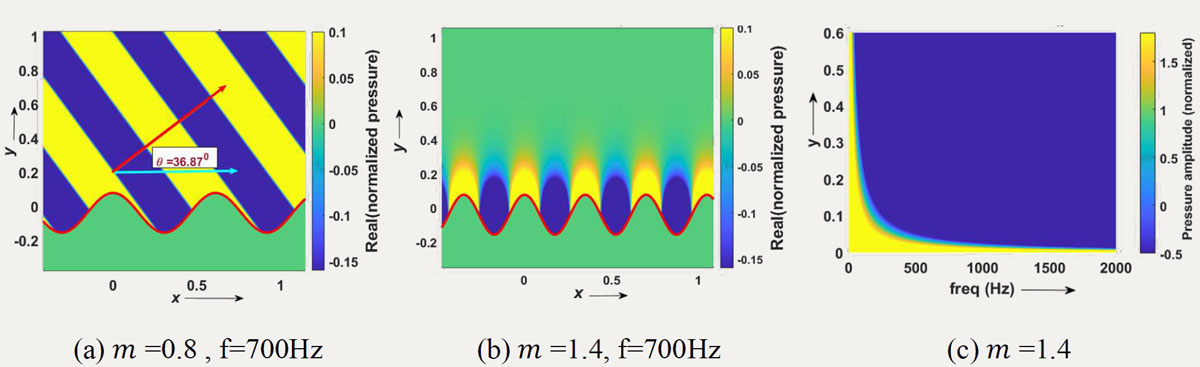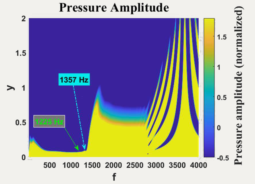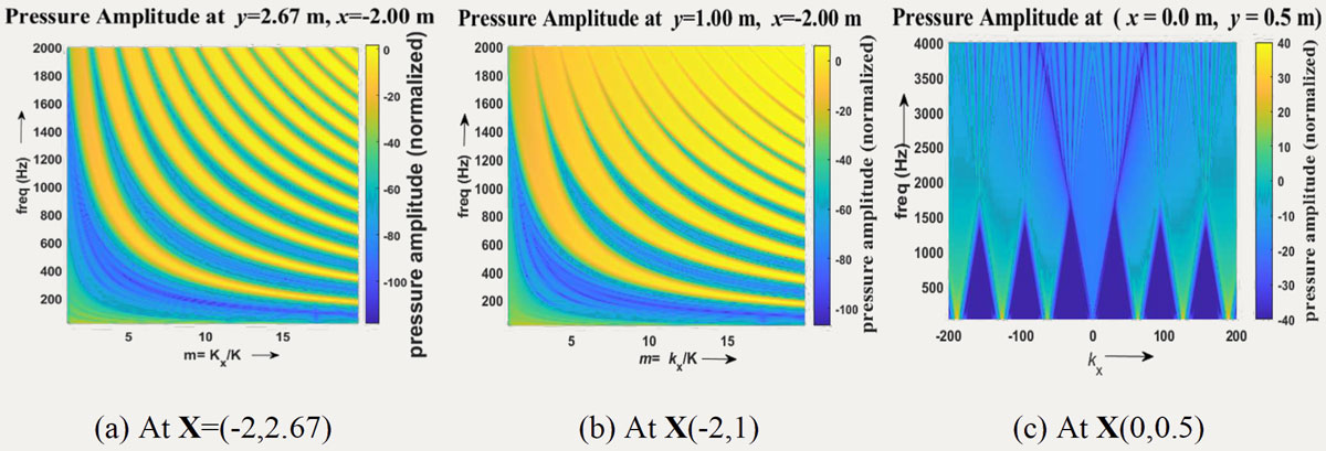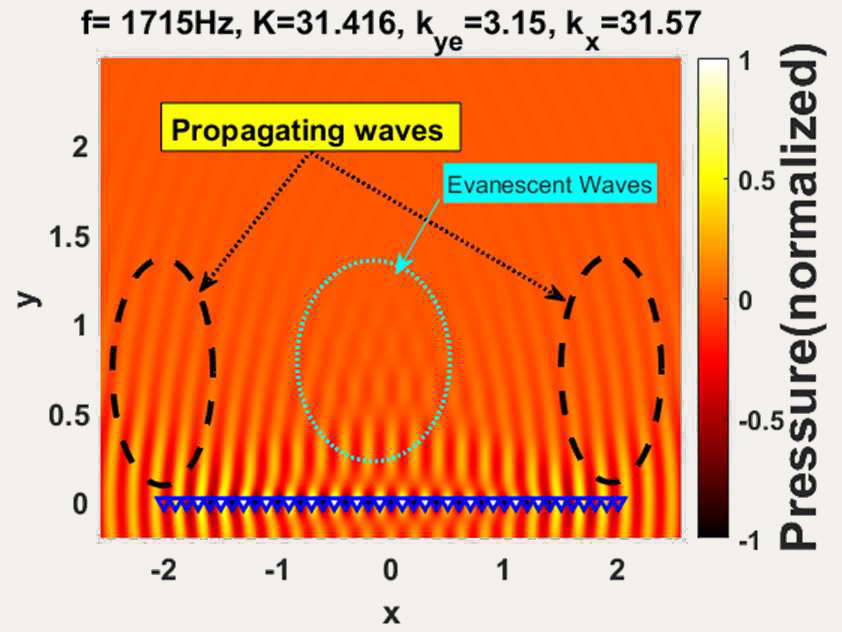 A A A Volume : 44 Part : 2 Proceedings of the Institute of Acoustics Reproduction of acoustic evanescent waves using wave field synthesis and study of the effect of phase differences between monopole secondary sources Akash Kumar1, Indian Institute of Technology Jodhpur – Department of Mechanical Engineering, Jodhpur, India Amrita Puri2, Indian Institute of Technology Jodhpur – Department of Mechanical Engineering, Jodhpur, India ABSTRACT This paper is about the reproduction of acoustic evanescent waves using the linear distribution of discrete monopole secondary sources. The driving function for the actuation of secondary sources is derived using the theory of wave field synthesis. The analysis of the synthesized wave field is done for different source excitation frequencies. A new method of creating more precise evanescent waves based on the phase difference between the sources is also presented. The simulation results show that the driving function obtained using the WFS method results in the correct synthesis of evanescent wave below aliasing frequency. Above the aliasing frequency, when the consecutive secondary sources are in antiphase, it will produce evanescent waves. Otherwise, propagating plane waves get produced. Different errors in the reproduced wave field which comes due to the use of discrete and fixed array length are also investigated, and some solutions to mitigate those errors are presented. Keywords: Wave field synthesis, Evanescent wave, phase difference between secondary sources. 1. Introduction With the advancement of technology and the development of new sensors, evanescent waves draw the attention of many researchers due to their peculiar properties like exponentially decaying amplitude and frustrated total internal reflection [1]. When a plane wave goes from a denser medium 1 to the rarer medium 2, such that the incident wave is above the critical angle, then evanescent waves form in medium 2, and if another denser medium 3 is placed close to the medium 1, again, a plane wave will form in medium 3, this property of wave is termed as frustrated total internal reflection. Evanescent wave generally appears at the interface of two medium, when the incident wave fall above the critical angle of total internal reflection and in the case of radiation from a structural vibration when the phase velocity of the flexural wave is less than the speed of the wave in the fluid of contact [2]. Evanescent waves can be used to create a personalized sound field because of their rapidly decaying property [3]. Many researchers have investigated its properties and proposed different methods for its synthesis. David Trivett [4] uses copper electrodes bonded with PVDF to produce evanescent waves in the water and uses least square method to find the driving signal for the individual electrode. Ayaka Ken et al. [5] has proposed a device to generate evanescent wave using piezoelectric crystals attachedan to acrylic sheet, to securely transfer data among nearby gadgets. Hiroaki et al. [3], [6] uses spectral division method (SDV) to define the driving function for the reproduction of evanescent waves using a circular and linear array of secondary sources. In the literature which deals with the synthesis of audible acoustic sound fields, evanescent waves are considered a near-field error [7], [8], [9] but its perceptual effect is not clearly understood [10]. This paper uses linear and discrete distribution of ideal monopole sources to produce evanescent waves. The effect of temporal frequency of secondary sources for different control parameters is analyzed to produce a better evanescent wave. The effect of the phase difference between consecutive sources for the reproduction of wave field is also studied. The paper is organized as follows: The theory used in the paper is presented in Section 2. The numerical simulations are discussed in Section 3 and finally, Section 4 concludes the work. 2. Theory In this section, the basic theory of evanescent waves and their reproduction methods are briefly discussed. The continuous secondary source is approximated by the discrete and finite length of monopole sources. These approximations result in errors in the reproduced wave field which is discussed in Section 2.4. The relation of phase difference between the consecutive sources and reproduced evanescent waves/propagative waves is established in Section 2.6. 2.1 Evanescent waves Evanescent waves appear in many physical phenomena, like when an acoustic wave from medium 1 incident on medium 2 (where 𝑣1 and 𝑣2 are respective wave propagation speeds such that 𝑣1 >𝑣2 ) above the critical angle, then a rapidly decaying wave generally appears in the medium 2, which is termed as an evanescent wave. This phenomenon is usually explained by the continuity principle of acoustic energy flux at the interface of two mediums [11]. Another physical phenomenon where evanescent waves are more common is the sound wave radiation from a vibrating structure If the phase velocity of a flexural wave in the plate is less than the sonic speed in the contact fluid, a hydrodynamic short circuit (the normal upward and downward velocity of the fluid particles in contact with the vibrating plate is too close, which restricts the formation of propagating wave and radiated field dies out rapidly) occurs in the radiated wave [12], which result in a rapidly decaying wave, called an evanescent wave. 2.2 Acoustic wave radiated from a harmonically vibrating plate Consider an infinite length harmonically vibrating plate (in x-z plane) such that wave number along the z-direction (𝑘z) is zero. The vertical displacement Y of the plate can be expressed as [2]: where j = √−1 and 𝑘pt is the wave number of flexural wave along the x direction. Wave number is defined as, 𝑘pt = 𝜔 / 𝑐pt , (𝑐pt is the phase velocity of flexural wave along x-direction). After solving the Helmholtz wave equation for the boundary con