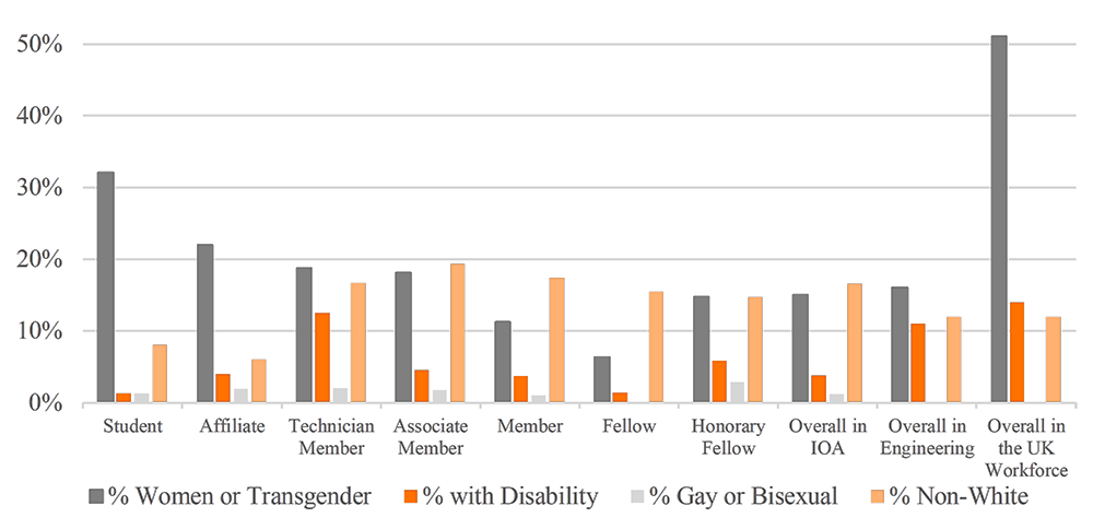A A A Volume : 44 Part : 2 Proceedings of the Institute of Acoustics Ideas for improving diversity and inclusion in acoustics Angela Lamacraft1, dBx Acoustics Ltd, Beehive Mill, Jersey Street, Manchester M4 6JG, UK Susan Witterick2, dBx Acoustics Ltd, Beehive Mill, Jersey Street, Manchester M4 6JG, UK ABSTRACT Diversity within the acoustics profession in the UK is gradually increasing, but there is still a significant need for improvement in terms of equality, diversity and inclusion (EDI). In order to address this need, the UK Institute of Acoustics (IOA) has established a working group to examine the current situation within the Institute and the wider profession in the UK. This paper provides an overview of the benefits of EDI as well as a summary of the current membership demographics of the IOA to provide a benchmark for improvement. Examples of ideas for improving the numbers and experience of underrepresented people in acoustics are discussed. 1. INTRODUCTION Equality, diversity and inclusion (‘EDI’) is a ‘hot topic’. Many organisations and individuals feel pressure to improve, but know few practical measures that can be taken. Before working at attempts to improve EDI, it is important to understand what it meant by these terms. In this paper, we define them as: Equality: All individuals are equally important and equally entitled to the opportunity to fulfil their potential. Diversity: The acoustics profession should comprise and represent members from all areas of society. Inclusion: All interested individuals in society must feel able to become acousticians and to participate at all levels of the profession. EDI is not about ‘not seeing’ differences: it is important to see, understand and, where appropriate, celebrate differences, whilst making sure that everyone is supported and empowered to participate to their full potential. In the UK, the Equality Act 2010 legally protects people from discrimination in the workplace and in wider society. It sets out nine protected characteristics (Government Equalities Office; Equality and Human Rights Commission;, 2015), but EDI goes beyond this: it is about making sure that everyone can achieve their potential. For example, many people in senior positions in acoustics in Europe and North America are outspoken, middle class, middle aged, white men. What about people who arejust as good or even better technically, but are not as outspoken? Or people from working class backgrounds? 2. BENEFITS OF DIVERSITY AND INCLUSION 2.1. Collective Intelligence There are many benefits of inclusivity and diversity. Perhaps the most essential is the improvement of collective intelligence: people from different backgrounds will have had different experiences, leading to different inspiration and ideas and fewer blind spots (Syed, 2021). In a homogenous team, all members may be intelligent, but they all think alike. This is comforting; it makes the individuals feel smarter and validates their world view. However, the group is not collectively intelligent. If the group is made more diverse by tokenism, with people brought in purely to improve diversity, they may think differently to other members of the group, but their skills are not suitable for the problem in hand. A diverse team with the right skills comprises diverse people, experiences and thought, but has the right skillset for the current task. It is vital that organisations are psychologically safe to maintain diverse ideas. 2.2. Understanding Challenges Faced by Society If areas of society are unintentionally excluded from teams, the profession misses out on their experiences and viewpoints, which then affects the delivery of services to society, leading to an endless loop. Without diversity, there are likely to be questions that we do not even think to ask, let alone know the answers to. 2.3. Profitability Study after study demonstrates that diversity, inclusion and equality within an organisation improves financial performance (Hunt, et al., 2015) (Noland, et al., 2016) (Gompers & Kovvali, 2018) (Gomez & Bernet, 2019): the most diverse companies are now more likely than ever to outperform less diverse peers on profitability (Dixon-Fyle, et al., 2020). 2.4. Addressing the Engineering Skills Shortage Acoustics in the UK, like UK engineering professions generally, faces a skills shortage (The Royal Academy of Engineering, 2022), therefore encouraging people from all social and ethnic backgrounds into the profession increases the pool of available acousticians. People find work more rewarding when they are given flexibility to tailor their schedule to personal commitments, their workspace to their personal taste and their working methods to ones that best suit them (Syed, 2021). Young professionals often state work-life balance to be the most important factor for choosing an employer (Syed, 2021), and the longer employers keep fighting this the longer they will miss out on valuable talent. 2.5. The Moral Reasoning It is worth stating that treating everyone with respect and removing discrimination is morally the right thing to do. 3. CURRENT STATE OF DIVERSITY IN ACOUSTICS IN THE UK As of March 2022, the IOA had 3,070 members (Student, Affiliate, Technician, Associate, Member, Fellow, Honorary Fellow). Figure 1 provides an overview of diversity characteristics by membership grade. Figure 1: Membership Diversity Breakdown by Grade 3.1. Gender The overall IOA membership is 85% male and 15% female, with three transgender members. Engineering UK reported in March 2022 (Engineering UK, 2022) that women make up 16.5% of all engineers, suggesting that the membership balance in the IOA may be typical. Gender imbalance is reported to increase with seniority, which is certainly the case with the IOA with only 8% of Fellows and Honorary Fellows being female. Some international societies reported a higher proportion of female members: 20% in Norway and 52% in Turkey. 3.2. Disability Currently, 4% of th