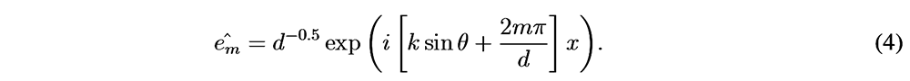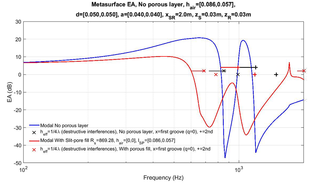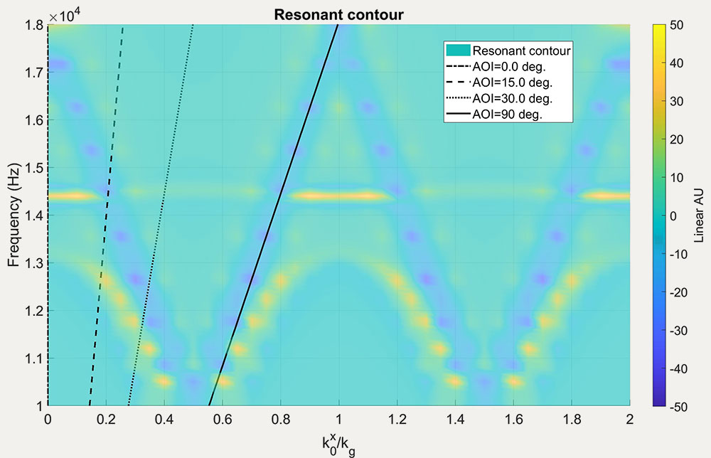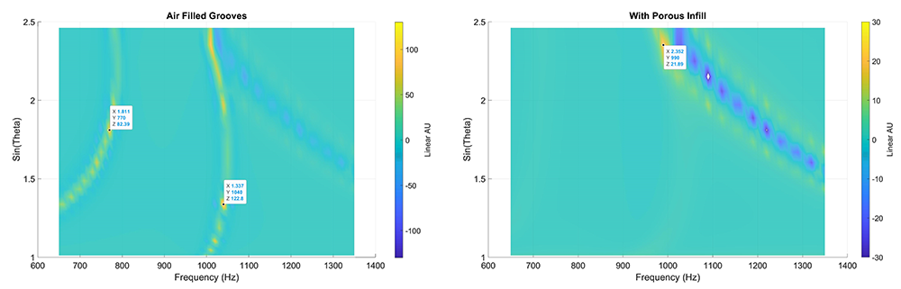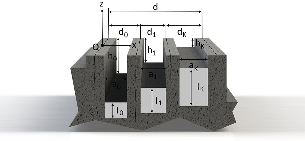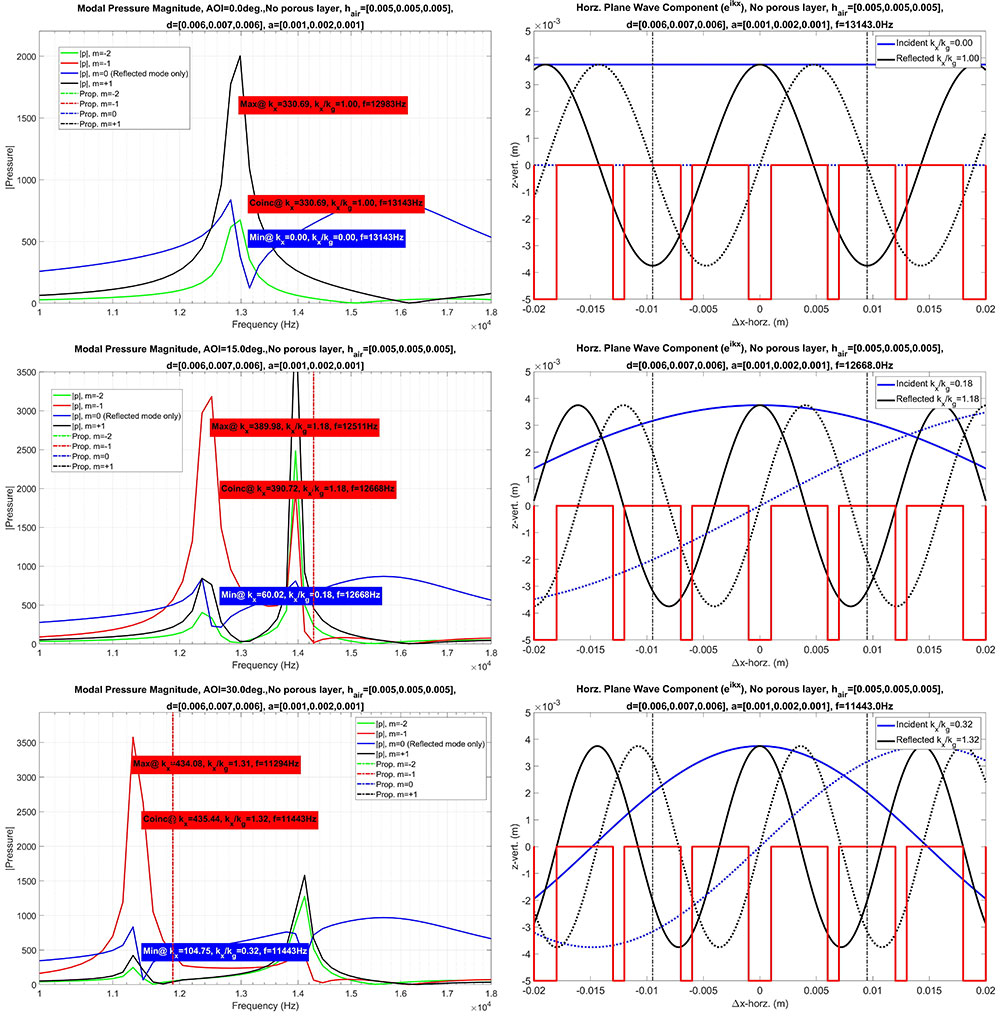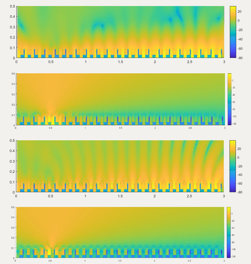 A A A Volume : 44 Part : 2 Proceedings of the Institute of Acoustics Audio-frequency surface waves over multiple width and depth grooves Steve Mellish‡, Faculty of STEM, The Open University, UK Shahram Taherzadeh, Faculty of STEM, The Open University, UK Keith Attenborough, Faculty of STEM, The Open University, UK ABSTRACT Previous studies of airborne surface waves have been carried out at audio-frequencies over periodically rough surfaces formed by lighting lattices and bricks and at ultrasonic frequencies over mm scale compound gratings involving grooves of the same depth but different widths. In this paper, a modal model, which has been found to give comparable predictions to BEM while being much faster to run is used, together with BEM, to investigate audio-frequency sound propagation over grooves of varying widths and depths in the order of cm. Predictions of excess attenuation spectra, pressure contours and zeroes in the effective reflection coefficient over grooves with multiple widths and depths are used to indicate the nature of the surface waves which involve overlapping quarter wavelength resonances. Predictions are extended to multiple depth grooved surfaces without and with porous infills. 1. Introduction Tolstoy [1] suggested a clear distinction between an evanescent surface mode and a true surface wave. The former exists only due to the geometric and boundary conditions imposed at a surface under excitation by an incident source and will not necessarily self sustain once the incident source is removed. An example of this is the evanescent field at the edge of an optical element under total internal reflection. A true surface wave, although excited initially by an incident disturbance, may persist in the absence of an incident field due to resonant properties of the surface itself. This work suggests the extent to which any periodic disturbance near to the surface† may be sustained, is a function of the resonant behaviour of the surface, much akin to the resonant behaviour of tuned circuits in electronics, so the distinction between a surface mode and surface wave is blurred and a matter of degree. In this paper we shall consider surface waves from a theoretical perspective using a modal model for rectangular grooves. Much attention has been given to rectangular gratings due to the ease with which they may be modelled, realised and their readiness to support surface waves. 2. A modal model for predicting the resonance contour of multiple grooved surfaces A modal model was derived by Hessel et al. [2] to investigate blazing of simple rectangularly grooved gratings in the electromagnetic domain and subsequently applied to acoustics with the purpose of investigating surface waves by Kelders and Allard et al. [3, 4]. The authors recently extended the method to predict acoustic point-to-point propagation [5] and then expanded the system of equations to include multiple grooved structures of the form in Figure 1, with or without a porous layer at the base of each groove [6]. The focus of our current research is to continue the work of Kelders et al. using the modal model to predict surface wave (SW) behaviour, but with the application of our extensions to the model to admit more complex structures. The advances in computing power since the pioneering works also allow more involved simulations affording greater insight into the underlying physical processes involved. Figure 1: Multiple grooved periodic surface with porous layers. Given the vertical axis is z, infinite spatial periodicity in the horizontal x-axis and invariance in y is assumed as is an exp(−iωt) time convention. A homogeneous plane wave is incident upon the surface of the grating with angle of incidence (AOI) θ and propagation constant k, propagating in the x-z plane within an ideal inviscid medium. The modal model kernel is briefly described herein with full derivations to be found in [2–6]. The resulting 2d problem may be considered as a domain of two separate half spaces, a free field upper space for z > 0 and the lower groove space where z < 0. Continuity of pressure p and normal particle velocity vz form the boundary conditions at the z = 0 surface. The acoustic field for the upper and lower space reduce respectively to infinite sets of m and n discrete modes, with complex amplitudes (upper space quantities are denoted by hat) and Vn . The and Vn sets are mutually related by an inner product relationship where . The incident wave amplitude is given as initial conditions of the problem along with the geometry of the grating. The modal impedances, relate p to vz for each free-space mode m, where Zc is the characteristic impedance of the medium and the z-axis propagation constant for each m is, and the x-axis projected propagation constant, , is given by the residual, The propagation geometry of each m is defined by θ and the grating pitch d and has the mode function upon z = 0, Considering each groove to behave as an acoustically hard waveguide [7], the corresponding mode function eq,n across the aperture of each groove becomes, where index q denotes the q’th groove within each period from q = 0 to q = K where K + 1 is the number of grooves per grating period d. Truncating the infinite m and n sets and equating them at z = 0 results in the following system of equations, which may be solved numerically as a K (N × N) matrix of the form A ∗ Vn = B, The modal impedance at the mouth of each groove, Zq,n , incorporating a porous layer element to the bottom of each groove is given by, Kelders et al. [3] realised that local minima in det A, relate to inherent resonances of the grating itself in the zeroth-mode x-axis wave function at a particular frequency. Taking, and sweeping as a function of frequency and , provides a resonant response where local poles in the response represent incidences of resonance which are properties of the grating structure itself. This along with the propagation characteristi