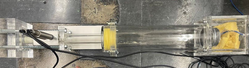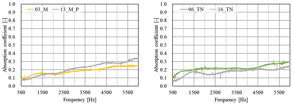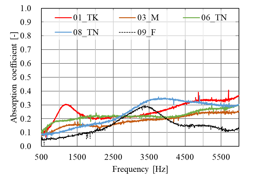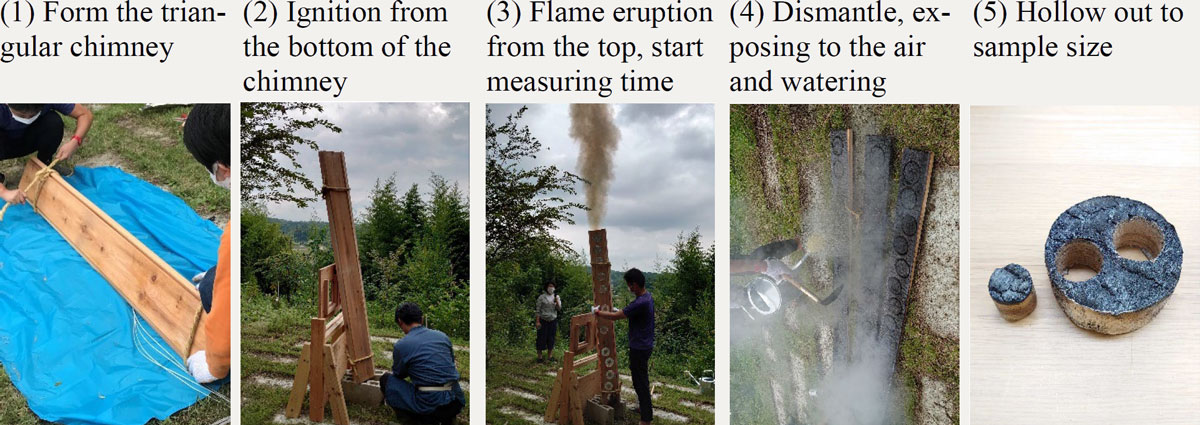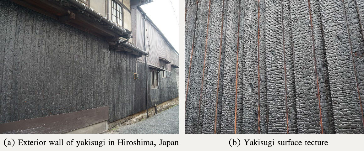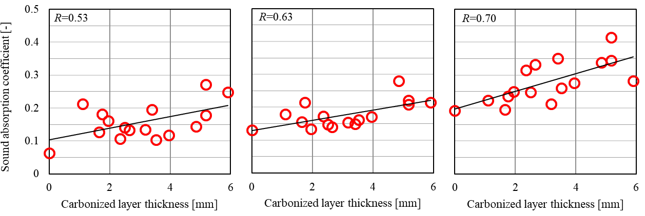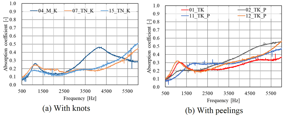 A A A Volume : 44 Part : 2 Proceedings of the Institute of Acoustics A study on normal incident sound absorption characteristics of Japanese traditional cedar board, yakisugi Akiko Sugahara1, Kindai University, Higashiosaka, Japan Kentaro Okamura2, Kindai University, Higashiosaka, Japan Yasuhiro Hiraguri3, Kindai University, Higashiosaka, Japan Noboru Yasui4, Team SAKURA, Tokyo, Japan Chihiro Kaku5, Team SAKURA, Tokyo, Japan ABSTRACT Yakisugi is made by charring the surface of a cedar board to form a thin carbonized layer, which is said to improve durability, weatherability and fire resistance. It is a traditional Japanese exterior material that has become popular overseas due to its performance and visual texture. Recently, it has been attracting attention for its use as an interior material, but its basic performance is still unknown. In this study, we focus on the sound absorption characteristics of yakisugi as one of the investigations to understand its performance as an interior material. The carbonized layer of yakisugi is expected to have sound absorbing performance because of its porous nature. As a basic investigation, the sound absorption characteristics at normal incidence are measured using an impedance tube and compared with the carbonized layer conditions. It is found that yakisugi has sound absorption performance in the high frequency range. Moreover, the characteristics are depending on the thickness and surface properties of the carbonized layer. 1. INTRODUCTION Japan is a country with a large forest area, and there have been many wooden buildings since ancient times. Timber has been used for structural materials, interior and exterior materials, and many other purposes. “Yakisugi” is a traditional exterior material commonly used in Japan, especially in the middle and western parts of the country [1]. This is a Japanese cedar board whose surface is charred to form a thin carbonized layer (see Figure 1). It has been said that the formation of this carbonized layer protects the surface of the cedar board and improves the durability, weatherability, fire and water resistance, and biological resistance to mold and decay fungi. Recently, it has become popular in western countries due to its beautiful texture and appearance. Some researchers showed the possibility of applying the traditional Japanese yakisugi construction method to European building materials, such as pine and oak, and the physical properties of the charred surface as the exterior materials are investigated [2-6]. However, there are few such studies on the physical properties of yakisugi, and much remains to be learned. In addition to the use as exterior materials, demand for interior materials has been increasing in recent years. However, its performance as an interior material has not been well studied and is little understood. In this study, experimental investigations are conducted to determine its potential use as an interior material, especially as sound-absorbing material. The porousness of yakisugi’s carbonized layer may have the sound absorption performance. In this paper, the sound absorption characteristics of yakisugi at normal incidence are investigated using the impedance tube. The effects of various parameters of yakisugi, such as the thickness of the carbonized layer, the charred surface, and the presence or absence of knots and cracks, on the sound absorption coefficient are examined. Section 2 provides an overview of the yakisugi production process and case studies. Section 3 describes experiments using the impedance tube. Finally, Section 4 summarizes this study. Figure 1: Appearance examples of yakisugi 2. MANUFACTURE OF SPECIMENS 2.1. Surface carbonization procedure There are two types of yakisugi production methods: one is the traditional hand-burning method, and the other is machine-burning in a factory. In this study, a traditional hand-burning method called “sankaku-yaki” is used to make samples. The procedure is illustrated in Figure 2. (1) Three cedar boards are assembled and bound with straw rope to form a triangular chimney. (2) Wasted paper placed at the bottom of the chimney is ignited. (3) Then, the board surface is evenly baked due to the chimney effect. (4) When the surface is sufficiently browned, cut off the straw rope and let it cool down by exposing to the air and sprinkling water over it. The burning duration is about 5 minutes at most, depending on the moisture content of the board and the thickness of the carbonized layer. Moreover, when the wood is heated, and the temperature exceeds about 200 ℃, gasification occurs. The combustible gases produced during this process combine with oxygen in the air to cause combustion. This causes a volume reduction, resulting in shrinkage of the material and a distinct pattern of cracks on the carbonized layer. Finally, (5) in order to measure the sound absorption coefficient at normal incidence using a 30 mm-diameter impedance tube, yakisugi board was hollowed out with a hole saw. Note that the 10-cm-diameter circles pre-cut in Figure 2(5) are for use in other experiments and are not relevant to this study. In this study, 170 mm×2,000 mm Japanese cedar boards from Nara are charred using “sankaku yaki.” The thicknesses are approximately 21 mm and 35mm. Although it is common practice to char the sap-side of the board, we prepared samples carbonized on both the sap-side and the heart side to examine the difference in charring surfaces. Because the sound absorption performance of yakisugi is presumed to be highly dependent on the thickness of the carbonized layer, samples with three different carbonized layer thicknesses are prepared; “thin,” “normal,” and “thick.” The charring du ration determines the depth of the carbonized layer. Therefore, the thickness of the carbonized layer “thin,” “normal,” and “thick” are formed by varying the duration from the time the fire blew out from the top of the ch
