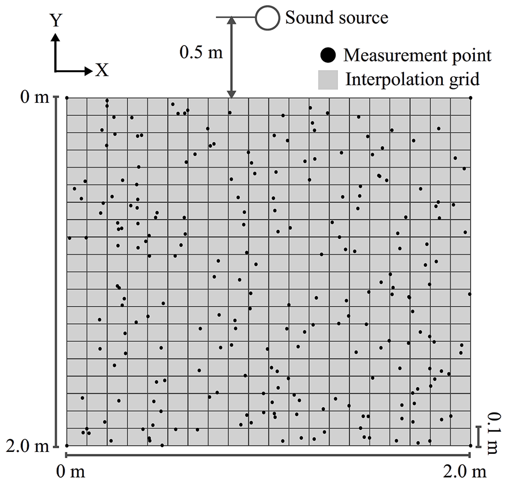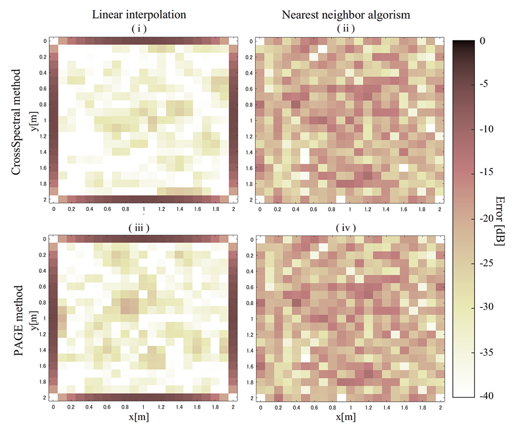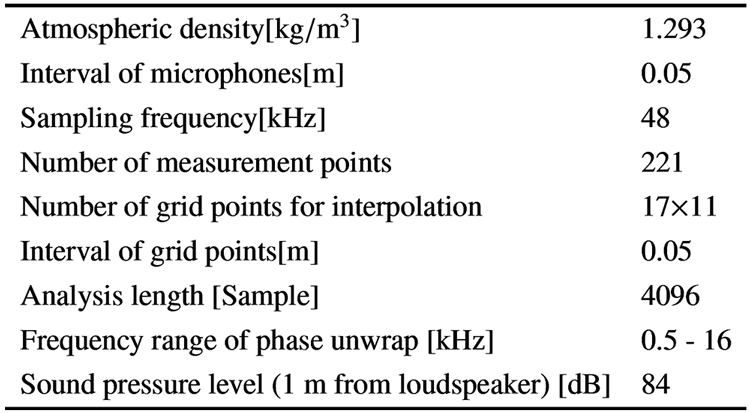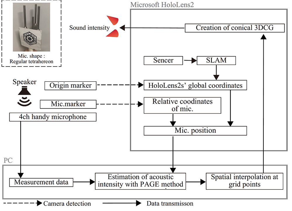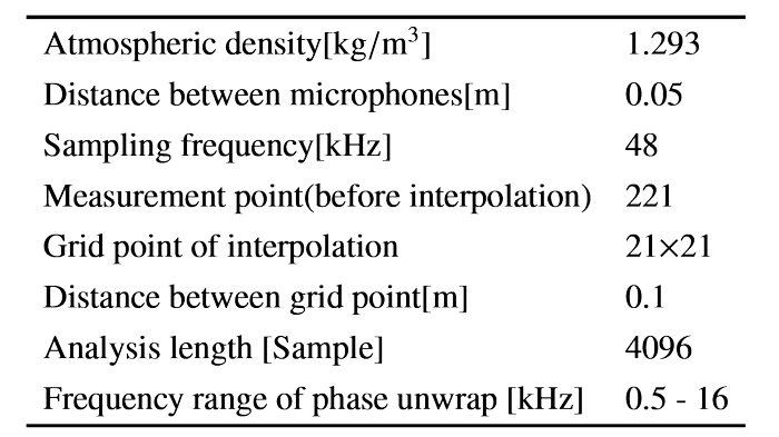 A A A Volume : 44 Part : 2 Proceedings of the Institute of Acoustics Mixed reality visualization system for 3D sound intensity using PAGE method and spatial interpolation Ayame Uchida1, Tokyo Denki University, Tokyo, Japan Yukiko Okawa2, Tokyo Denki University, Tokyo, Japan Yusuke Ikeda3, Tokyo Denki University, Tokyo, Japan Yasuhiro Oikawa4, Waseda University, Tokyo, Japan ABSTRACT In our previous study, we proposed the Mixed Reality visualization system for maps of three dimensional sound intensities measured by a handy 4-ch microphone array. This system had a few shortcomings. The sound intensity was estimated by the cross-spectrum method. Because of this, the estimation errors at higher frequencies become larger owing to the spatial Nyquist frequency determined by the microphone intervals. Another problem is that the clarity of the sound intensity map is degraded because the intervals between the measurement points on the sound intensity map are irregular. In addition, the microphone array was moved manually. In this study, we improved the previous mixed reality system for sound intensity by applying the PAGE method (phase and amplitude gradient estimation), which can accurately estimate sound intensity up to higher frequencies. Furthermore, by using spatial interpolation of an irregularly sampled intensity map, we improved the clarity of the sound intensity map using mixed reality. The proposed system interpolates the sound intensities at equal intervals from those measured at irregular intervals. For evaluation, we conducted visualization experiments on the sound intensities surrounding a single loudspeaker. 1. INTRODUCTION Various sound field visualization methods have been proposed, such as beamforming [1] and acoustic holography [2]. Recently, several methods of data mapping in real space have been proposed for data visualization [3]. Inoue and Kataoka et al. proposed a real-time visualization system of sound intensities using mixed reality (MR) and a handheld microphone array [4, 5]. These systems make it easier to observe sound propagation by scanning a steady sound field with a handheld microphone array and then displaying the measured sound intensity in real space using mixed reality. Furthermore, Watanabe et al. proposed an MR visualization system for room impulse responses (RIR) that estimates sound intensities along the moving path of a microphone array [6]. In previous systems [5], because the sound intensity is estimated using the cross-spectral method [7], the estimation accuracy at higher frequencies is degraded owing to the spatial Nyquist frequency, which corresponds to the interval of microphones. Furthermore, because the sound intensity is measured by a freely moving microphone, the interval between measurement points becomes irregular. In addition, even if we want to visualize the sound propagation on a 2D plane to make the data more visible, it is difficult to measure sound intensities on the same plane. Thus, the sound intensity data is spread irregularly, which reduces the distinguishability of the data. By extending our previous MR visualization system [5], we propose a visualization system to improve the clarity of the sound intensity map by spatially interpolating the sound intensities measured at irregular intervals into equally spaced intervals. Furthermore, to estimate the sound intensity at higher frequencies more accurately, the PAGE method is introduced into the MR visualization system. In the experiments, the sound intensities near the loudspeaker are measured by freely moving the handy microphone array and interpolated at equal intervals on a 2D grid for ease of visualization. 2. SYSTEM OVERVIEW Figure 1 presents an overview of the proposed system. In this system, the user wears a Microsoft Hololens 2, a mixed reality device, and scans the space for the visualization target using a handy 4ch microphone to measure the sound pressure signal. Sound intensity is estimated from the sound pressure signal obtained from the measurement using the method described below and then interpolated to visualize it at equal intervals. The microphone’s measurement position was estimated by combining two AR markers placed at the reference position in the measurement room and attached to the microphone array [5]. The position of the MR headset was continuously estimated by simultaneous localization and mapping (SLAM) using Microsoft HoloLens2 [8]. 3. SPATIAL INTERPOLATION OF SOUND INTENSITIES 3.1. Estimation of sound intensity using PAGE method Tomas et al. proposed the PAGE method [9], which achieves estimation of sound intensity at frequencies higher than the Nyquist frequency determined by the microphone interval. First, based on the least squares method, the phase gradient is estimated as follows: where X denotes the vector of pairwise differences, ri ( i = 1, . . . , N ) denotes the position of the microphone, δ(ϕ) denotes the vector of pairwise phase differences, and pi ( i = 1, . . . , N ) denotes the complex sound pressure. Figure 1: Overview of the proposed system. By using SLAM and AR makers, the measurement of the sound intensity with a 4-ch handy microphone array is stored on a PC with its positional information. For visualization, the stored sound intensities at irregular intervals are spatially interpolated on a grid with regular intervals. Considering the spatial Nyquist frequency due to the microphone interval, the phase gradients are obtained by applying phase unwrapping to each complex pressure. Then, the active intensity Ia , which is the real part of the sound intensity, is estimated from Eq. 1 as follows: where P0 is the amplitude at the center of the microphone array, ω is the angular frequency, and ρ0 is the atmospheric density. 3.2. Spatial interpolation of sound intensity From the measurement data at irregular intervals, data at regular intervals were obtained by spatial interpolation of sound intensities. First, Delaunay triangulation [10