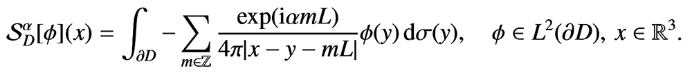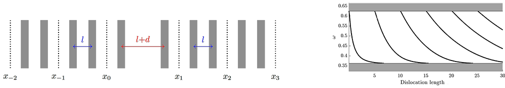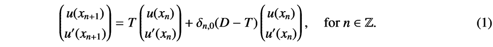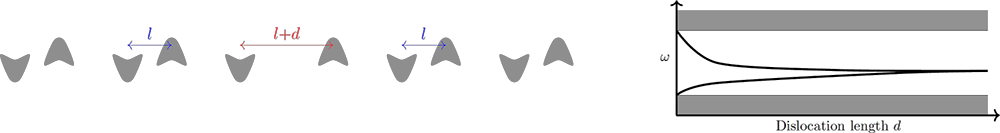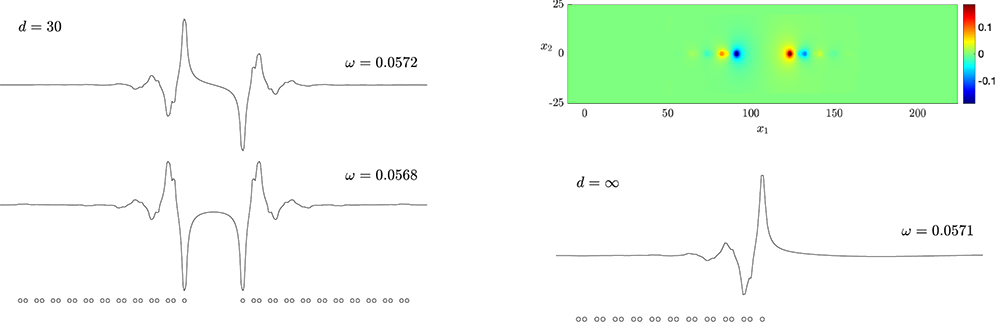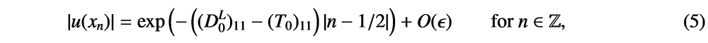 A A A Volume : 44 Part : 2 Proceedings of the Institute of Acoustics Fine tuning topological waveguides using asymptotic analysis Bryn Davies1, Department of Mathematics, Imperial College London, London, UK ABSTRACT We use asymptotic methods to quantify the properties of topological waveguides and show how these concise results can be used very efficiently to design materials with specific, custom specifications. This work presents a general method for studying localised eigenmodes in periodic media with defects. The results of this analysis characterise the existence of localised eigenmodes, determine their eigenfrequencies and quantify the rate at which they decay away from the defect. These results are obtained using both high-frequency homogenisation and transfer matrix analysis, with good agreement between the two methods. This approach is ideally suited to studying problems arising in topological wave physics and we demonstrate its efficacy by studying materials based on the famous Su-Schrieffer-Heeger model. 1. INTRODUCTION A powerful phenomenon in the design of waveguides is the principle that if a perturbation is made to a periodic structure, then there is a tendency for specific frequencies to be strongly localised in a region of that defect. These localised eigenmodes (often known as defect modes) have eigenfrequencies that are within a stop band of the spectrum of the unperturbed periodic structure and typically decay exponentially away from the defect. This phenomenon can be used to build powerful waveguides, capable of guiding waves of specific frequencies both along straight lines and around corners [1,2]. As is true for metamaterials in general, the increasing complexity and sophistication of these waveguides poses an ever greater challenge for computational simulation. In order to be able to fine tune and optimise designs, it is important that we find novel ways to describe the fundamental properties of these materials with minimal computational cost. In this work, we will consider metamaterial versions of the famous Su–Schrieffer–Heeger (SSH) model [3]. This model arose in the study of electron localisation in polyacetylene, which features alternating ‘weak’ and ‘strong’ coupling between adjacent atoms. Since its discovery, the SSH model has been canonised as the simplest periodic structure with non-trivial topology. There have been many subsequent studies in settings including acoustics [4], photonics [5], elastic plates [6] and mechanical systems [7]. The motivation for studying these topological waveguides is that they enjoy enhanced robustness properties compared to other defect modes. We will consider two versions of the SSH model. In both models, we arrange metaatoms in an SSH-type pattern, with short and long separation distances playing the role of the ‘weak’ and ‘strong’ Figure 1: The two SSH-type metamaterials that we will consider in this work. Left: a sequence of lamina, arranged in an SSH-type pattern, which we study using high-frequency homogenisation. Right: an array of three-dimensional bounded material inclusions arranged according to an SSH type pattern in one dimension, which we study under a high-contrast assumption. In both cases, the lengths l and l' are the crucial parameters which describe the materials’ topological wave transmission properties. The materials are periodic with periodicity length L = l + l'. coupling. The first model is a sequence of lamina, arranged in an SSH-type pattern, which can be described by a one-dimensional equation (on the left in Figure 1). We will perform asymptotic analysis in terms of the scale of periodicity, to compute homogenised fields. The second model is an array of three-dimensional bounded material inclusions arranged according to an SSH-type pattern in one dimension (on the right in Figure 1). We will study the three-dimensional differential problem under a high-contrast assumption: we will assume that the density of the material inside the inclusions is much less than that of the background material and perform asymptotic analysis in terms of the material contrast parameter. This approach will yield a concise characterisation of the subwavelength resonant modes of the system, in terms of the eigenstates of the generalized capacitance matrix. In both models, we will create a localised defect mode by introducing a dislocation to the periodic structure. We will see that by varying the size of the dislocation we are able to create localised eigenmodes with any localised frequency within the band gap. In the case of the one-dimensional model, homogenisation will also allow us to estimate the rate at which the localised eigenmode decays away from the defect, in addition to quantifying its resonant frequency. 2. HOMOGENISATION OF A ONE-DIMENSIONAL MODEL We begin by studying the mathematically simpler one-dimensional model. We model the transmission of time-harmonic waves by studying the Helmholtz problem u'' (x) + ω2 c−2(x) u (x) = 0. Here, c is the material shown in Figure 1 which has c = 1 in the background and c , 1 on strips that are arranged according to an SSH-type pattern. We can introduce a defect by dislocating, as shown in Figure 2. Introducing the mesh {xn = 2n : n ∈ ℤ}, as shown in Figure 2, we can define transfer matrices T = T(ω) and D = D(ω) to be such that An important goal of this work is to estimate the rate at which a localised eigenmode decays away from the interface. We can estimate this from (1) based on the eigenvalues of the transfer matrices. We immediately have that u(xn) = O(|λ1|n) as n → ∞, where λ1 is the eigenvalue of T with |λ1| < 1. Similarly, using the symmetry of the material, we can see that u(xn) = O(|λ1|−n) as n → −∞. These estimates provide upper bounds on the exponentially decaying envelope of the localised eigenmode, which are observed to be tight. This is indicated by the circles in Figure 3, for the localised eigenmode that e