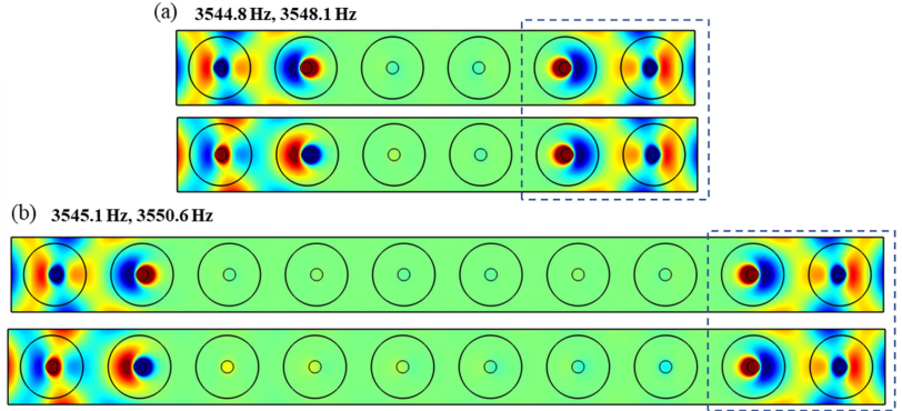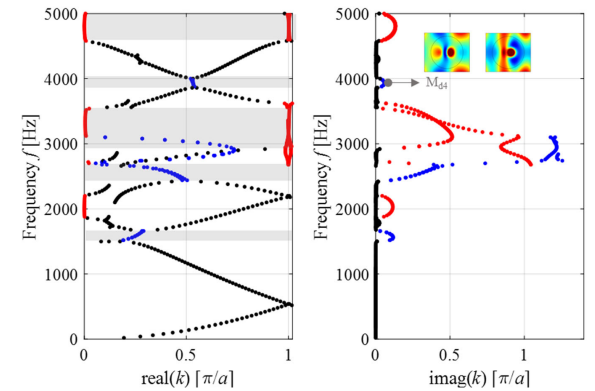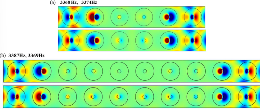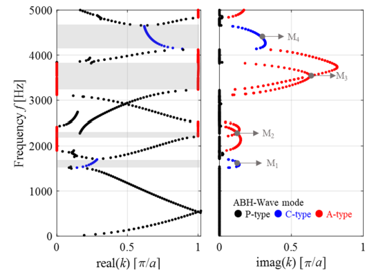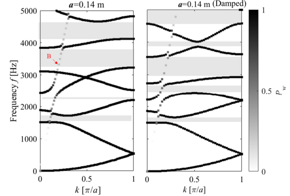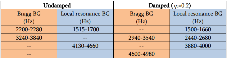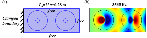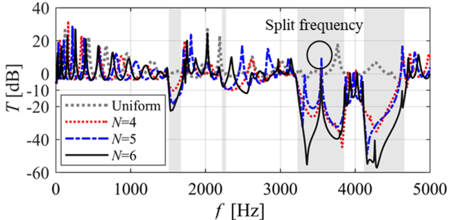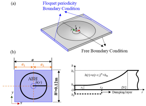 A A A Volume : 44 Part : 2 Resonance mode analysis of finite plate strip with acoustic black holes: the gap between bandgap and attenuation band Bing Han, Hongli Ji1 , Jinhao Qiu State Key Laboratory of Mechanics and Control of Mechanical Structures, Nanjing University of Aeronautics and Astronautics Yudao Street 29, Nanjing 210016 , China Li Cheng Department of Mechanical Engineering, Hong Kong Polytechnic University Hung Hom, Kowloon 999077, Hong Kong, China ABSTRACT Acoustic Black Hole (ABH) lattice structures show promise for achieving broadband bandgap in lightweight design. Existing ABH lattice research usually assumes that the bandgaps of infinite periodic structure are roughly the same as the attenuation band with strong energy attenuation in the finite counterpart. This work is concerned with comparison of the real attenuation bandwidth of finite ABH periodic structures and the bandgap of the infinite counterpart. The plate strips consisting of different numbers of periodic ABH elements are considered in the scenarios with and without additional damping layer. It is observed that the bandgap-predicted attenuation band is split into two narrow attenuation bands, so that the periodic ABHs fails to ensure a broadband and continuous attenuation in the finite scenarios. Results show that there are resonance modes of finite plate strips with ABHs falling into the bandgap due to the boundary reflection and would result in high transmission peaks within the bandgap-predicted attenuation band. This unexpected phenomenon suggests the gap between the attenuation bandwidth of finite periodic structure and the bandgap of the corresponding infinite one. Analysis suggests that the resonance mode of finite plate strips, which reduces the bandgap-predicted attenuation bandwidth, can be predicted and tuned by changing the structure details. 1. INTRODUCTION In recent years, Acoustic black hole (ABH) structures have attracted increasing attention, which, through effective wave manipulation, enable broadband vibration and noise control applications [1- 6]. By tailoring the structural thickness to a power-law variation profile, the ABH acts as a wave trapper to entail a gradual reduction of the phase velocity of flexural waves. As the effect of single ABH is limited by the so-called cut-on frequency [2, 7], efforts were made to extend the effective range of ABH to lower frequencies by proposing ABH lattice structures, just as the well-known phononic crystals (PCs) and acoustic metamaterials (AMMs)[8, 9]. ABH lattice structure was first proposed in one-dimensional (1D) beam structure for bandgap (BG) generation[7, 10]. Subsequently, various 1D ABH configurations, including folded beams [11], composite ABH beam and annular ABHs[5], have been proposed and also investigated numerically and experimentally for improving BG performance, especially for widening BG. Moreover, ABHs were embedded into two- dimensional (2D) plates for the same purpose with the consideration of overall structural stiffness [12]. PCs and AMMs commonly realistic structures in practice only contain a limited number of unit cells, contrary to the infinite lattice traditionally used for BG prediction. The corresponding band in the finite lattice offering strong energy attenuation is referred to as attenuation band (AB)[13]. Existing literature has always shown that the two bands, BG and AB, are roughly the same. This offers a very convenient mean for structural design based on BG analysis. In practice, however, the dynamic behavior of the finite structure is influenced by their dimension and the boundary condition. It is inevitable that there exist some resonance modes within the predicted BG range, which impairs the AB performance [14]. The previous researches also showed that these resonance modes can be altered by disturbing the structure details. However, the mechanism behind, which would help to find suitable solutions for eliminating this barrier, remains obscure. Motivated by this, the aim of this work is twofold: (i) to uncover the gap between the AB in a finite 2D ABH lattice and the BG of the infinite counterpart; (ii) to investigate the underlying mechanism. Moreover, considering the general strategy for maximizing the ABH effect by adding a damping layer in the ABH indentation, this work is carried out in both the pure ABH design and the damped one. 2. BAND SRUCTURE OF ONE-DIMENSIONAL PERIODIC ABHs The irreducible unit cell of the considered infinite periodic ABH plate strip is shown in Fig. 1. In the one-dimensional scenario, the Bloch-Floquet boundary conditions are imposed at the pair of boundaries perpendicular to the x -axis, as marked in Fig. 1(a). In this work, each periodic cell contains an ABH indentation with diameter D =0.1 m along the central line of the strip. Taking the center of the ABH as the origin of the local coordination, the thickness variation along the radial direction of the ABH is defined by h( r ), expressed in Fig.1(b), with a minimum thickness hm of 0.5 mm and power exponent m =2. By default, the center of the ABH satisfies the parameter relationship a1 = a2 to construct a symmetric unit cell. The uniform part of the plate strip is 5.18mm thick. The plate is made of aluminum with a mass density of 2820 kg/m3, Poisson ratio of 0.33 and Young modulus of 71GPa. As the ideal ABH effect is unrealistic, the dissipation materials are usually combined with ABH design for practical application[15-17]. Therefore, with lattice constant a =0.14 m, the damped ABH unit cell is also investigated, apart from the pure ABH unit cell. As illustrated in Fig. 1(b), a free damping layer is bonded to the back center area of ABH indentation with thickness hd =0.5 mm and radius rd = 0.025 m. The damping material is with a mass density of 1780 kg/m3, Poisson ratio of 0.45 and Young modulus of 0.1 GPa. The complex modulus E = E(1+i ηd ) is utilized for introducing a damping effect with ηd =0.2. Figure 1: (a) Band struct