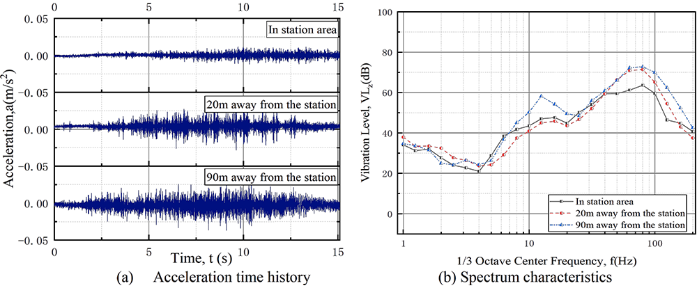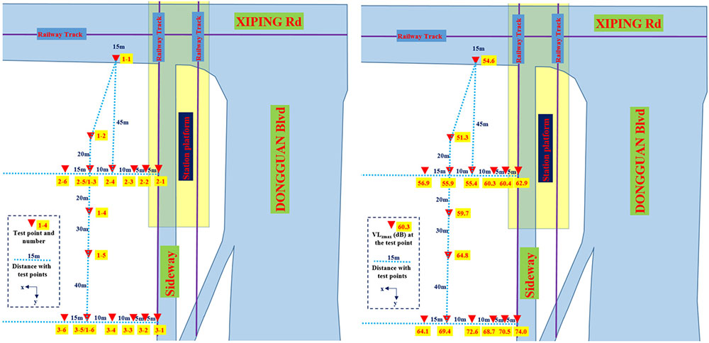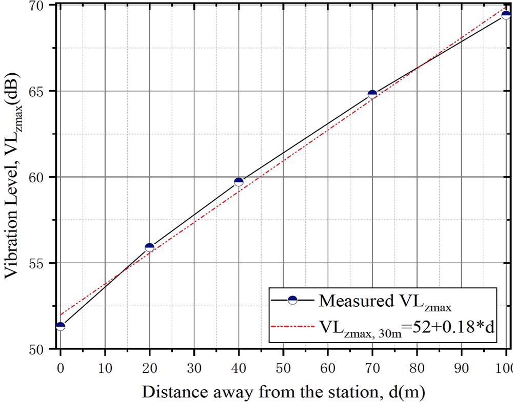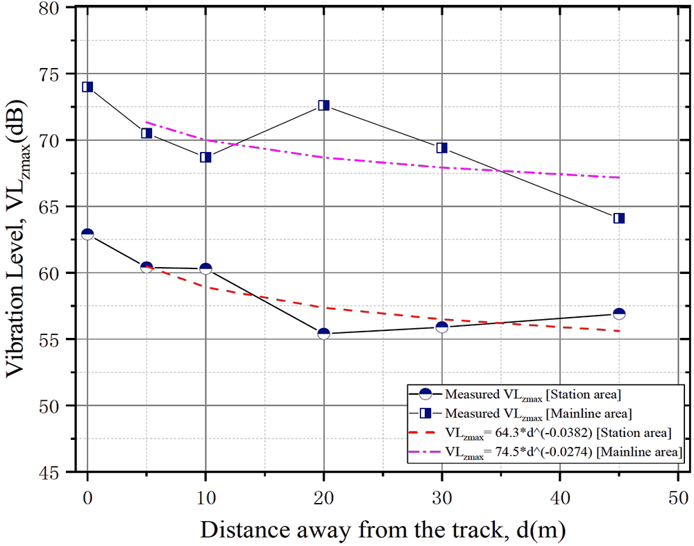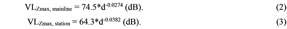 A A A Volume : 44 Part : 2 Proceedings of the Institute of Acoustics The time-frequency characteristics analysis and prediction of ground vibration near a subway station Bideng Liu1, Beijing Academy of Science and Technology, Beijing, P. R. China Yubin Wu, Beijing Academy of Science and Technology, Beijing, P. R. China Ruixiang Song, Beijing Academy of Science and Technology, Beijing, P. R. China Lei He, Beijing Academy of Science and Technology, Beijing, P. R. China Qiong Wu, Beijing Academy of Science and Technology, Beijing, P. R. China ABSTRACT This paper presents the time-frequency characteristics of ground vibrations near subway stations through field tests and analyses. More than 15 ground vibration measurement points are set up in the longitudinal and transverse directions of the track near a subway station. Overall, the ground vibration level (VLzmax) above the tunnel is approximately 73 dB on the border between the station and mainline, while it attenuates to 63 dB away from the tunnel by approximately 30 meters; the dominant frequency in the mainline area is approximately 63-80 Hz. The results in the longitudinal direction show that the ground vibration increases rapidly as the train drives away from the station because of the train speed growing, and VLzmax is less than 10 dB between the station and near the mainline areas, while the dominant frequency in the mainline area is higher than that in the station area. The attenuation rate of the ground vibration in the transverse direction for the mainline area is faster than that for the station area. The power distribution law y=A*x-α can describe the vibration attenuation characteristics, and its "peak and long tail effect" and "scale-free characteristics" can predict the vibration at any position by measuring two specified locations. 1. INTRODUCTION The speed of transit-oriented development (TOD) in metropolitan areas in China is becoming increasingly faster and significant for the following reasons: (1) With the deepening of the urbanization process, the need for increasing efficiency for traffic and growing intolerance to congestion by the huge number of private cars in core cities is increasing; (2) With the promotion of the integrated construction of metropolitan areas, the construction land available for development in central cities is becoming increasingly scarce. City blocks developed according to the TOD concept have become popular, such as in Hong Kong, Tokyo, Copenhagen, Guangzhou, Chongqing, Dongguan and Shenzhen [1], because of more possibilities brought by efficient transportation and open urban spaces, such as vertical urban design. There is little research on the assessment of environmental vibrations induced by subways near the station. However, vibration evaluation in the station area is of great significance to the application of TOD in metropolises in China. Researchers in England [2], Switzerland [3], Japan [4] and China [5] report that excessive environmental vibration is harmful to human beings. The vibration characteristics induced by railway operation in station areas are different from those in mainline areas because of the traveling speeds and accelerating or deceleration of trains, the type of tunnel structures, different wheel-rail systems, complex track line conditions and track bed systems. In this research, the ground environment vibration near a subway station, while the tunnel is buried approximately 15 meters below the ground and the Type-5B-Train was operated in the tunnel, was measured through a high-precision vibration sensing network. The analysis results of the maximum Z vibration level (VLzmax) [6] and 1/3 Octave spectrum of multiple observation points show that the vibration increased rapidly with the train departures, and the vibration attenuated rapidly as the locations moved away from the tunnels. The power distribution law y=A*x-α can describe the ground vibration attenuation characteristics with the distance from the track, while the linear fitting equation y=B+C*x can predict the ground vibration level with the distance from the station. 2. METHODOLOGY The methodology for this research was reported in this part, such as instrument specifications, the sensor arrangement in the field testing for environmental vibration measurement, and the performance assessment criteria. 2.1 Experimental setup and instrumentation Ground vibration measurement locations were categorized as (1) perpendicular to the track direction, which was defined as transverse (x), and (2) parallel to the track direction, which was defined as longitudinal (y). Twelve train induced measurement sites with two profiles in the transverse (x) direction were selected to consider the different ground vibrations with different distances away from the track, which are in the mainline and station areas. Another 4 measurement sites in the longitudinal (y) direction were selected to consider the different ground vibrations with different distances away from the station. Figure 1 (a) shows the measurement sites setup in plan view, which contains a transverse direction profile in the station area (2-1, 2-2, 2-3, 2-4, 2-5, 2-6), in the mainline area (3-1, 3-2, 3-3, 3-4, 3-5, 3-6), and a longitudinal direction profile along the track (1-1, 1-2, 1-3, 1-4, 1-5, 1-6). The distance in the transverse direction of the mainline area and station area is approximately 90 meters. Sixteen accelerometers were positioned on the ground at same time, which glued on the brick or concrete or on the artificial steel platform, as shown in Figure 2. In the field test, a sensing system composed of several B&K 8344 accelerometers and 3 INV3062 DAQ, which has a 160 dB dynamic range, was used. Measurements were made at a sampling rate of 1024 Hz. Table 1 shows the specifications of the accelerometer used in the field tests. Figure 1: Sketch map of the measurement locations (Plan view) and VLzmax at each location. Figure 2: Accelerometers setup on the 