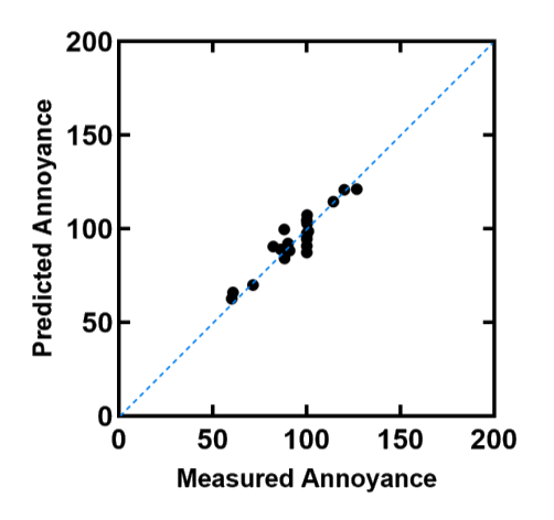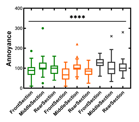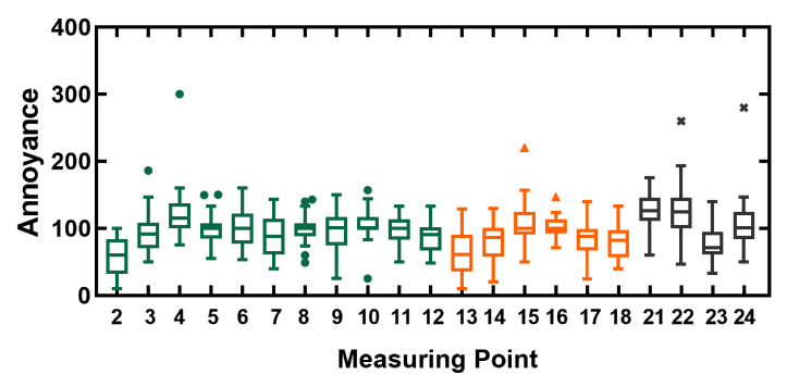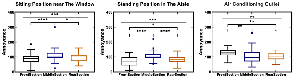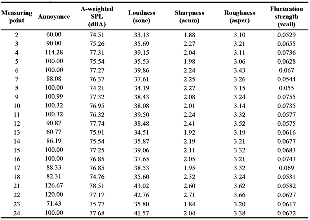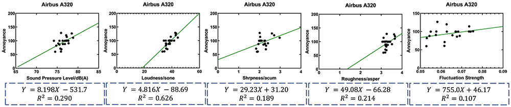 A A A Volume : 44 Part : 2 Proceedings of the Institute of Acoustics Subjective evaluation of the acoustic annoyance in a large passenger aircraft cabin Bingcong Lv, Shanghai Jiao Tong University, Shanghai, China Yu Huang1, Shanghai Jiao Tong University, Shanghai, China Weikang Jiang, Shanghai Jiao Tong University, Shanghai, China ABSTRACT People demand better acoustic comfort for higher travelling quality and security in aircraft. It is necessary to evaluate and predict the subjective annoyance caused by the noise in aircraft cabins. This study investigates the noise-induced annoyance in a large passenger aircraft. We recorded the noise at 21 positions in the aircraft cabin without passengers and selected 21 stimuli during the cruising. Each stimulus has a duration of 5 seconds and a sound pressure level in the range of 72–81dB(A). The psychoacoustic parameters such as loudness, sharpness, roughness, and fluctuation strength were also calculated. Twenty-four subjects evaluated the subjective annoyance of the stimuli by the absolute magnitude estimation method. Results showed the noise annoyance at the middle section of the cabin is significantly higher than that in the front or rear section. The principal component analysis and correlation analysis found that annoyance is mainly affected by loudness, sharpness, and roughness and is dominated by loudness. We proposed a multiple linear regression model between the subjective magnitudes of annoyance and the psychoacoustic parameters to evaluate and predict the noise annoyance in the aircraft cabin well. Keywords: Noise annoyance, Aircraft cabin noise, Psychoacoustic parameters, Sound quality, Noise evaluate 1. INTRODUCTION Acoustic comfort, as the perceived state of well-being and satisfaction with the acoustic conditions in an environment, has attracted more and more attention in the aerospace industry [1-3]. Noise significantly impacts subjective annoyance and increases the awareness of swollen feet, headache, and tiredness, whereas good acoustic comfort diminishes fatigue of the journey, and improves the safety and performance of all occupants [4]. It is essential to investigate, estimate, and design acoustic comfort in large passenger aircraft cabins. There are comprehensive studies on acoustic comfort, including rating noise-induced annoyance with a strong positive correlation with discomfort, unpleasantness, disgust, and disturbance [5, 6]. The sound quality metrics (SQMs), e.g. loudness, sharpness, roughness, and fluctuation strength can accurately represent subjective responses to different sound features [7] and work as psychoacoustic indices for establishing annoyance models, e.g. [7-13]. A few studies have been concerned about comfort related to noise in the aircraft cabin. Quehl has found increasing loudness, roughness, fluctuation strength, and vibration magnitude would reduce comfort in the aircraft cabin [5]. Both noise level and exposure duration would greatly influence the annoyance [4][14]. Pennig et al. have found the comfort sensation was dominated by sound pressure level (SPL) and significantly affected by the frequency characteristics determined by seat positions in the aircraft cabin (front, middle, rear) [15]. The noise annoyance and its influential factors are complex. Studying the noise annoyance and SQMs may provide a better understanding of subjective responses to noise, and better means to establish quantitative comfort models based on SQMs in the aircraft. This article intends to investigate annoyance caused by noise in a large passenger aircraft cabin during its cruise through a subjective evaluation experiment. The primary purpose is to quantify the subjective annoyance at different positions of the aircraft cabin by the SQMs. Two main hypotheses are proposed: (1) the annoyance differs significantly among different positions of the cabin; (2) the annoyance significantly increased with increasing loudness. 2. METHODS 2.1. Apparatus The experiment was conducted in the semi-anechoic chamber. The stimuli were played via headphones (Sennheiser HD600, Germany) driven by a digital to analogue converter (RME ADI-2 DAC, Germany) connected to a laptop (Xiaomi Notebook Pro 15, China). The MATLAB (version R2020a) performed as the playing software. The subjects sat on a chair with the headphones in the chamber. The connection diagram of the experiment set-up and the scene during the experiment are shown in Figure 1. Figure 1: The scene of the set-up when calibrating the stimuli (left), and the connection diagram of the experiment set-up and the scene during the experiment (right). 2.2. Stimuli We recorded noise during a flight of a narrow-body large passenger aeroplane with two jet engines. It was 37.6m long, 11.76m high, 35.8m wingspan, 3.70m cabin width and with a passenger capacity of 150 to 186. The positions of all the measuring points are shown in Figure 1. There were 21 measuring points in the front, middle, and rear sections of the aircraft cabin, as indexed as No 2 ~22 in Figure 2. The microphones of No.2 ~ No.12 were located at the seat headrest with a height of about 1.2m; No.13 ~No.18 at the aisle, with a height of about 1.7m from the floor; No.21 ~ No.24 at about 10cm far from the Air conditioning outlet. All stimuli of this experiment were recorded during the cruising flight. During the recording, the seats back were upright, and the pressurization and air conditioning systems were in regular operation. We selected 5-s segments from each of 21 noise samples as test stimuli. The stimuli had no voice (e.g. speaking, broadcasting) or sudden abnormal sound (e.g. door opening sound). We calibrated all stimuli via headphones (HD600, Sennheiser, Germany) on a dummy head (HMS IV, Head Acoustics, Germany) to ensure they had the same A-weighted SPLs as the recording samples. Figure 2: The measuring points at the front, middle and rear sections of the aircraft cabin. 2.3. Subjects Twenty-four healthy subjects, 12 ma