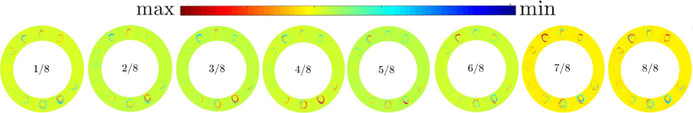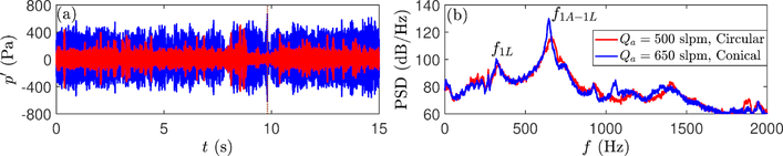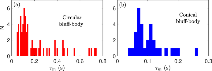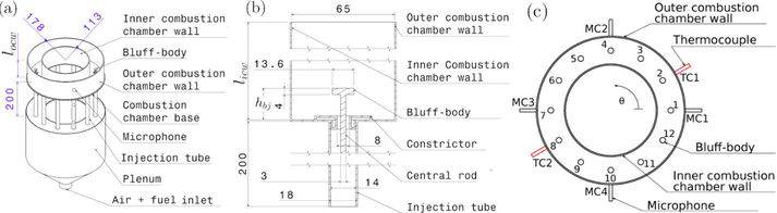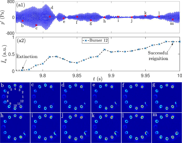 A A A Volume : 44 Part : 2 Nonlinear characterization of azimuthal combustion instability exhibi- ting flame transient phenomena Balasundaram Mohan 1 and Sathesh Mariappan 2 Department of Aerospace Engineering Indian Institute of Technology Kanpur Uttar Pradesh – 208016, IndiaABSTRACT This article characterizes the nonlinear features observed in an annular combustor exhibiting self-excited azimuthal thermoacoustic instability. The annular combustor consists of 12 burn- ers with flames stabilized by bluff bodies protruding into the combustion chamber. This burner configuration closely resembles the flame stabilization geometry and flame shape in ramjet and afterburner configurations. As a first step, two different bluff bodies stabilize the flame: 1) cir- cular and 2) conical, and their associated instability dynamics are characterized. The combus- tor exhibit intermittent oscillations in pressure with dominant 1A-1L (first azimuthal – first longitudinal) acoustic mode at about 650 Hz. The duration of periodic oscillation in the pressure fluctuations varies non-monotonically with the airflow rate. Further, a relatively large ampli- tude pressure fluctuations are observed for intermediate values of airflow rate in both the flame stabilization. During these large-amplitude pressure fluctuations, localized flame extinction in certain burners is observed, leading to partial blow-off operation of the combustor. The flame extinction is subsequently followed by either successful or unsuccessful reignition, leading to an introduction of slow time scale large-amplitude heat release modulation in the problem. Fur- ther, the slow time scale heat release modulation is stochastic, leading to intermittent oscillation in pressure.1. INTRODUCTIONModern gas turbine engines operating with lean premixed prevaporized (LPP) combustion to reduce pollutant emission exhibits thermoacoustic instability for a particular operation envelope [1]. In ad- dition, the fuel-flexible operation, i.e., adding hydrogen with the existing fuels to minimize pollutant emission without significant modification to the combustor is detrimental. Especially, beyond a cer- tain percentage of hydrogen blending gives rise to thermoacoustic instability, flame stabilization in the upstream flow manifolds resulting in burnout of engine components and significant changes in the local heat release distributions are encountered [2]. For specific engine operating conditions, ther- moacoustic instability exhibits transient flame behavior such as flame flashback, extinction, near blow-off and reignition, which induces premature engine and component failures leading to compro- mise on engine performance. In this article, we examine the flame transient phenomena. In particular successful reignition event encountered in annular combustors while exhibiting self-excited thermo- acoustic instability. Further, we show that the large amplitude heat release oscillation associated with1 mbala.kotti@gmail.com2 sathesh@iitk.ac.inworm 2022 this reignition introduces stochastic slow time to the thermoacoustic system. This stochastic slow time scale in turn manifests intermittent oscillation in pressure.Azimuthal thermoacoustic instability in academic combustors was scrutinized in the recent past due to its practical relevance in modern gas turbine engines. For instance, the instability characteris- tics, modal dynamics, nonlinear saturation mechanism, and light around processes were examined in the annular combustor. The continuous transition between spinning and standing wave modes was observed by Worth and Dawson [3]. Symmetric and antisymmetric heat release distributions were observed in standing wave mode at the pressure node and antinode, respectively [4]. For spinning mode, the non-uniform heat release distribution was found in the annulus with a peak in heat release spinning at instability frequency. The spin ratio and quaternion ansatz were used to characterize the modal dynamics [5]. In addition to the spinning and standing wave modes, a slanted mode was ob- served in the MICCA combustor characterized by the presence of an antinode and a node in the annulus [6]. In the same combustor with liquid fuel and swirl burner, bursting oscillations in pressure was observed with local extinction of flames located in the vicinity of velocity antinode [7].The majority of the experimental investigations available in the literature focused on the swirl stabilized flames relevant to practical gas turbine engines. However, fewer investigations were re- ported with matrix [6] and bluff-body stabilized flames without swirl. Nevertheless, as far as the authors' knowledge is concerned, most of the previous investigations have one similarity, i.e., the flames originate from the flush-mounted (to the base of combustion chamber) flame holders. In the present investigation, the flame holders protrude into the combustion chamber and offset from the combustion chamber base plate. Therefore, the flame base is inside the combustion chamber. Such a flame stabilization mechanism, i.e., the flame stabilization using bluff bodies in the flow path, finds application in ramjet and afterburner combustor configurations. Since the flame base is inside the combustion chamber, we expect an increased flame front distortion along the azimuthal direction caused by azimuthal pressure fluctuations. Hence, the flame dynamics analogous to that of a single burner truncated V-flame [8] are anticipated depending on the location of individual burners relative to the azimuthal pressure mode shape. Further in [8], the authors have shown that the flame is sensi- tive to forcing amplitude; even a low amplitude pressure fluctuation causes flame extinction. A sim- ilar localized flame extinction is observed in the present study, followed by a successful reignition leading to distributed slow time scale.The rest of this article is structured as follows. In section 2, the experimental setup and data acq