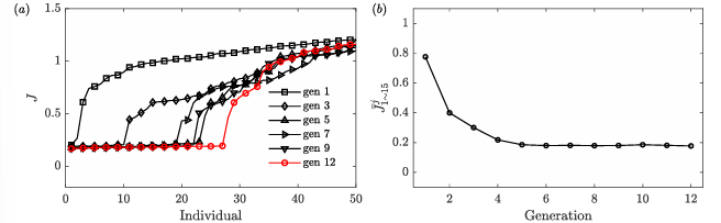 A A A Volume : 44 Part : 2 Suppression of quasiperiodic thermoacoustic oscillations via genetic programming Bo Yin1 The Hong Kong University of Science and Technology Clear Water Bay, Hong Kong Yu Guan2 The Hong Kong University of Science and Technology Clear Water Bay, Hong Kong Stephane Redonnet3 The Hong Kong University of Science and Technology Clear Water Bay, Hong Kong Vikrant Gupta4 Southern University of Science and Technology Shenzhen, Guangdong Province, China Larry K.B. Li5 The Hong Kong University of Science and Technology Clear Water Bay, Hong Kong ABSTRACT We use genetic programming (GP) to discover data-driven control laws for the suppression of qua- siperiodic oscillations in a prototypical thermoacoustic system. We rank the control laws based on a predefined cost function that accounts for the pressure amplitude and the actuation effort. We then breed subsequent generations of control laws via a tournament process. We find that GP closed-loop control is more effective than GP open-loop control and conventional periodic forcing, producing a similarly high degree of amplitude suppression but with the lowest actuation effort. We also find that GP closed-loop control can identify unforeseen actuation mechanisms, providing new insight into the physical coupling between the heat release rate and pressure fields. 1. INTRODUCTION Most control strategies used in thermoacoustics are designed around fixed-point or period-1 states [1, 2, 3]. However, aperiodic oscillations can arise as well [4-7]. In the context of controlling aperi- odic thermoacoustic oscillations, Kashinath et al . [8] have numerically examined the forced synchronization of a two dimensional slot-stabilized laminar premixed flame undergoing quasiperiodic and chaotic motion. They found a variety of complex nonlinear phenomena such as phase locking and asynchronous quenching. On the experimental front, Guan et al . [9] have examined the effect of periodic acoustic forcing on quasiperiodic thermoacoustic oscillations via open-loop mapping. They found that the thermoacoustic amplitude can be reduced significantly via asynchronous quenching. In the present study, we use genetic programming (GP) [10] to weaken two frequency quasiperiodic thermoacoustic oscillations in a laminar premixed combustor. GP is a data-driven framework capable of discovering closed-loop control laws without access to a system model [11]. It has been successfully used to manipulate a mixing layer [12, 13, 14], to modify the recirculation zone behind a backward-facing step [15], to control flow separation in a turbulent boundary layer [16], to reduce drag on a car model and rotating cylinders [17, 18] and to optimize mixing in a turbulent jet [19, 20]. In our experiments, we apply GP in closed-loop form to weaken two-frequency quasiperiodic ther- moacoustic oscillations in a laminar premixed combustor. 2. GP CONTROL FRAMEWORK The GP control framework consists of three main steps: (i) initializing a generation of control laws, called individuals, (ii) evaluating the generation, and (iii) breeding subsequent generations [11]. The control laws are represented as syntax trees, their input signal is provided by a probe microphone, and their output signal is used to actuate a loudspeaker. To evaluate the performance of each individ- ual and to benchmark it against other control strategies, we define a cost function 𝐽=(𝑆)𝑇𝑒 + 𝜉(|𝑏′|)𝑇𝑒 , where the operator (∙)𝑇𝑒 denotes time averaging over the evaluation time 𝑇𝑒 , 𝑆 ≡ |𝑝′|/|𝑝’∗| is the instantaneous amplitude of the pressure oscillations in the controlled system normalized by that in the uncontrolled system, and 𝑏 ′ is the voltage fluctuation into the loudspeaker. A penalization co-efficient 𝜉 determines the trade-off between amplitude reduction and actuation cost [11, 15]. The in- dividuals in the first generation are initialized randomly based on pre-defined functions and operators (e.g. + , − , × , /, sin, cos, exp and log). Filter functions are used to avoid control laws that are mathe- matically invalid or potentially damaging to the actuator. After an entire generation has been evalu- ated, all its individuals are ranked by their cost function values. The top-performing individuals, called elitism individuals, are then passed directly to the next generation. The remaining individuals in the next generation are bred via genetic operations such as replication, crossover and mutation (figure 1). Here replication involves direct forwarding of selected individuals, crossover involves the exchange of random branches of two individuals, and mutation involves the replacement of random branches of selected individuals. Crossover and mutation can facilitate exploitation and exploration of the search pool, improving genetic diversity and search efficiency. We repeat this breeding process until the average cost function value of the top performing individuals no longer varies significantly from one generation to the next. We then take the individual with the lowest cost function value from the elitism individuals as the optimal control law. Figure 1: Genetic operations (replication, mutation, and crossover) of the GP algorithm. The individ- uals are represented as syntax trees. In the example shown, the mathematical expression of the indi- vidual undergoing replication is 𝑏= sin(𝑥)+ cos (exp (𝑥)× (1 + 𝑥) , where 𝑥 is the input to the control law. The branches selected for mutation and crossover are in red and green, respectively. 3. RESULTS AND DISCUSSION 3.1. Convergence of the GP algorithm The GP convergence history is shown in figure 2. Figure 2(a) shows the sorted cost function values of the individuals. Only six out of twelve generations are shown here to highlight the key trends. As the number of generations increases, more and more individuals achieve the minimum cost function value. This indicates that the GP algorithm