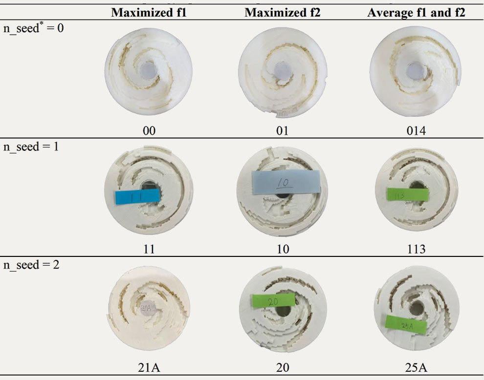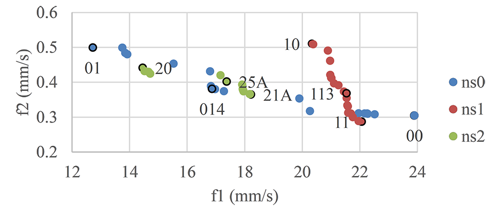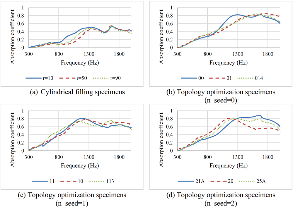 A A A Volume : 44 Part : 2 Proceedings of the Institute of Acoustics Development of ventilation and sound-absorbing materials using specimens generated by the multi-objective optimization method Bach Lien Trieu1, Shimane University, Matsue City, Shimane Prefecture, Japan Keigo Kajitani2, Shimane University, Matsue City, Shimane Prefecture, Japan Kiichiro Sawada3, Shimane University, Matsue City, Shimane Prefecture, Japan Thu Lan Nguyen4, Shimane University, Matsue City, Shimane Prefecture, Japan ABSTRACT In hot and humid tropical countries, the houses are designed to be naturally ventilated with vent louvers. However, these louvers play as direct paths for noise entering the house. It is necessary to create geometries that can maximize the noise transmission loss and the ventilation performance of the housing structure. This study aims to develop ventilation and sound-absorbing material that can be 3D printed and installed on the upper part of the buildings' windows. The multi-objective optimization method was applied to generate 3D model specimens based on fluid potential flow analysis. To examine the absorption coefficient of the cylindrical specimens made of ABS filament with different filling rates manufactured by the 3D printer, the experiments were conducted in an anechoic chamber using an impedance tube that can measure the absorption coefficient in a frequency range of 300 to 2000 Hz. It was found that the sound absorption coefficient was little affected by the filling rate of ABS filament and improved effectively at a high-frequency range when adopting the optimized spiral structure. The improvement of sound absorption coefficient at frequency of about 800 Hz and the performance of multiple-structural material will be further considered in the next study phase. 1. INTRODUCTION Noise has been considered one of the most severe environmental pollutions that affect the quality of life and human health. Architectural solutions to minimize this impact by designing soundproof structures for houses have been targeted in many studies in the architectural field. Recently, many excellent sound-absorbing materials have been researched and proposed. However, performances other than sound absorption, especially ventilation performance, have not been studied much. Moreover, when the design is too focused on one specific function, it may not satisfy another aspect. For example, live houses have been equipped with thick iron doors and sound-absorbing materials but very few ventilation facilities. In this case, the soundproof function takes precedence over the ventilation function. As a result, many live houses were found not sufficiently ventilated, and indoor air was polluted by cigarette dust [1]. Ventilation and sound absorption performances are in a trade-off relationship [2]. Specifically, to improve ventilation performance, it is necessary to make innumerable holes through which air can pass. On the other hand, it is required to fill the gap to improve the sound absorption performance. This conflict makes it challenging to achieve both aspects simultaneously. This study aims to develop new materials that allow air ventilation but prevent sound from passing through. These design can help control the sound propagation through the ventilation equipment and increase the overall ventilation capacity. In this study, multi-objective optimization was performed to generate a model that satisfies both sound absorption and ventilation requirements in a cylindrical shape. Then, the impedance tube experiment was conducted in an anechoic chamber to investigate the sound absorption performance of all the specimens. 2. METHODS 2.1. The multi-objective Optimization and Formulations The multi-objective optimization method to generate a cylindrical 3D model based on fluid potential flow analysis was applied to manufacture the test specimens by using a Python program. The program is written using the external libraries Platypus and NSGAⅡ. The model comprises 47x23x11 elements with 13536 nodes (Figure 1). It has a diameter of 105 mm, and a thickness of 20 mm. The red nodes in this model are "tangent points," and the area surrounded by the 8 points is called an "element." The objective function was set for clarifying whether the element pattern exists or not to satisfy the condition for all the elements. Figure 1: The cylindrical 3D model In this study, the following f1 and f2 were used as objective functions: Here, Nm is the number of all the air elements and vMi is the velocity magnitude in i-th air element. Here, Nb is the number of all the bottom air elements and vBi is velocity magnitude in i-th bottom air element. The velocity magnitude in the above equations can be obtained from fluid potential flow analysis by finite element method (FEM) software LISA 8.0. In terms of Laplace's equation, a potential flow is an idealized fluid flow. Irrotational, incompressible, inviscid flow is required. The velocity potential, used in this analysis type, has one degree of freedom. Velocity is equivalent to a gradient in the velocity potential field that occurs when heat or electricity is flowing [6]. Function f1 was set based on the hypothesis that the larger magnitude of the overall flow velocity will allow a better sound absorption function. In other words, the more complicated the propagation path is created inside the specimens, the higher the sound absorption coefficient can be achieved. Function f2 is the flow velocity that exits from the bottom, indicating the ventilation performance magnitude. The topology pattern was represented with the following function: te, re, he : Element order in the rotation direction, radial direction, height direction mt : Number of elements in the rotation direction (47 in this calculation example) mr : Number of radial elements (23 in this calculation example) mh : Number of elements in the height direction (11 in this example) i : Imaginary unit au,v,w, bu,v,w :Design variables 