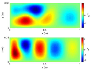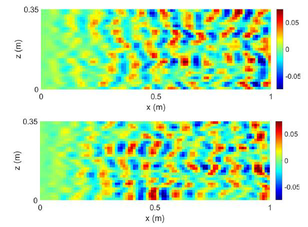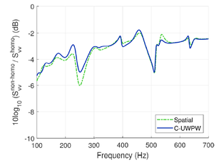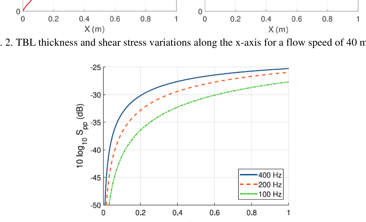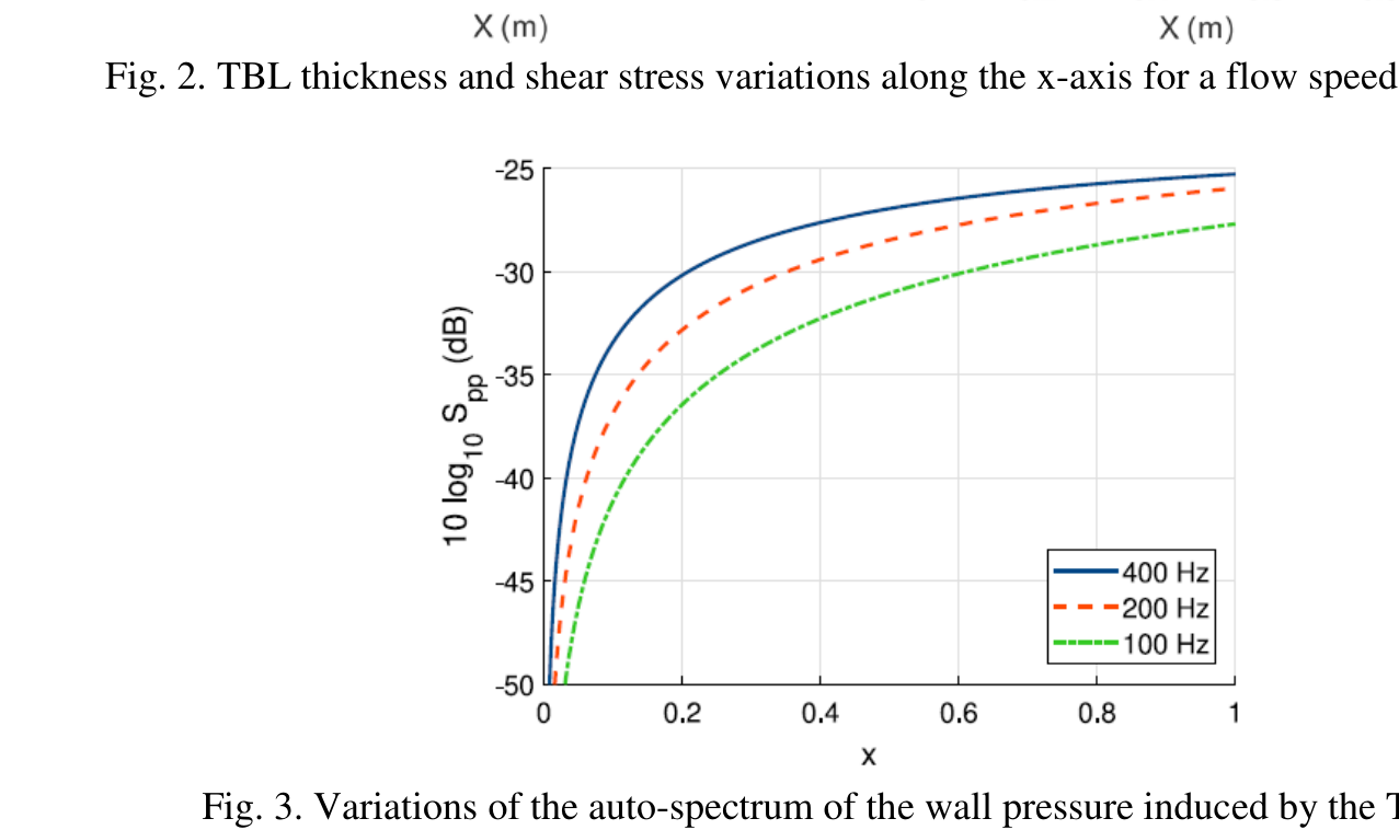 A A A Volume : 44 Part : 2 Vibroacoustic simulations with non-homogeneous TBL excitations:Synthesis of wall pressure fields with the Continuously-varyingUncorrelated Wall Plane Waves approach Corentin Guillon INSA Lyon LVA, 69621 Villeurbanne – France Emmanuel Redon INSA Lyon LVA, 69621 Villeurbanne – FranceLaurent Maxit INSA Lyon LVA, 69621 Villeurbanne – FranceABSTRACTIn this paper, a numerical method is presented to predict the vibroacoustic response of a vibrating structure excited by a spatially inhomogeneous turbulent boundary layer. It is based on the synthesis of different realizations of random pressure fluctuations that can be introduced as loadings of a vibro- acoustic model (such as a finite element model). The vibro-acoustic response is finally deduced by averaging the responses for the different loads. To generate the pressure fluctuations of the non-ho- mogeneous turbulent boundary layer, the Uncorrelated Wall Plane Wave (UWPW) approach used so far for homogeneous boundary layers is extended. On a first step, this extension is based on a decom- position of the excited surface into sub-areas and on the averaged parameters of the boundary layer on each sub-area. In a second step, it consists in considering the interaction between the sub-areas and a refinement of the sub-area decomposition. This leads to the Continuously-varying Uncorrelated Wall Plane Waves (C-UWPW) approach. The accuracy of the proposed approach is investigated on a rectangular panel of variable thickness and excited by a growing turbulent boundary layer triggered at one edge of the plate. Comparisons with the spatial approach, usually used but with very long computation times, are presented. The interests of the proposed approach in terms of accuracy and computation time are discussed. An illustration of the proposed approach to predict the radiated noise from a blade immersed in a water flow will be proposed during the oral presentation.1. INTRODUCTIONVibrations induced by the wall pressure under a turbulent boundary layer is a major concern in the design of vehicles. Such vibrations cause structure wear and are a source of disturbing interior noise. Predicting the vibroacoustic behaviour of structures excited by a turbulent flow is an important issue for improving vehicle longevity and passenger comfort.worm 2022 Most of the literature dealing with the vibratory response of structures excited by turbulent boundary layer (TBL) consider a spatially homogeneous excitation as in [1-7] for plate cases and [8, 9] for cylindrical shell cases. However, many industrial applications show vibrating structures underneath a growing TBL or with curved surfaces for which the pressure loading can no longer be considered homogeneous spatially. Few attentions have been carried out to this topic whereas the influence of an inhomogeneous TBL cannot be negligible on the vibroacoustic behaviour of the structure. This has been have recently highlighted by the present authors on a rectangular plate with a variable thick- ness and excited by a TBL triggered at the upstream edge of the plate [10]. In this context, this article aims to propose an efficient and versatile process for predicting the vibratory response of a structure excited by a non-homogeneous TBL. This process relies on an extension of the Uncorrelated Wall Plane Waves (UWPW) method developed some year ago for homogeneous TBL [11] and validated against others numerical results and experimental results in [12-13]. It consists in the synthesis of different realizations of the TBL wall pressure field considering the spatial variations of the TBL parameters. These realizations can then be easily used as loadings of any vibroacoustic model. The theoretical developments of this extension have been recently presented in [14]. We describe and illustrate the different steps of this process in the present paper. The accuracy of the proposed ap- proach is investigated on a rectangular panel of variable thickness and excited by a growing turbulent boundary layer triggered at one edge of the plate. Comparisons with the spatial approach are pro- posed. The interests of the proposed approach in terms of accuracy and computation time are dis- cussed.2. THE CONTINUOUSLY-VARYING UNCORRELATED WALL PLANE WAVES (C- UWPW) METHODLet us illustrate the application of the C-UWPW approach [14] on a rectangular panel excited by a growing turbulent boundary layer triggered at one edge of the plate as shown in Fig. 1. The plate thickness is linearly varying in the stream-wise direction to stress the effect of the spatial evolution of the TBL.. Fig. 1. Plate excited by a growing turbulent boundary layer triggered at the leading edge The TBL is assumed triggered by a strip of sandpaper at the plate edge x =0 m. For this academic case, the TBL parameters are estimated with an analytical model for a flat smooth plate [15]. This model for 2-D incompressible flow supposes a zero pressure gradient and external velocity constant and equal to the free stream velocity. The laminar and transitional regions are neglected. For more complex geometries, computational fluid dynamics simulations can be used to estimate the TBL pa- rameters at the surface of the vibrating structure. Figure 2 illustrates the TBL parameters obtained with the analytical model and for a flow speed of 40 m/s.worm 2022 X(m)Fig. 2. TBL thickness and shear stress variations along the x-axis for a flow speed of 40 m/s.02 04 08 X(m)Fig. 3. Variations of the auto-spectrum of the wall pressure induced by the TBL.Results of the Goody model using the TBL parameters of Fig. 2.( ) X pp , k The cross-spectrum density of the wall pressure field (WPF) induced by the TBL, should( ) , k then be estimated at any point X on the plate area in the wavenumber-frequency space . To dothat, the Goody model [16] and the Mellen model [17] are considered to define, respectively, the autospectrum and the normalized cross-spectrum density of the wall pres