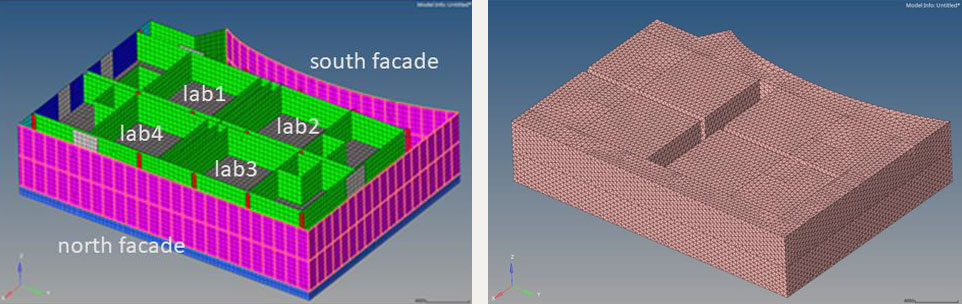 A A A Volume : 44 Part : 2 Proceedings of the Institute of Acoustics Prediction methodology and assessment of low frequency noise break in for a science building Christos Karatsovis1, ISVR Consulting, University of Southampton, Southampton, UK Erika Quaranta2, ISVR Consulting, University of Southampton, Southampton, UK ABSTRACT More often than not the effects of anthropogenic (or man-made) noise are evident in all facets of the built environment: from residences and offices through to state-of-the-art research and development facilities. Often, external ambient noise can penetrate the fabric of these buildings and adversely affect, for instance, human symbiosis on a socio-political level or mar the outcome of research in R&D facilities. The principles of acoustic design of buildings are mainly limited to a specific frequency range, i.e. within the standard sonic range, and usually do not account for the effect of lower frequency noise, such as sound in the less audible range. It is in the remit of this work to outline a method of estimating the impact of lower frequency noise on a building housing particularly sensitive scientific tools. An analytical model of the excitation mechanism of the external building fabric will therefore be outlined and used in tandem with a structural/acoustical numerical model of a science building in order to predict the low frequency acoustic levels within the laboratories. A set of measured noise data in the actual laboratories will also lend a level of support to the described method of predictions. 1. INTRODUCTION Human perception of low frequency sound is often associated with the lower end of the full frequency spectrum of hearing from 20 to 20,000 Hz. Sound below 20 Hz is typically described as infrasound and not considered as being a part of human perceptibility on the grounds that is inaudible. That being said, humans can still perceive infrasound and that itself reflects clear differences in hearing thresholds and sensitivities amongst different individuals[1]. The hearing thresholds are indeed rather variable between individuals depending on their genetics, prior noise exposure and age. Infrasound at adequately high levels is also clearly audible [2], while body vibrations can be triggered following high-levels of low frequency noise [3]. Additionally, the upper limit of low frequency is not firmly determined in the literature; it could either be 250 Hz [1] or 100 Hz [4] for instance, depending on the context and application. Regardless, it is documented robustly that anthropogenic noise sources associated with infrastructure, such as road, railway and aircraft, which can all be sources of low frequency noise, can have an effect on the health and wellbeing of individuals [5]. Low frequency noise effects can cover impairment on performance and cognition, communication and psychosocial issues, sleep disturbance, mental health and physiological impacts (endocrine and cardiovascular effects, etc.) [1]. One of the main metrics of human perception and annoyance uses a time-integrated sound pressure level with the A-weighting frequency network, which accurately emulates the perceived auditory sensitivity of the ear at low to medium noise levels, while placing less emphasis on the low frequencies. However, some studies have considered the use of the G-weighting, which can be used to determine human annoyance due to infrasound for sounds below 20 Hz. The latter network was standardised with ISO 7196 and is used by some countries [6]. Moving away from the topic of human perceptibility, there lies the low frequency sensitivity of tools (or instrumentation) found in science buildings and laboratory settings. It is well known that state-of-the-art science facilities housing equipment require as little influence as possible from sources of vibration, such as low-frequency footfall from people walking within the building, mechanical plant, transportation noise in the near and far vicinity, and so forth. Vibration-sensitive experimental work may involve the use of lasers, super-cooled magnets, various analytical instruments, such as Scanning Tunnelling Microscopes (STMs) and Atomic Force Microscopes (AFMs). Most of these sensitive processes require a high-level of imaging resolution and normally are housed in areas which are as far away as possible from the influence of vibration [7]. It therefore is often the case that highly sensitive instrumentation is mounted directly on top of a special table with a stiff honeycomb core plate to maximise dynamic rigidity, while the stiff plate is in turn supported on pneumatic isolators for dynamic decoupling from the rest of the building and external vibration influences. The same design principle applies in the case of large, high-tonnage, monolithic concrete keel blocks supported on air springs with very low natural frequencies. These design principles have raised the issue of whether acoustics forces could adversely affect the performance of such vibration mitigation measures; for instance, the excitation of acoustic modes in a laboratory room by infrasound and the potential efficient coupling of the room modes with a pneumatically supported large inertia concrete block [8]. Furthermore, and regardless of the impact on the vibration isolation of a sensitive tool, low frequency noise can also have a direct effect on the tool itself. In particular, the operation of Scanning Electron Microscopes (SEMs) or Transmission Electron Microscopes (TEMs) can be affected by low frequency noise in the room, since the tool’s operating resolution or magnification factor is a function of its sensitivity to various factors. For this reason, generic noise criteria curves, also known as NCTs, have been devised for such tools, which may go well below (as low as the 4 Hz octave band centre frequency) the typical NR or NC curves used in standard noise control design [9]. For instance, the NR curves used for standard acoustic design in buildi