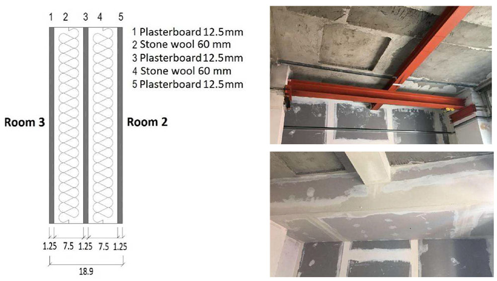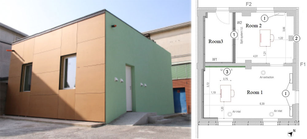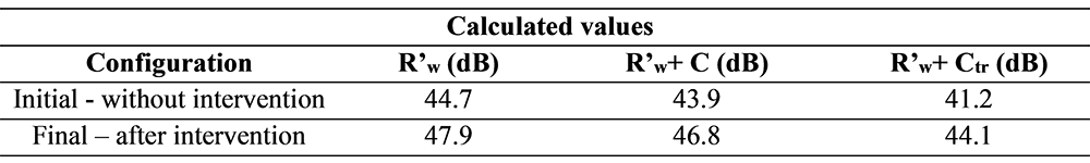 A A A Volume : 44 Part : 2 Proceedings of the Institute of Acoustics Objective and subjective analysis of the acoustic performance of a ZEB test-building Chiara Scrosati1, ITC-CNR, San Giuliano Milanese, Italy Michele Depalma, ITC-CNR, San Giuliano Milanese, Italy Fabio Scamoni, ITC-CNR, San Giuliano Milanese, Italy Ludovico Danza, ITC-CNR, San Giuliano Milanese, Italy ABSTRACT The paper describes an experimental campaign, including both objective and subjective analysis, carried out in a Zero-Energy full-scale test building and aiming at analyzing the acoustic performance of the construction and the acoustic comfort of the rooms. The objective analysis consists of sound insulation measurements of facades and partitions, noise level measurements of service equipment and environmental noise level monitoring. The subjective analysis is based on a survey carried out on 100 participants to collect the answers about their evaluation of the acoustic quality in two different test rooms. The outcomes of the questionnaire data show participants evaluation of Acoustic Quality as a not annoying environment. 1. INTRODUCTION The reduction of carbon emissions and the consumption of energy resources due to the construction sector can only be achieved with the full implementation of the concept of Zero-Energy buildings (ZEB). The reported work is part of the research project “I-ZEB – Towards Intelligent Zero-Energy Buildings for a smart city growth” supported by Lombardy Region and the National Research Council of Italy (CNR). Within the research project, the technological solutions are implemented with a global and integrated assessment of the energy and environmental building performance in order to provide a support system for the construction sector aimed at the definition and optimization of innovative materials, components and systems. This system could also fulfil the increasingly stringent performance requirements imposed by Standards and Regulations in force [1]. The ZEB (Zero-Energy Building) Laboratory acts as a demonstrator for energy-environmental analyses aimed at evaluating the performance in real conditions of the envelope components and technological plant solutions, as well as the validation of models and monitoring tools and the control and management of the Internal Environmental Quality of the building (IEQ) [2] and its interactions with the external environment. 2. THE ZEB LABORATORY The ZEB Laboratory (Fig. 1), designed and built at ITC, the Construction Technologies Institute of the CNR, in Milan, is the result of the refurbishment of an existing building that has achieved the requirements of Zero-Energy Building due to the envelope and plants components performance improvement and the integration with Renewable Energy Sources. Internally, the laboratory consists of 3 separate rooms: the two largest ones Room 1 and 2 (Fig. 1), naturally lit, are monitored and dedicated to the experimentations while the smallest one Room 3 (Fig. 1) is a service space suitable for the installation and control of technological plants. Figure 1: Left: The ZEB Laboratory. Right: the objects of acoustic evaluations are indicated: 1) partition wall, 2) ETICS, 3) living wall, I) heat recovery systems. 3. ACOUSTIC ISSUES CASE STUDIES The experimental campaign in the ZEB laboratory evaluated the acoustic performance of the building structures and systems as well as the acoustic comfort in the test rooms, in an IEQ view [2]. The acoustic quantities that can be evaluated in the ZEB laboratory include airborne sound insulation [3], façade sound insulation [4], impact noise, HVAC (Heating Ventilation and Air Conditioning) plant noise, reverberation time [5] and the internal and external noise levels. 2.1. Internal partition wall The wall configuration under study was characterized on-site, in a situation that presented many issues related to flanking transmissions. In fact, due to the existing structures inside the building before the implementation of the I-ZEB laboratory, some elements between Room 2 and Room 3 (Fig.1) could be important acoustic bridges in the transmission of noise from one side to the other of the wall under evaluation. In order to minimize the flanking transmissions, modifications were made to the lateral elements, step by step. At each step, the measurement of the sound transmission loss was repeated until the highest possible value was reached. The wall under study (Fig. 2) is a multilayered lightweight partition [3] consisting of three plasterboard layers with two cavities filled with double density stone wool rigid panels with nominal thickness of 60 mm and nominal average density of 70 kg/m3. A longitudinal steel beam passes across the ceiling from Room 2 to Room 3 and a transverse steel beam crosses the ceiling of Room 2 leaning on two steel beam shoes fixed on the side wall of Room 2 (Fig. 2 top Right). In order to minimize the effect of the acoustic bridges, subsequent interventions were made on the different elements; in particular, a suspended ceiling consisting of plasterboard panels and double density stone wool panels was installed to enclose the steel beams (Fig. 2 bottom Right). Figure 2: Left side: the lightweight wall under study. Right side: the steel beams on the ceiling of Room 2 before (top) and after (bottom) the interventions [3]. Figure 3 shows the initial and final apparent sound reduction index as a function of frequency and the related single numbers. The uncertainty is estimated by using the reproducibility standard deviation obtained in a Round Robin Test of field measurements on a similar lightweight partition [6]. Starting from the laboratory measurements (Rw = 66.2 ± 2.4 dB) of exactly the same partition wall, the on-site acoustic insulation performance was also estimated by using the calculation model defined in standard ISO 12354-1:2017. The results are indicated in Table 1 [3]. Figure 3: On-site measurement results: initial (black line) and final